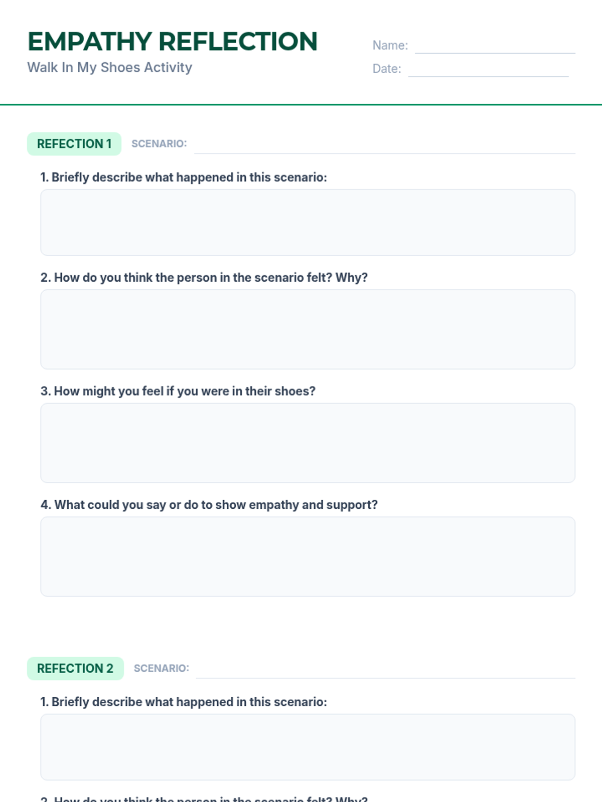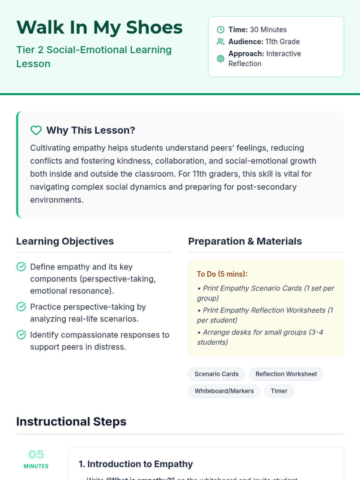 A 30-minute Tier 2 SEL lesson for 11th graders focused on defining empathy and practicing perspective-taking through real-life scenarios.