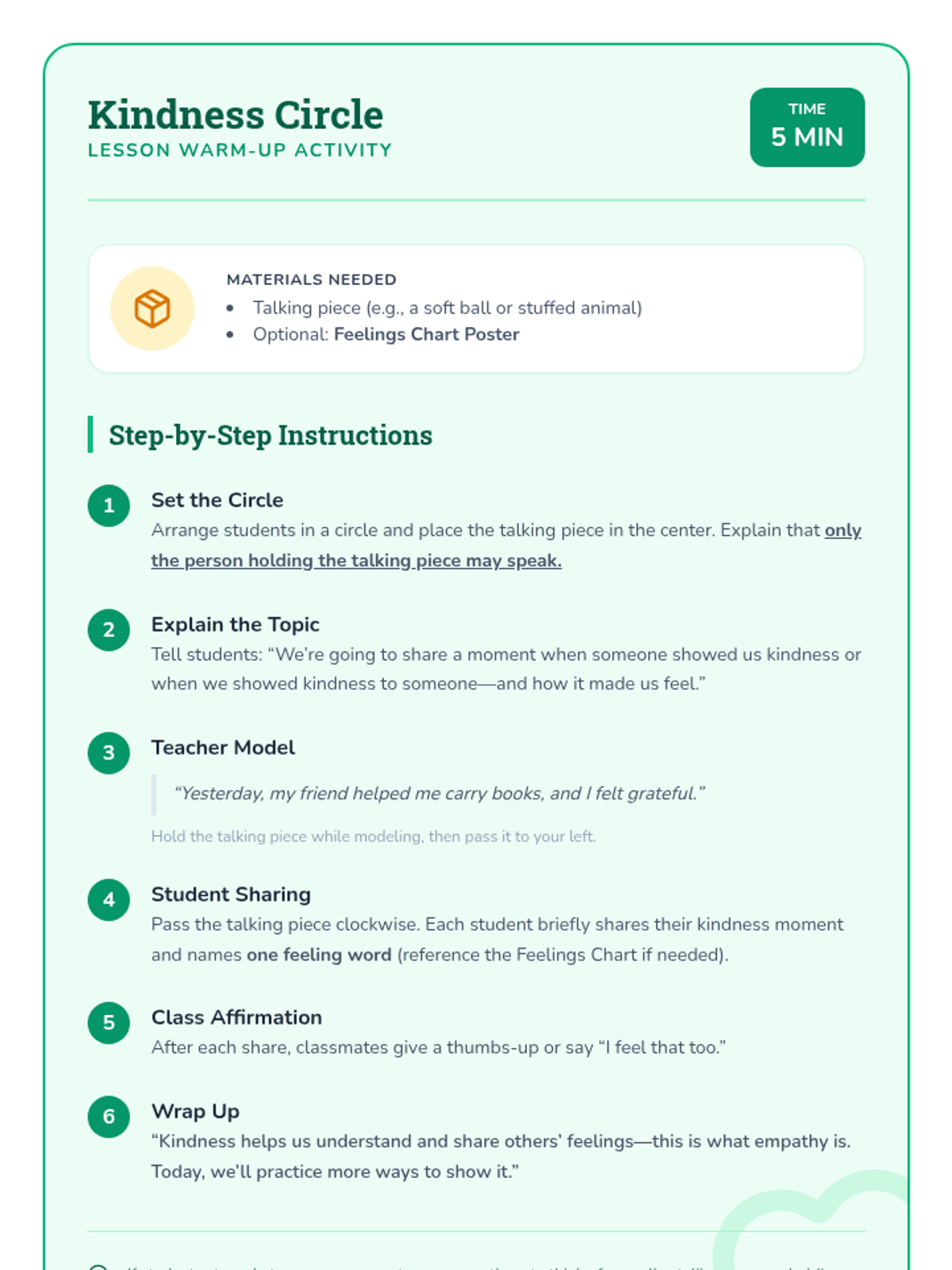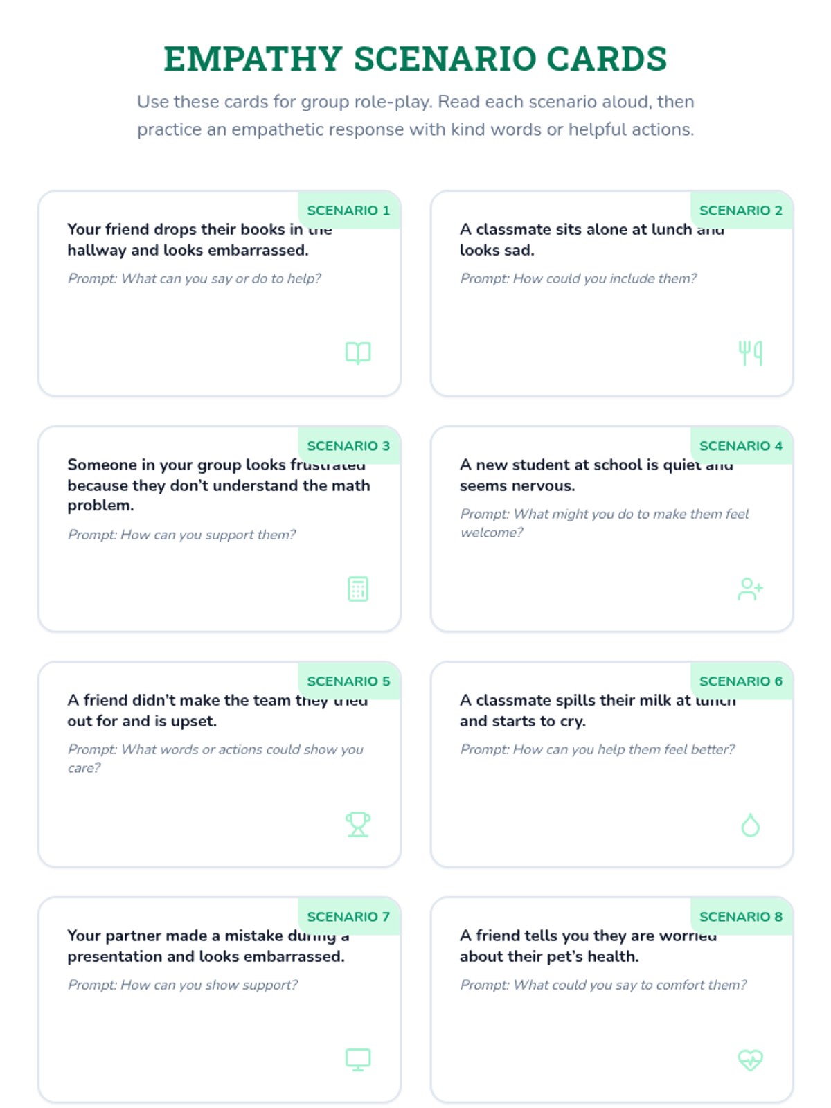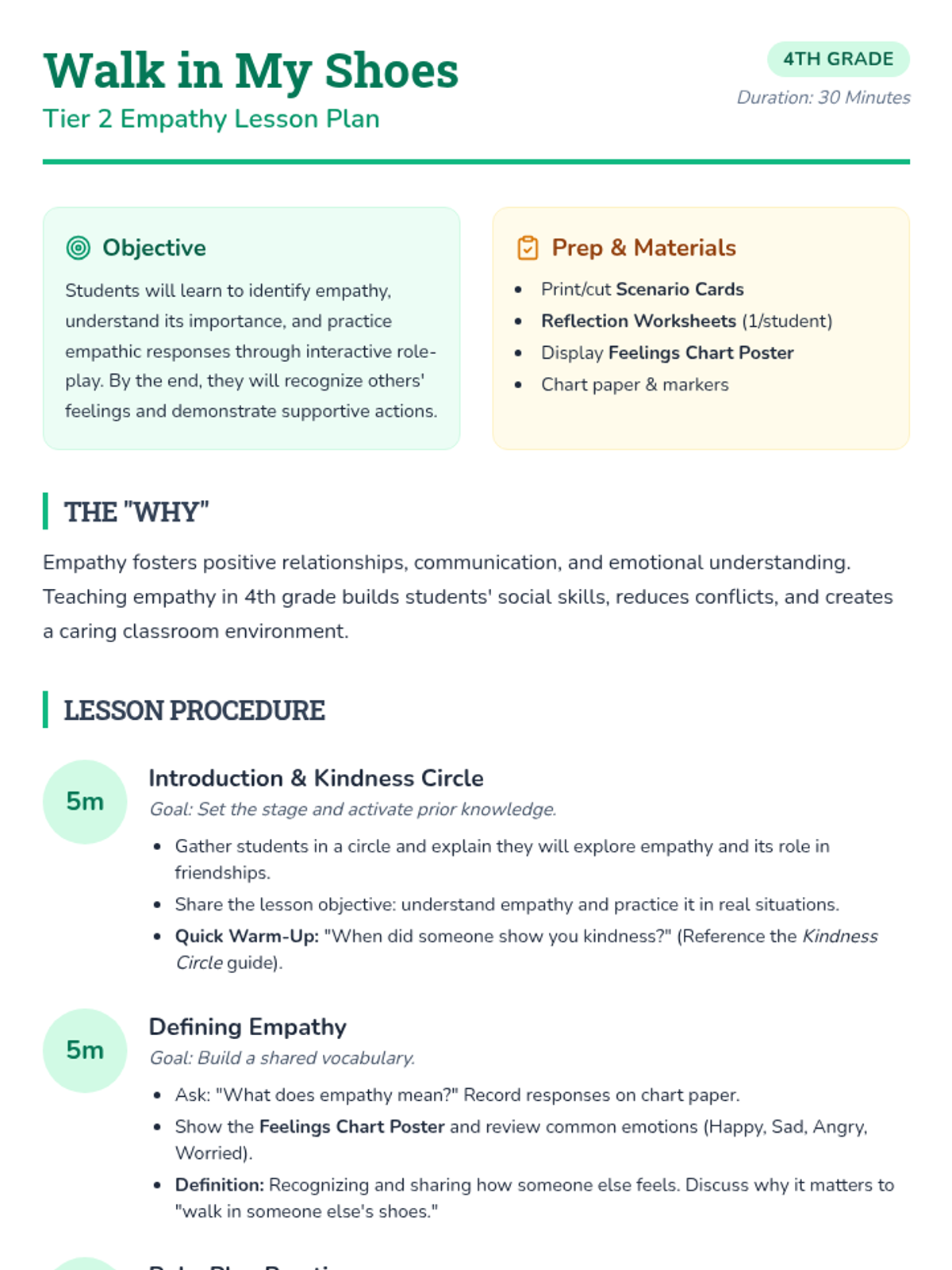 In this 30-minute Tier 2 lesson for 4th graders, students will learn what empathy is, why it matters, and practice real-life empathy skills through interactive role-play. Strengthening empathy helps students build better relationships and a supportive classroom community.