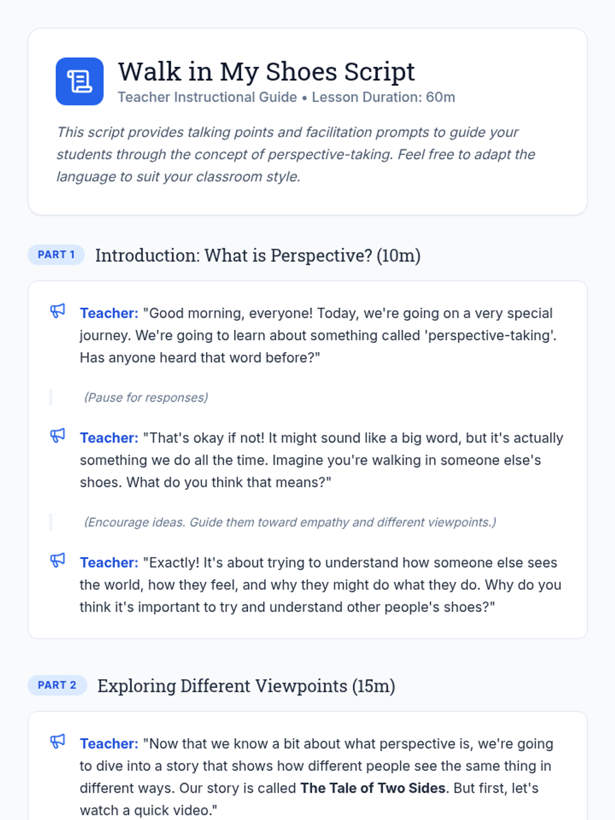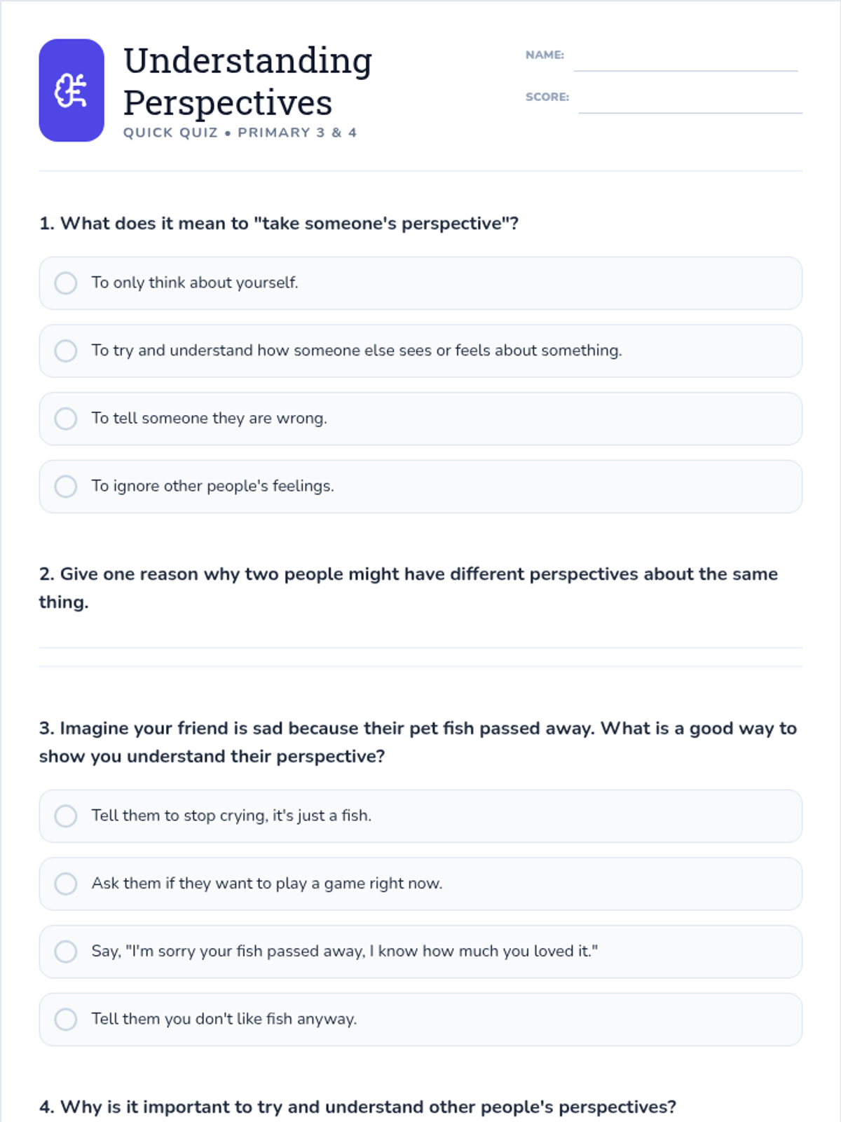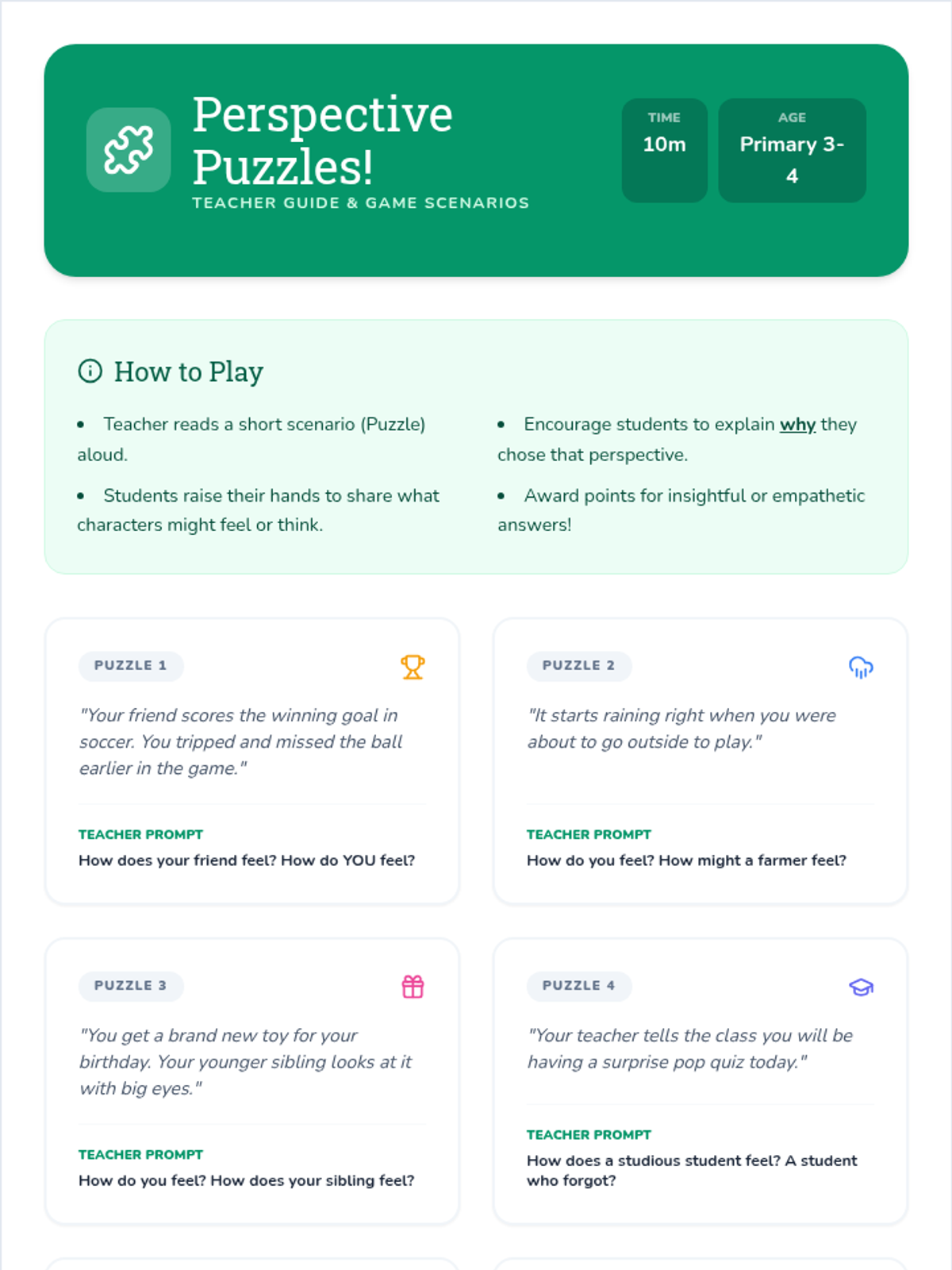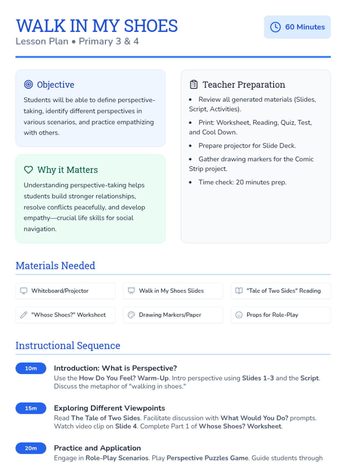 A comprehensive lesson for Primary 3 and 4 students to develop perspective-taking and empathy skills through interactive stories, role-play, and creative projects.