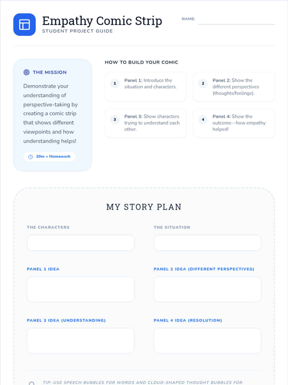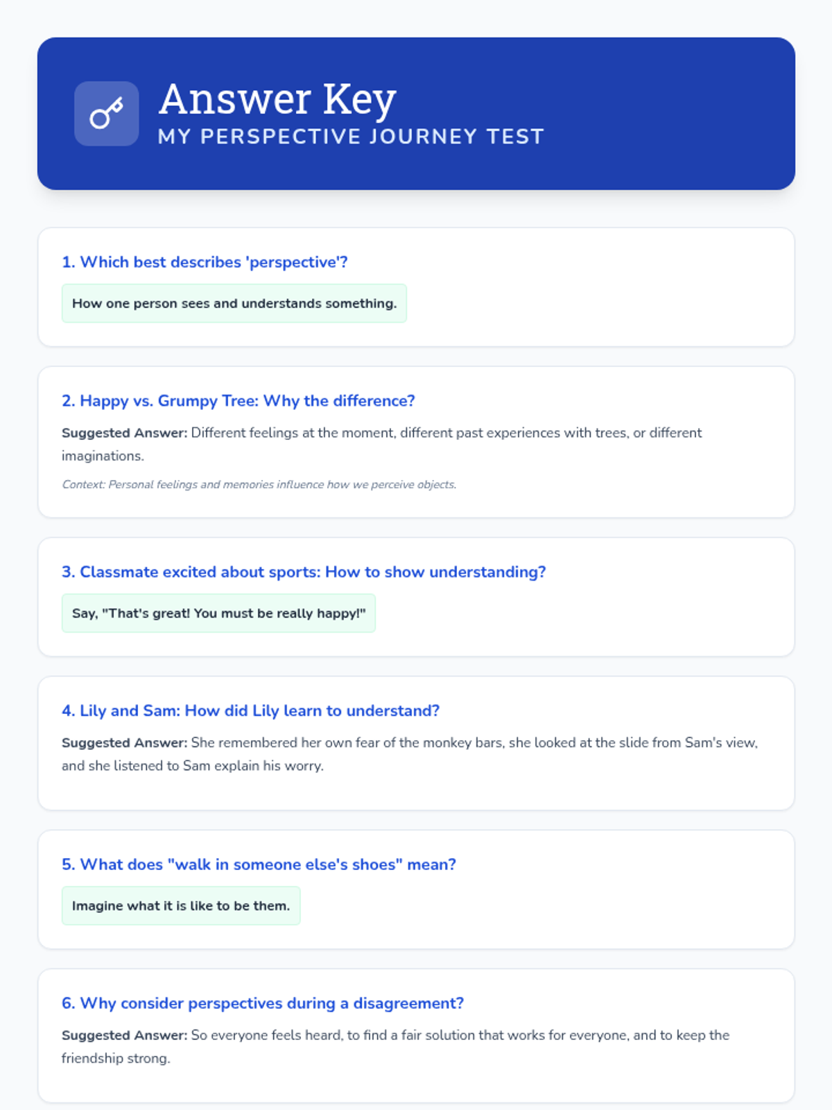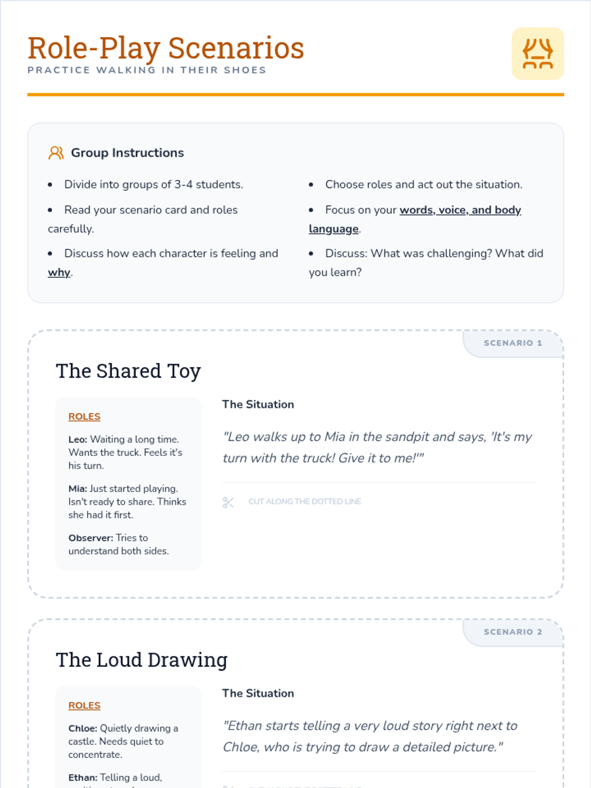 A comprehensive lesson for Primary 3 and 4 students to develop perspective-taking and empathy skills through interactive stories, role-play, and creative projects.