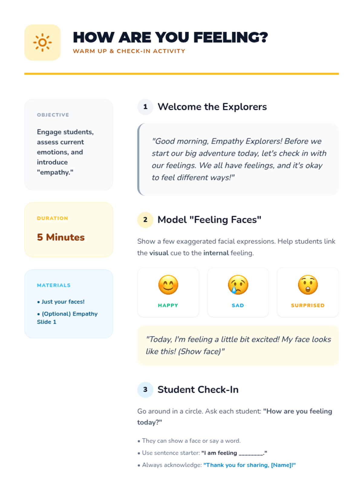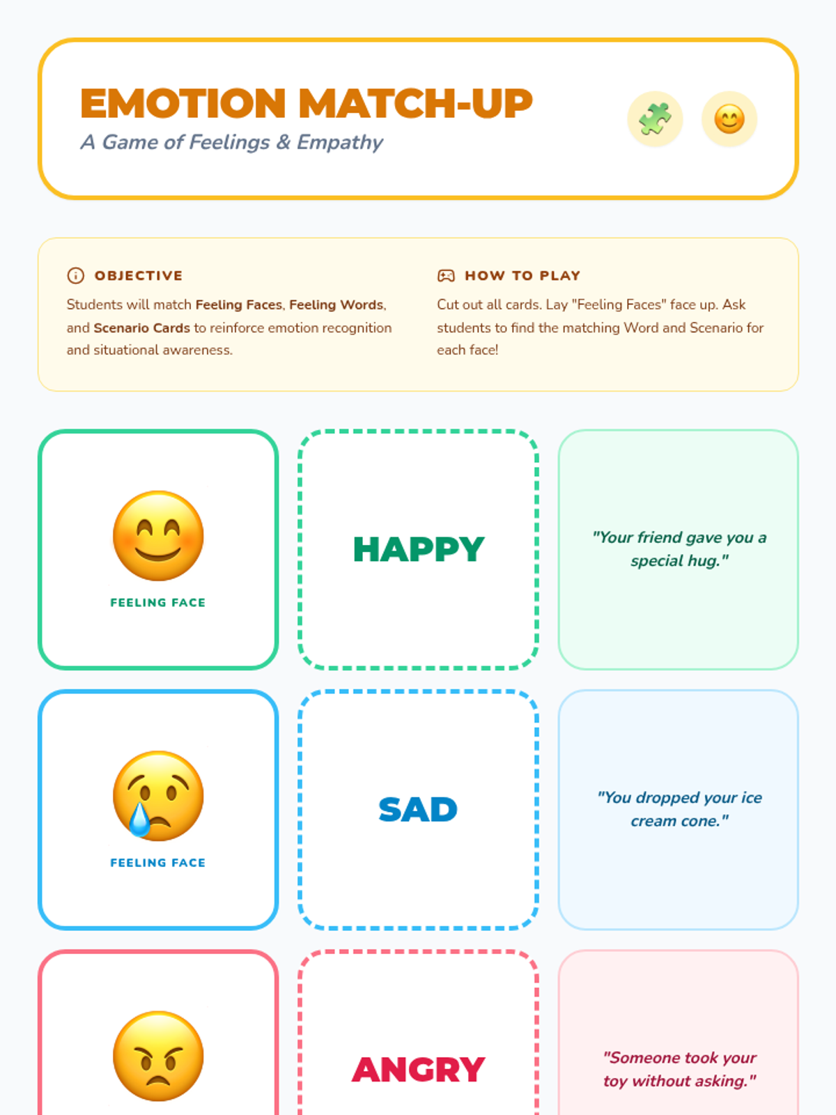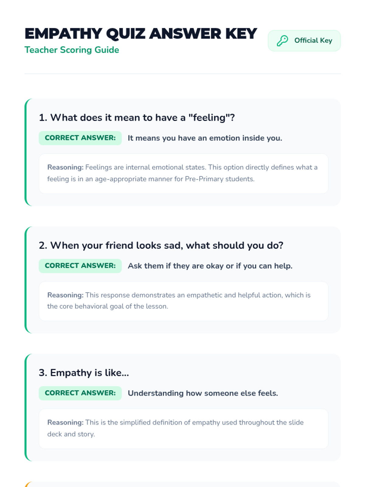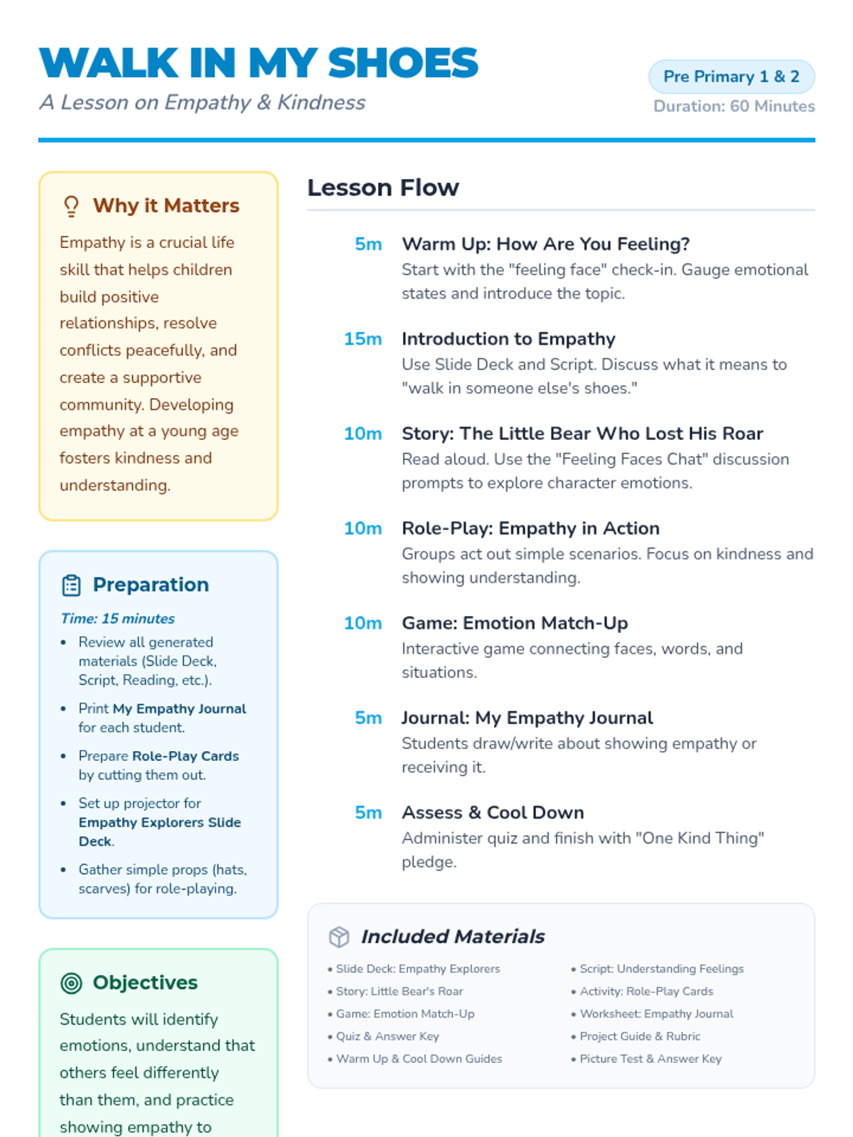 This lesson introduces Pre Primary 1 & 2 students to the concept of empathy through engaging activities and discussions. Students will learn to recognize and understand the feelings of others, fostering a kind and inclusive classroom environment.
