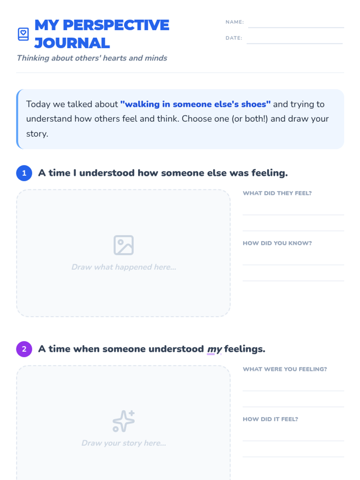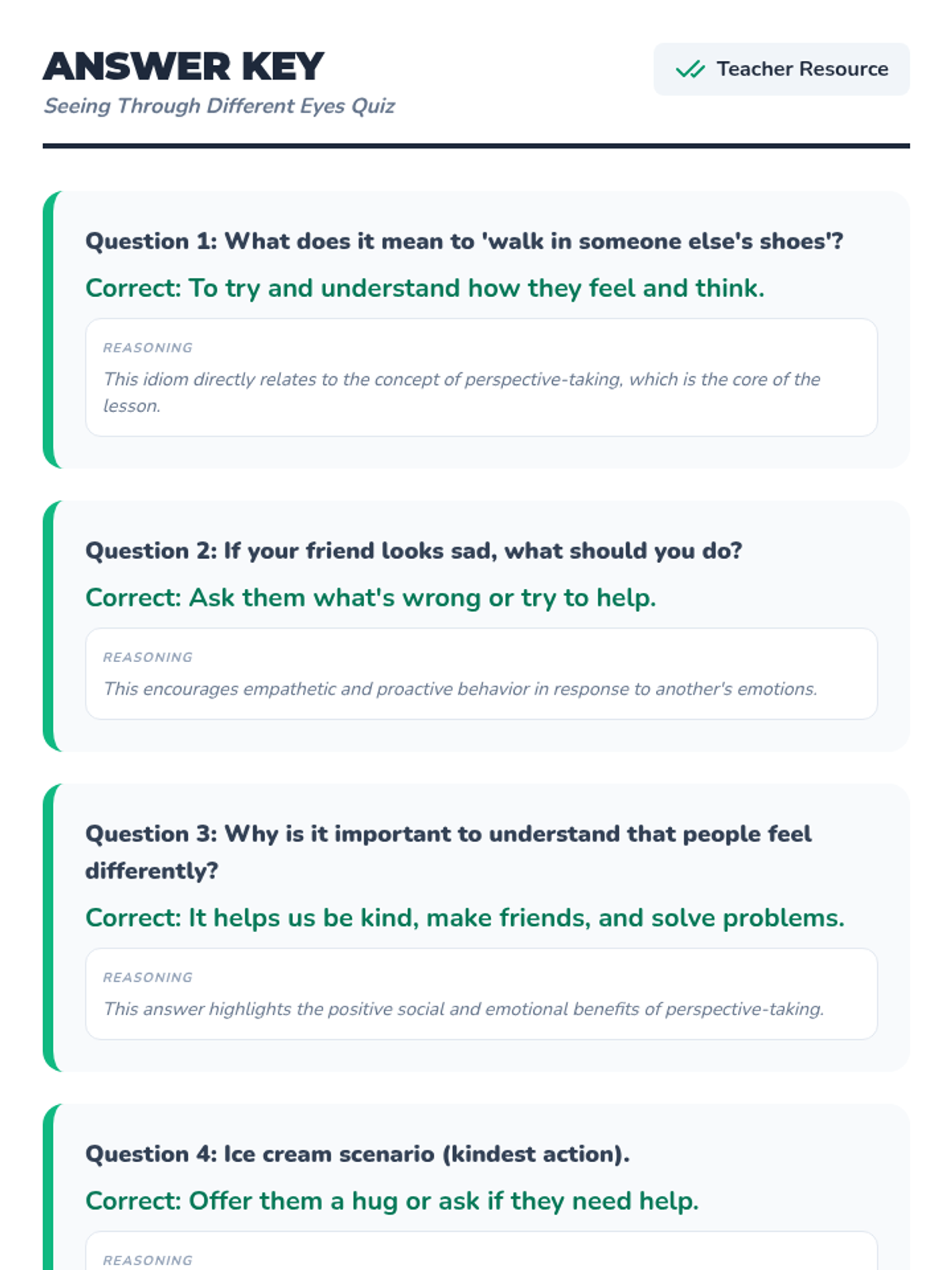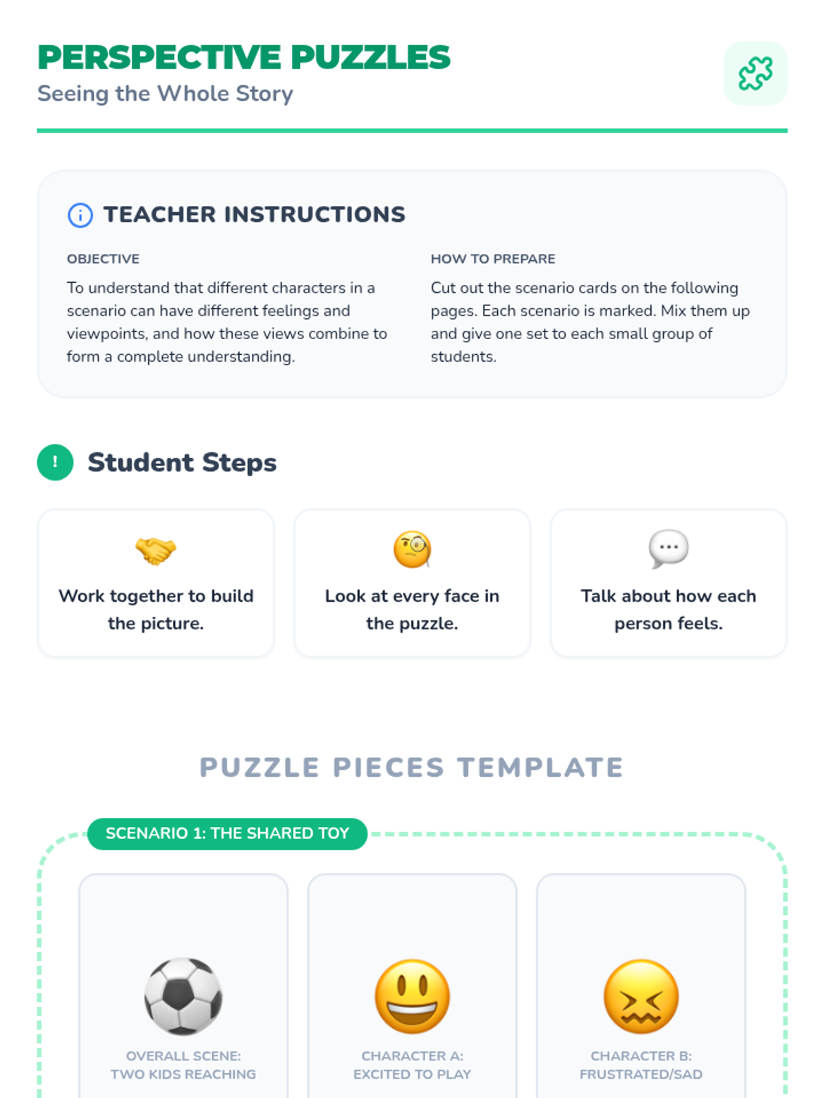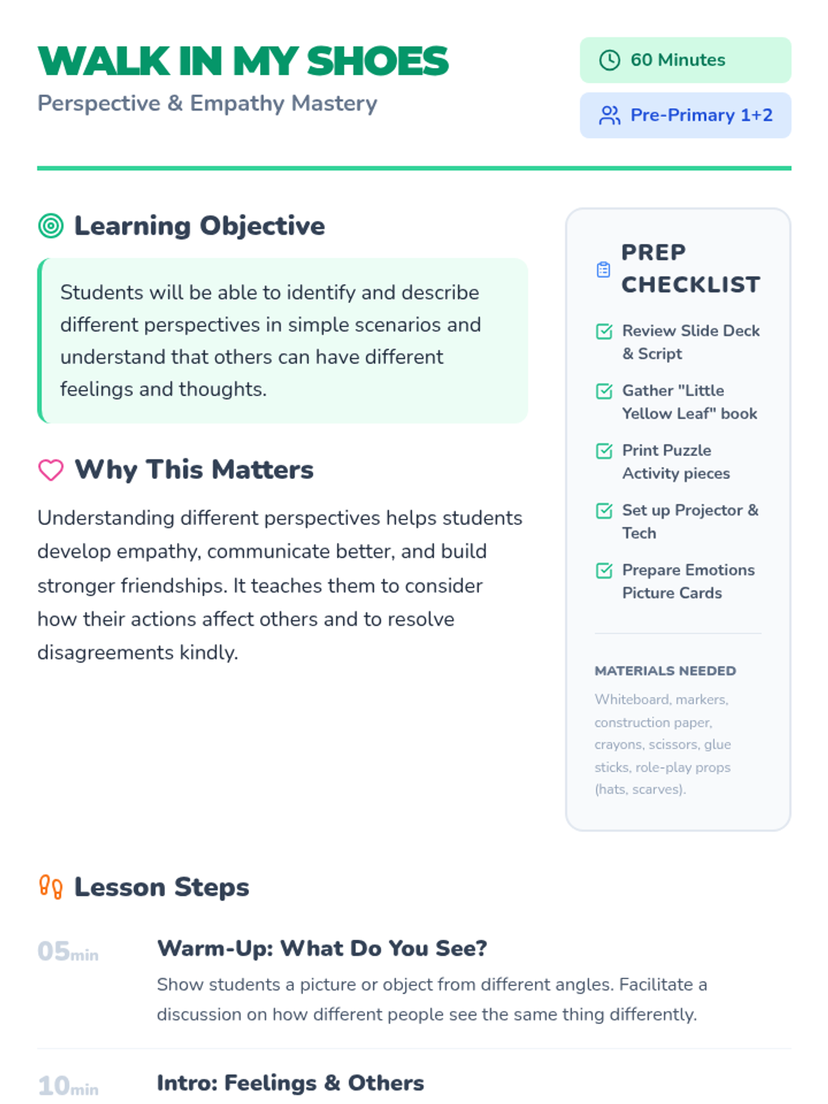 This lesson introduces Pre-Primary 1+2 students to perspective-taking, helping them understand that others may have different feelings, thoughts, and experiences. Students explore empathy through stories, puzzles, and role-playing activities.