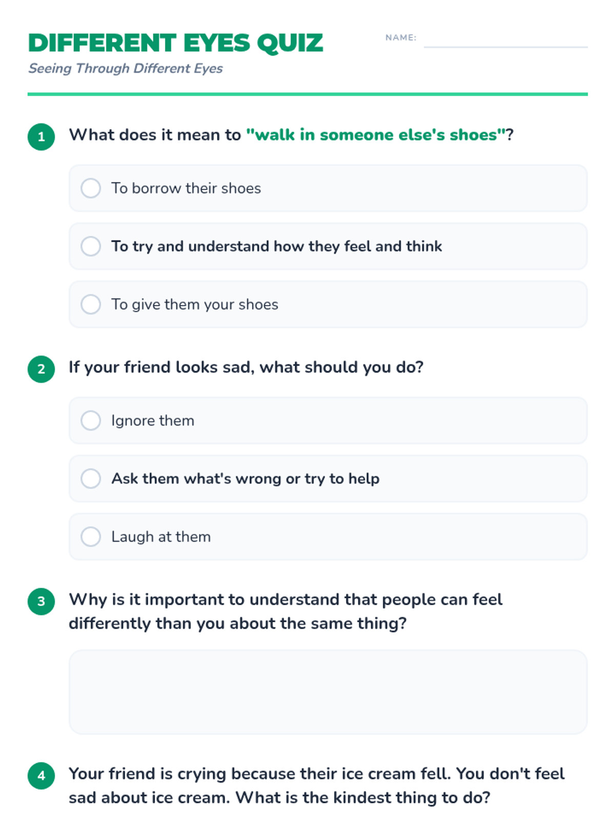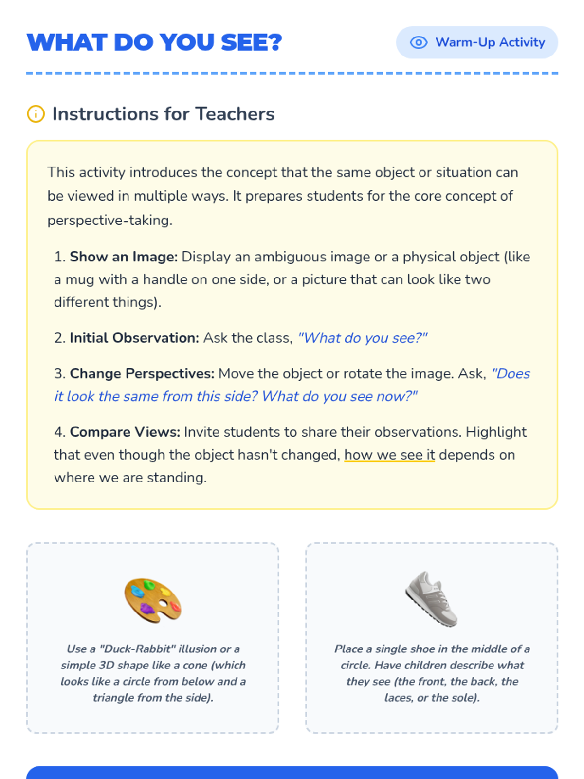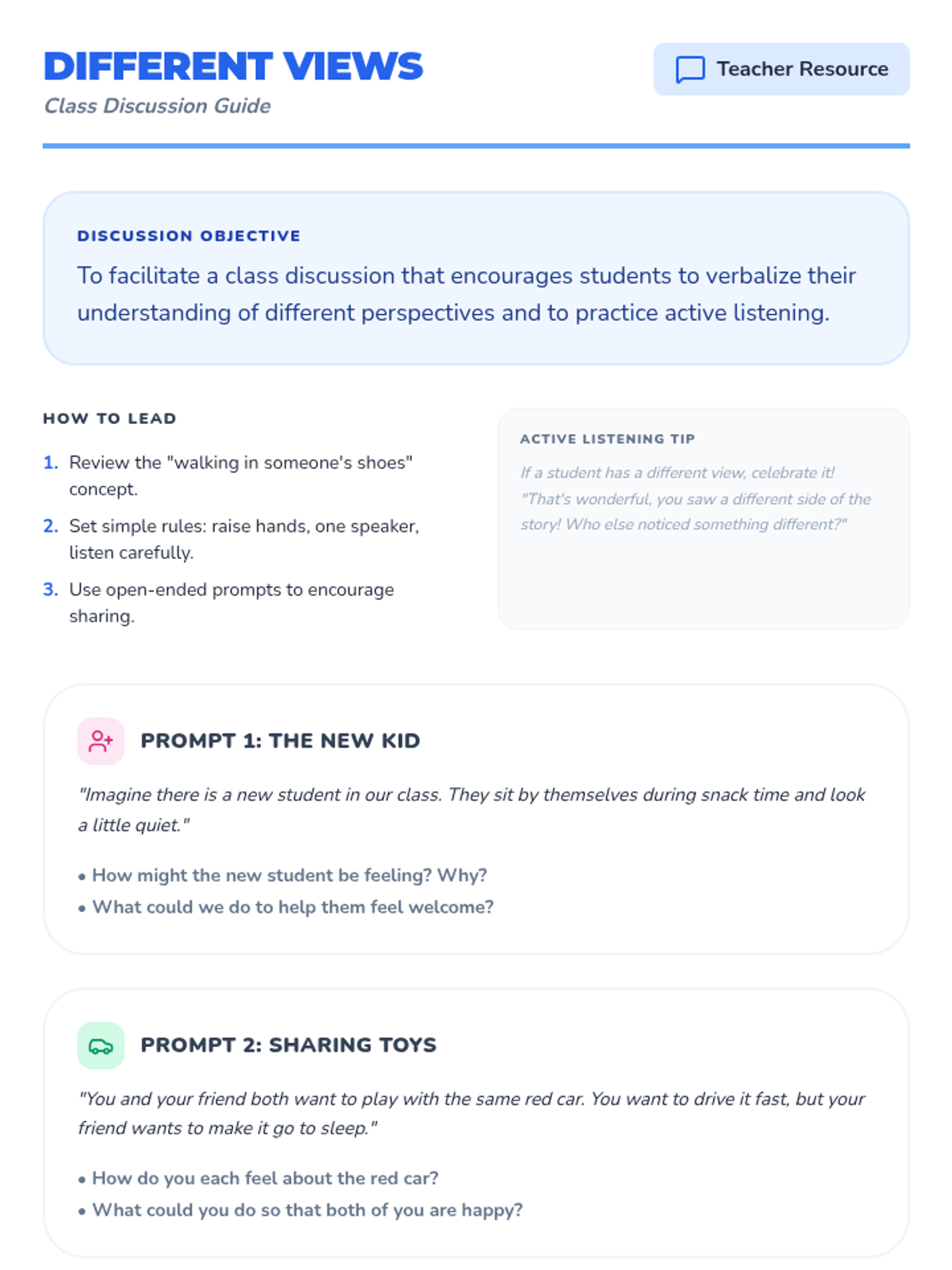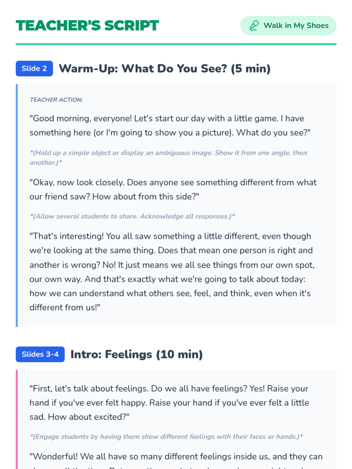 This lesson introduces Pre-Primary 1+2 students to perspective-taking, helping them understand that others may have different feelings, thoughts, and experiences. Students explore empathy through stories, puzzles, and role-playing activities.