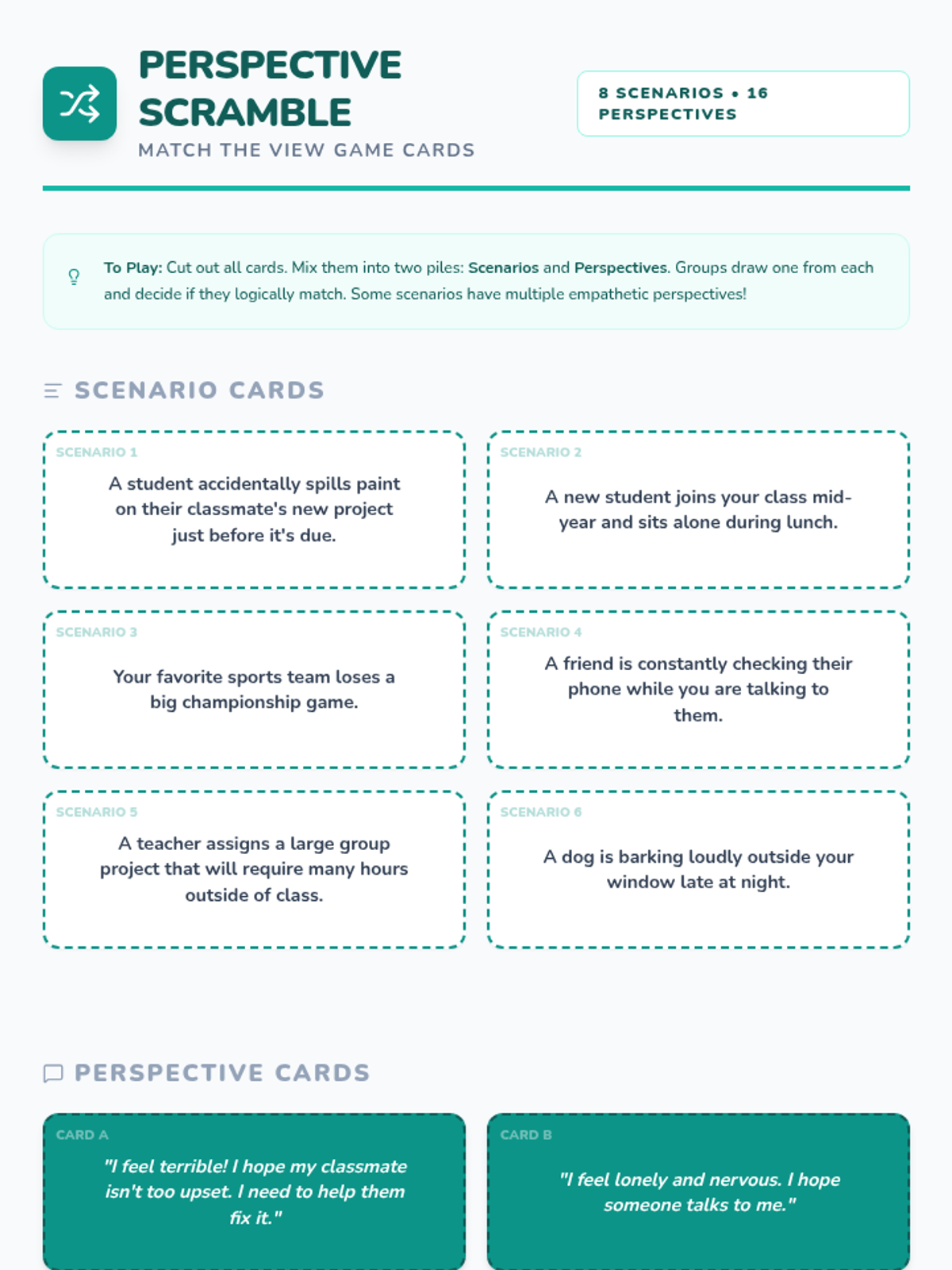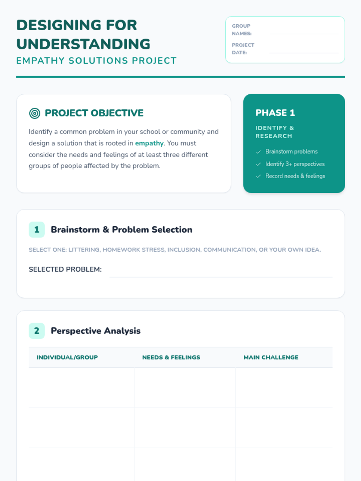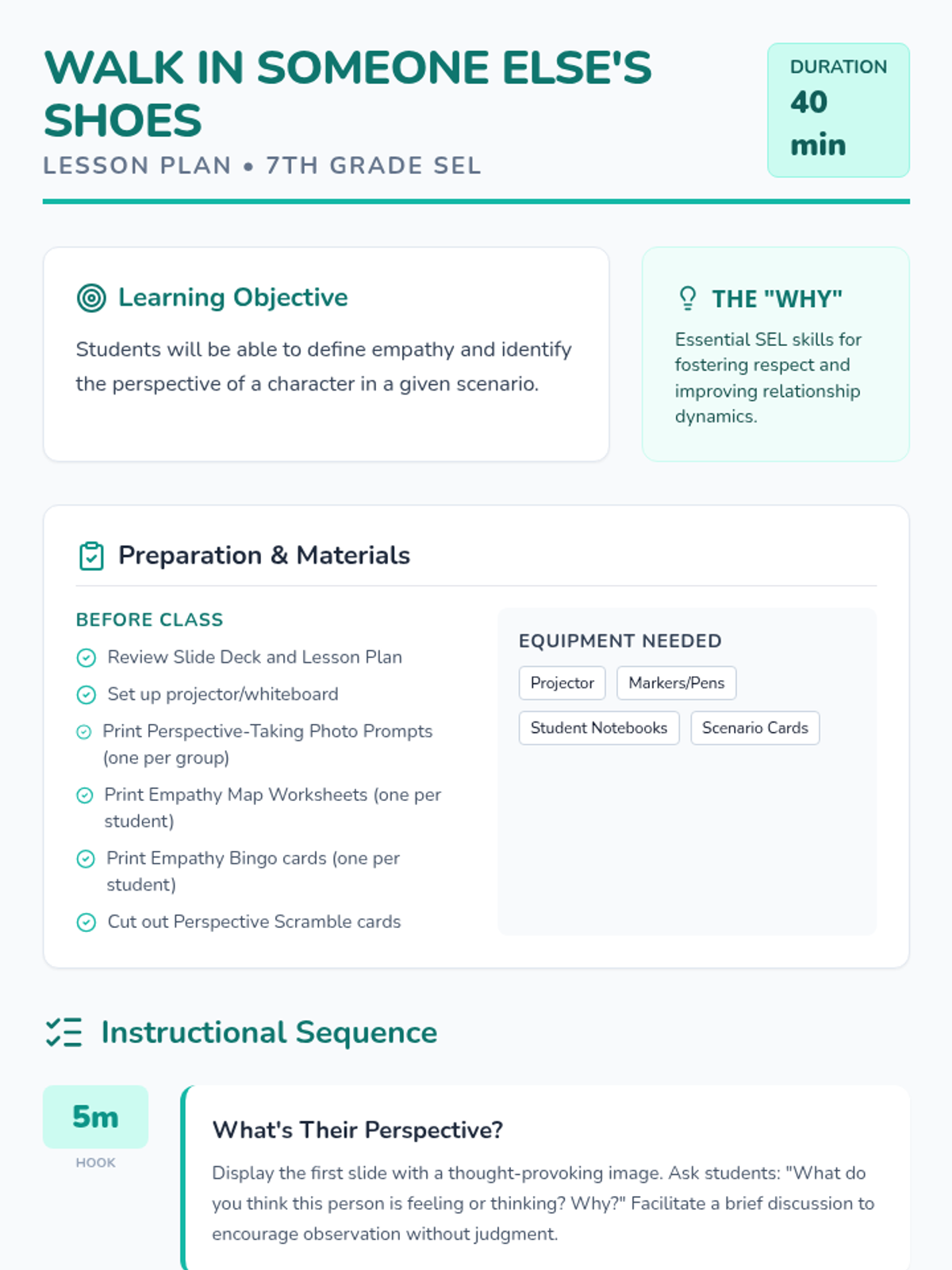 A 40-minute SEL lesson for 7th graders to define empathy and practice perspective-taking through interactive scenarios, games, and project-based learning.