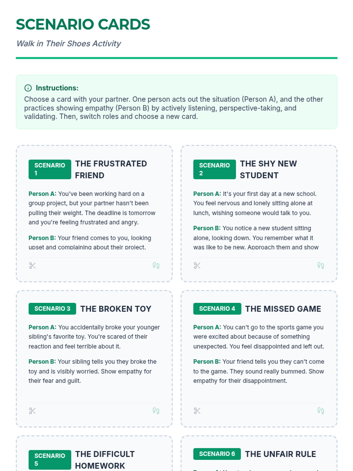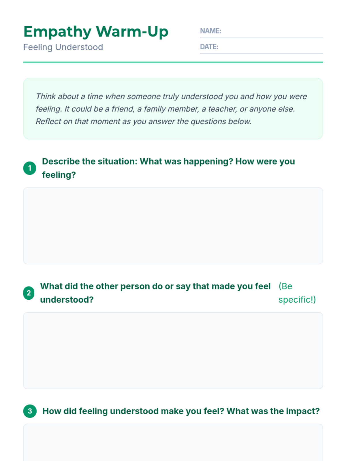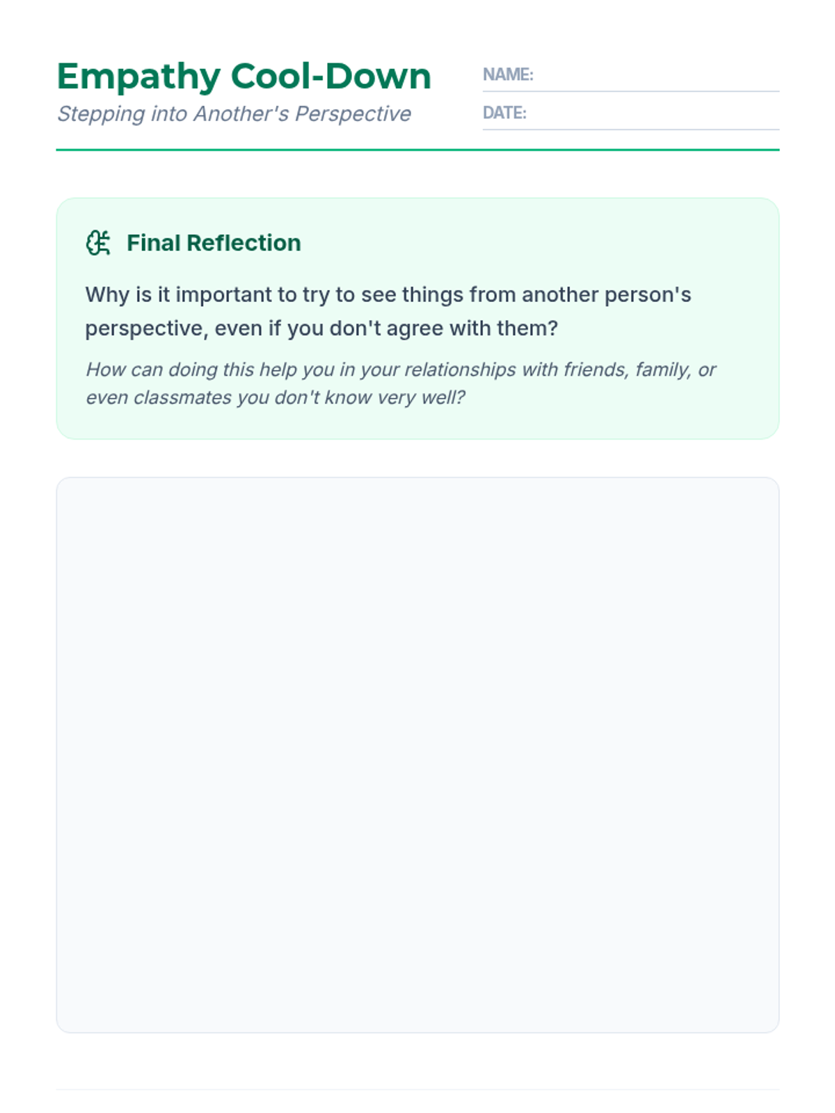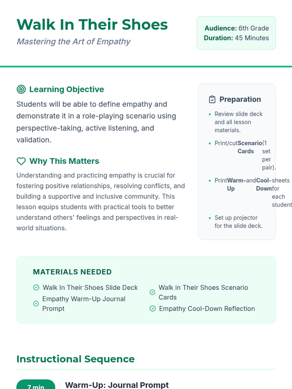 This interactive 45-minute lesson introduces 6th-grade students to the concept of empathy through reflective writing, guided discussion, and role-playing scenarios. Students will define empathy, distinguish it from sympathy, and practice active listening and perspective-taking skills to better understand others.