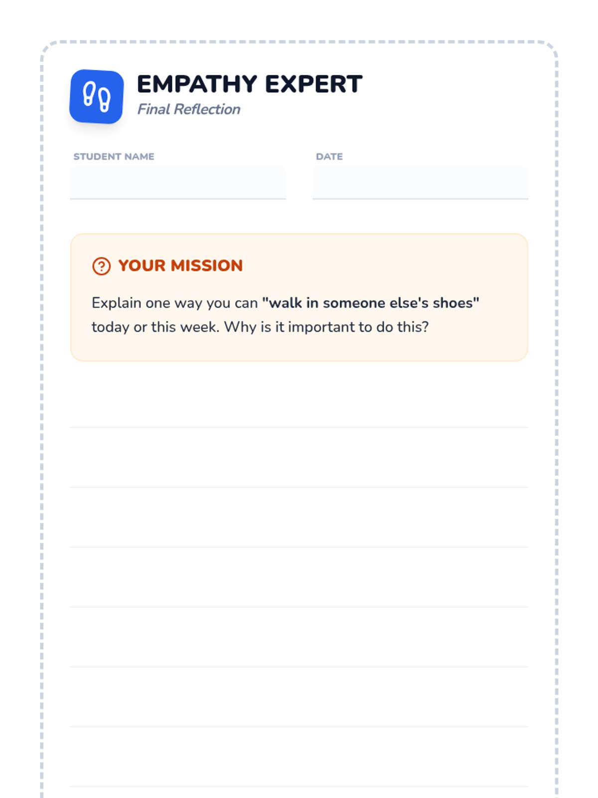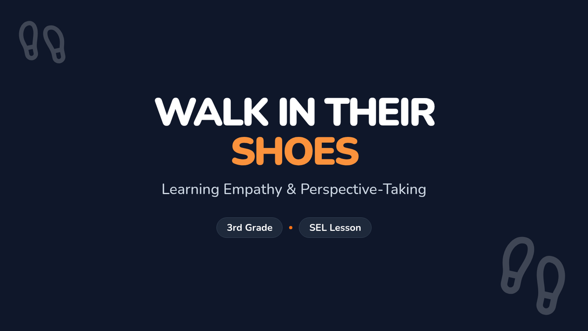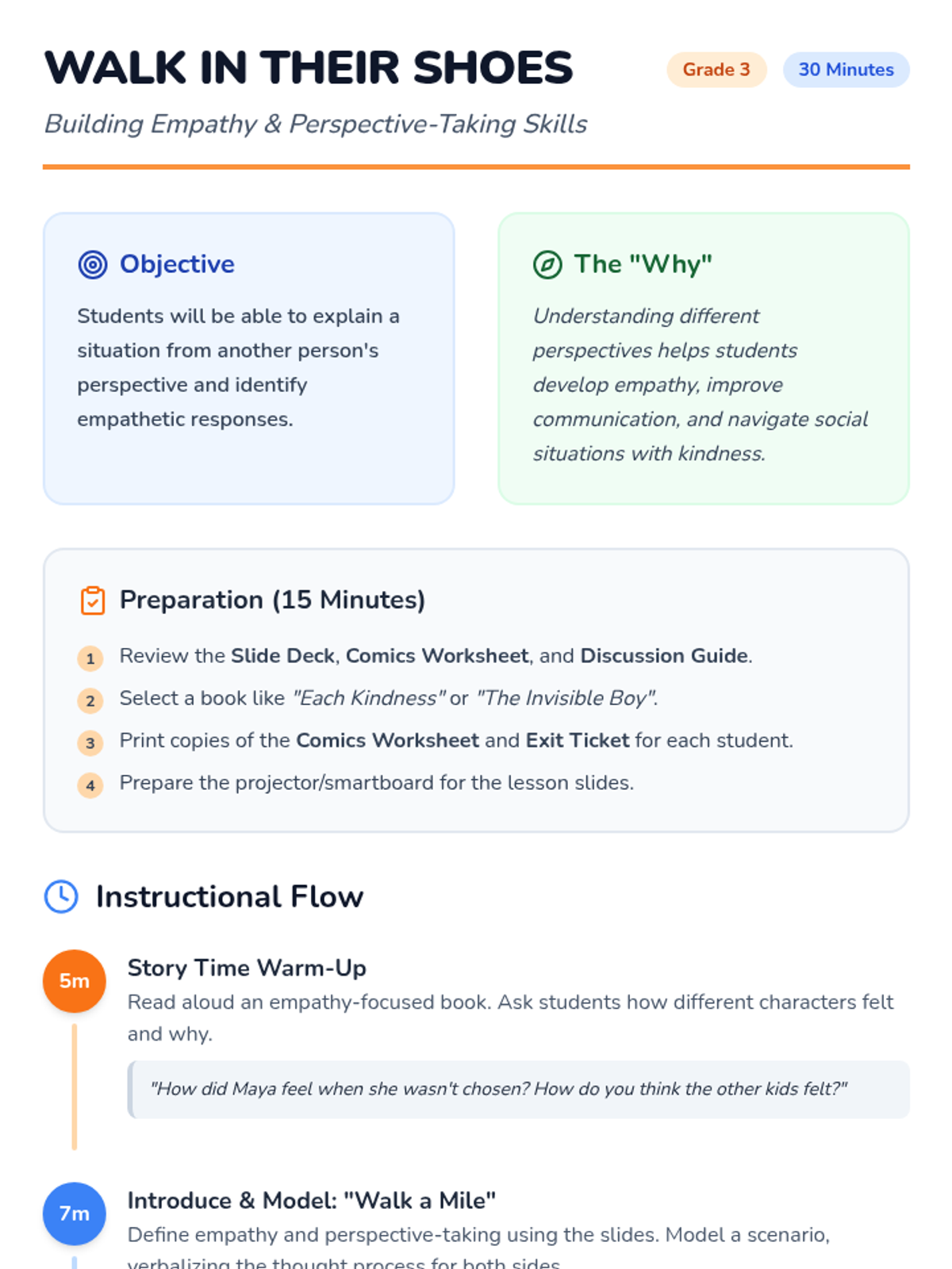 A 30-minute 3rd-grade lesson designed to help students develop empathy and perspective-taking skills through stories, comic-style scenarios, and group discussions. Students learn to 'walk in someone else's shoes' to navigate social situations with kindness.