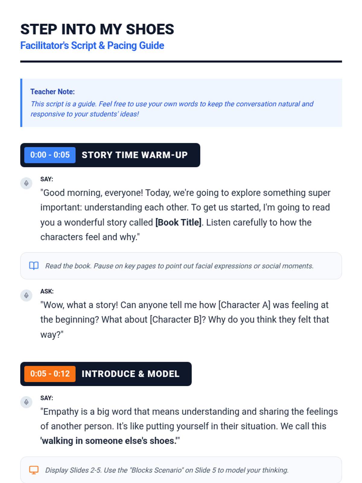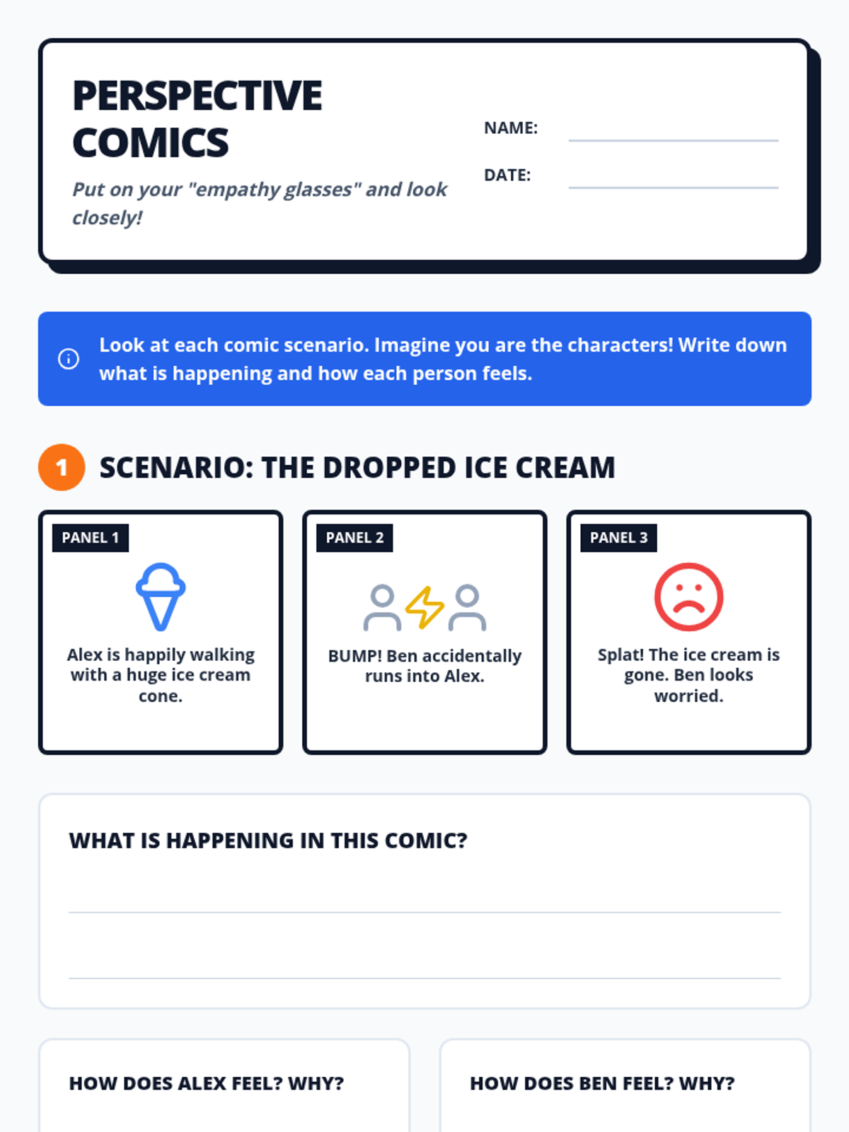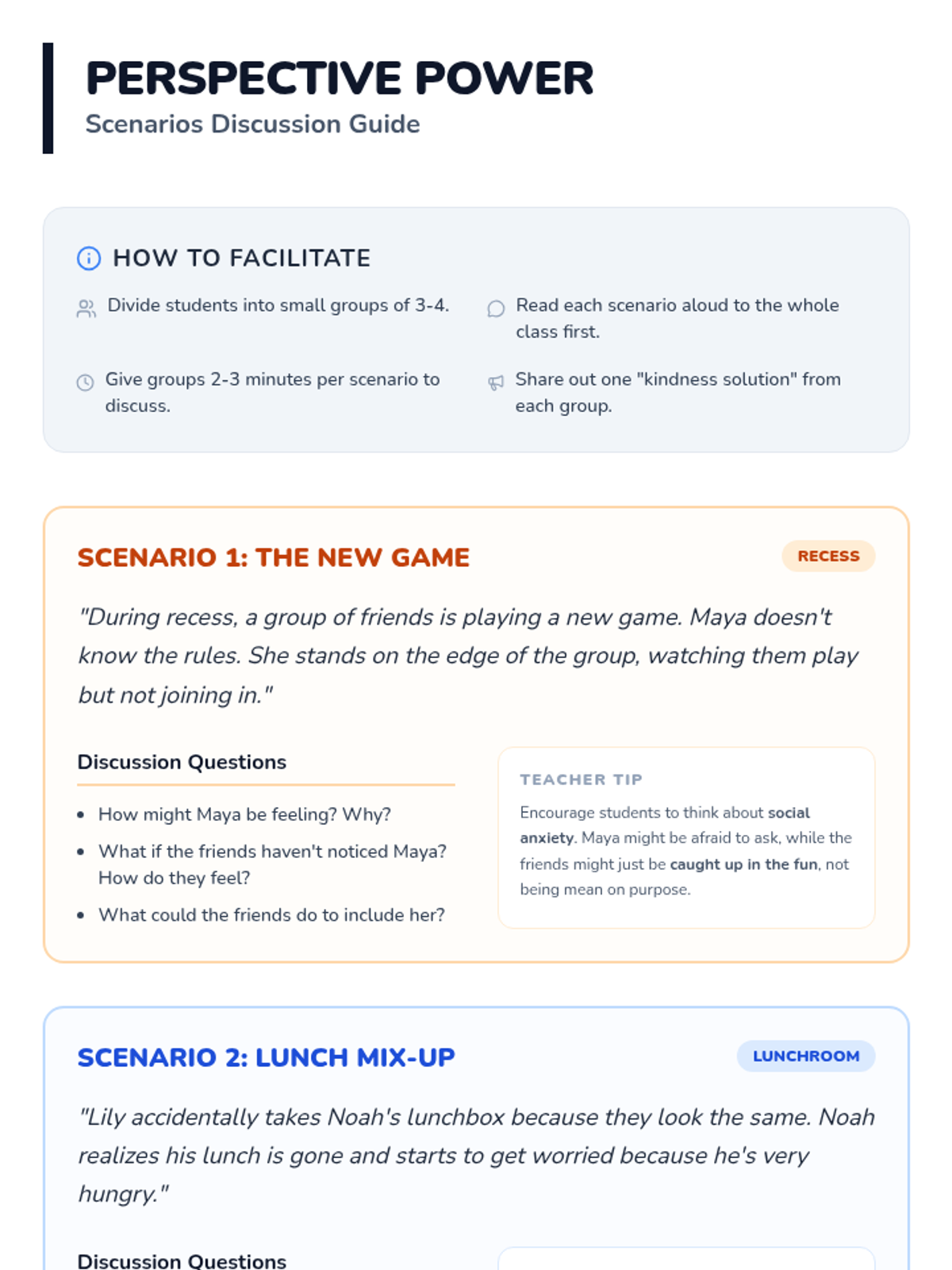 A 30-minute 3rd-grade lesson designed to help students develop empathy and perspective-taking skills through stories, comic-style scenarios, and group discussions. Students learn to 'walk in someone else's shoes' to navigate social situations with kindness.