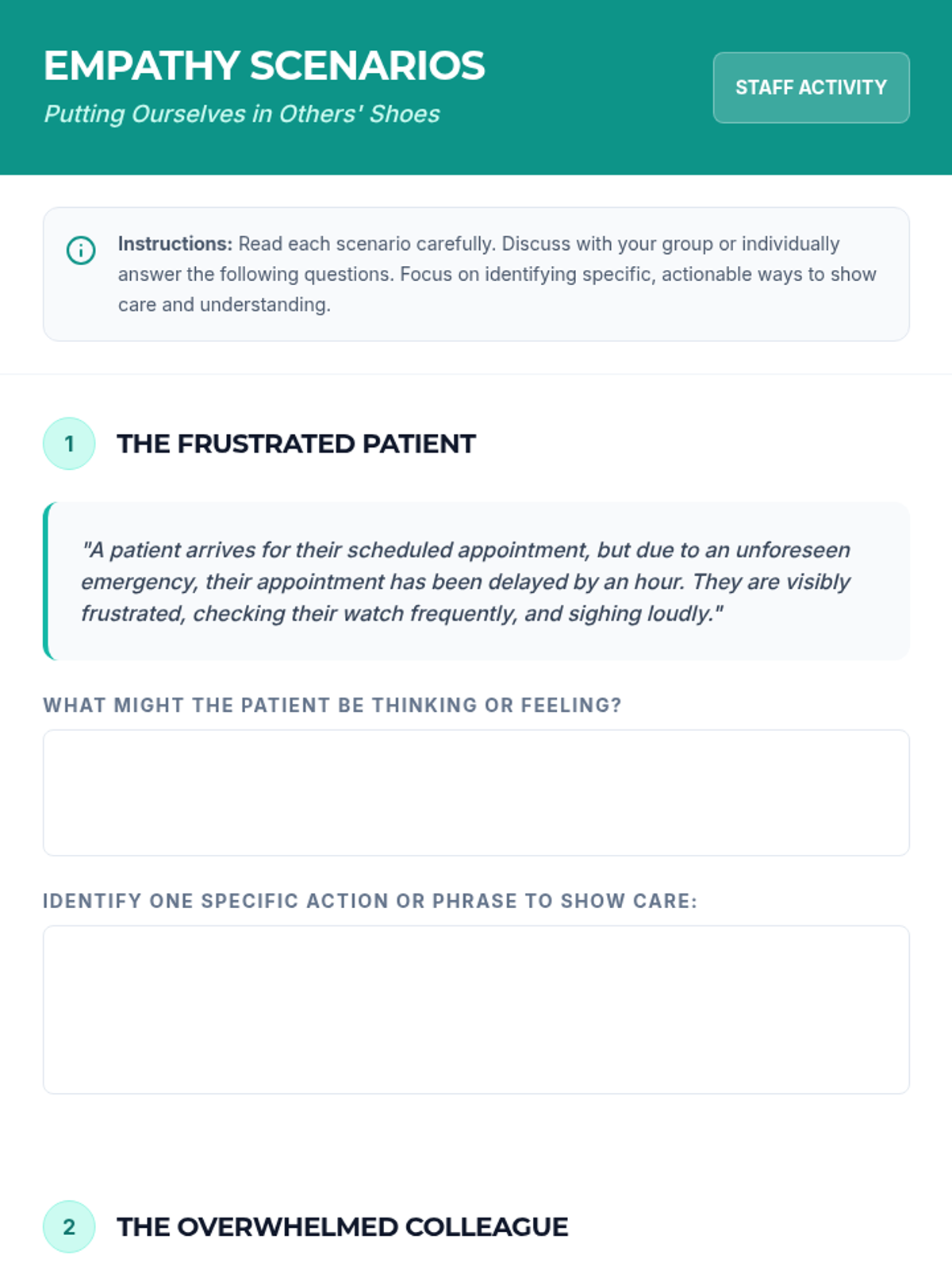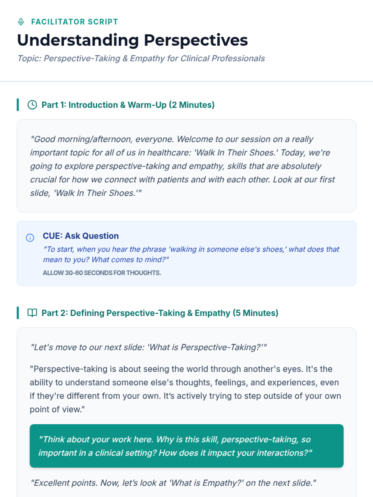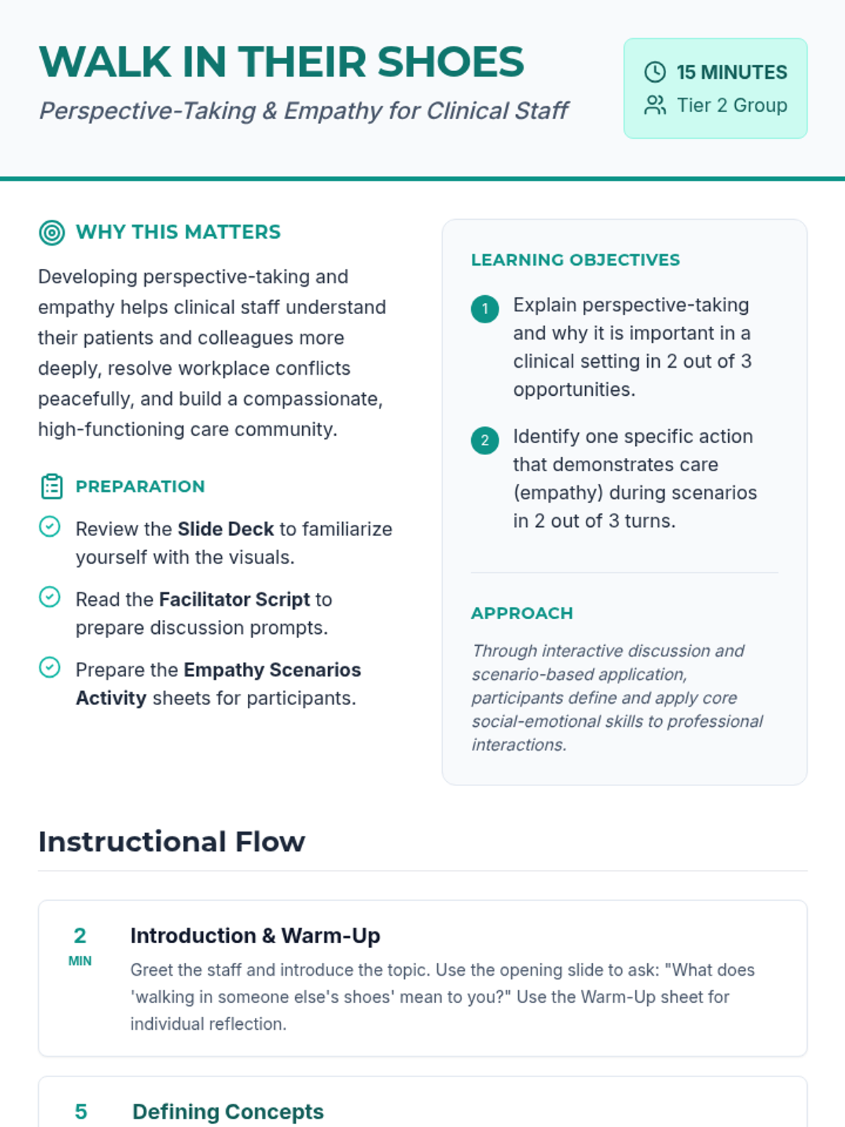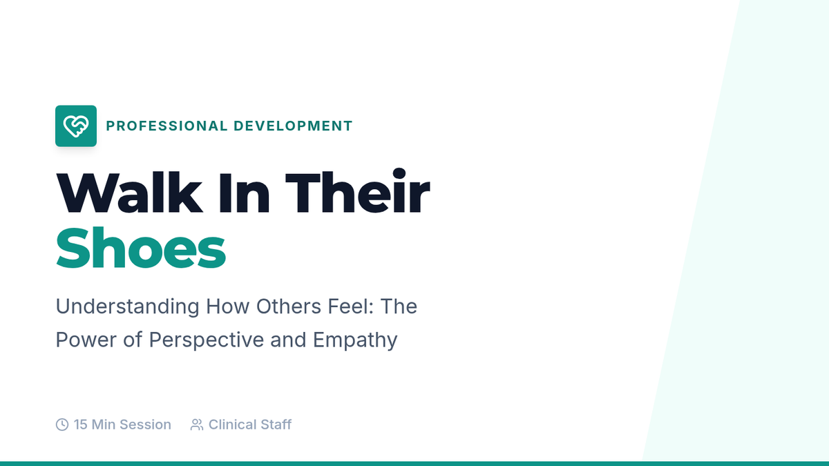 A 15-minute professional development session for clinical staff to develop perspective-taking and empathy skills for better patient care and teamwork.