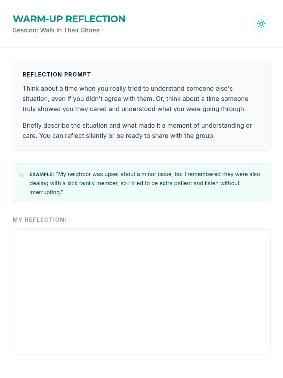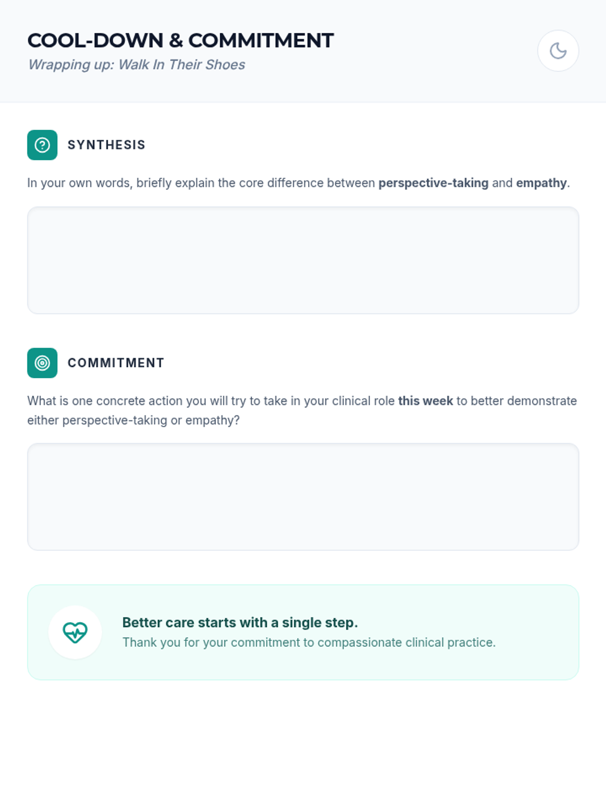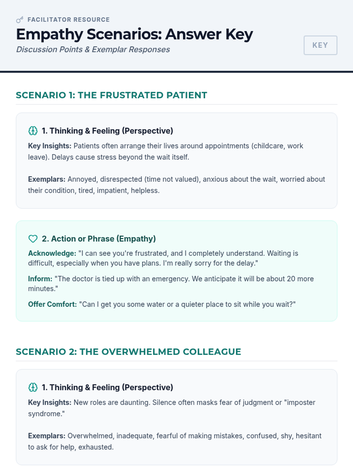 A 15-minute professional development session for clinical staff to develop perspective-taking and empathy skills for better patient care and teamwork.