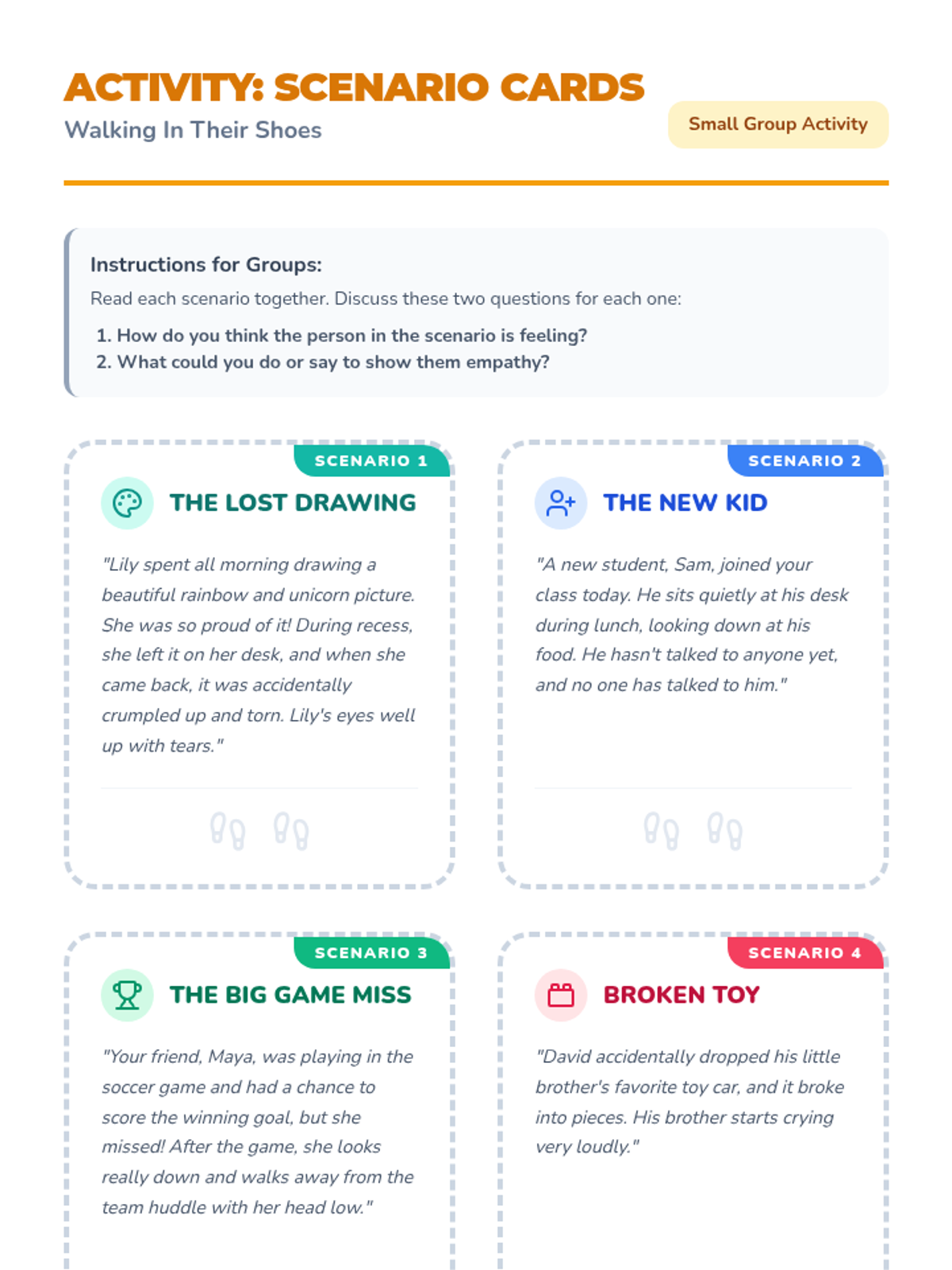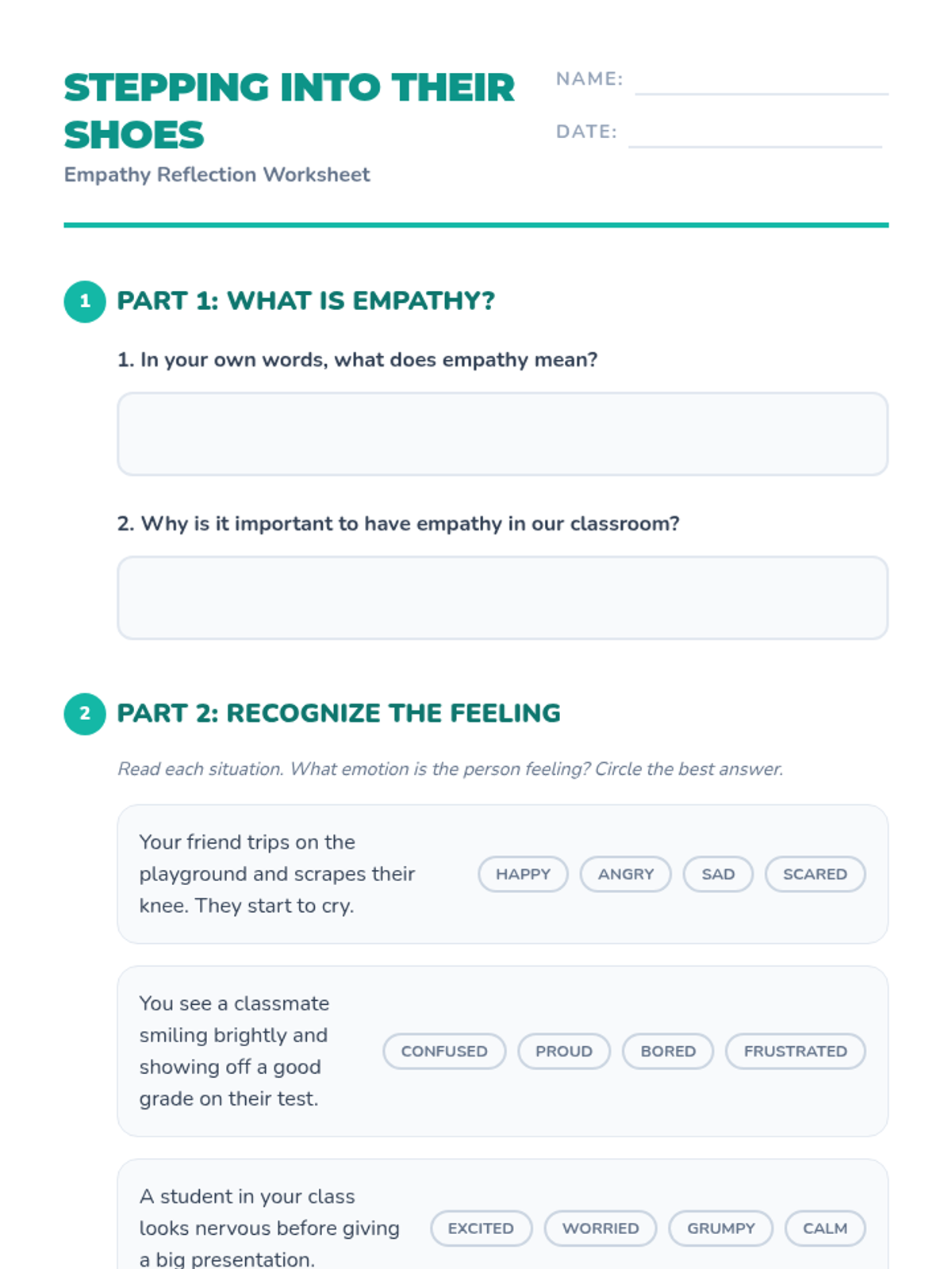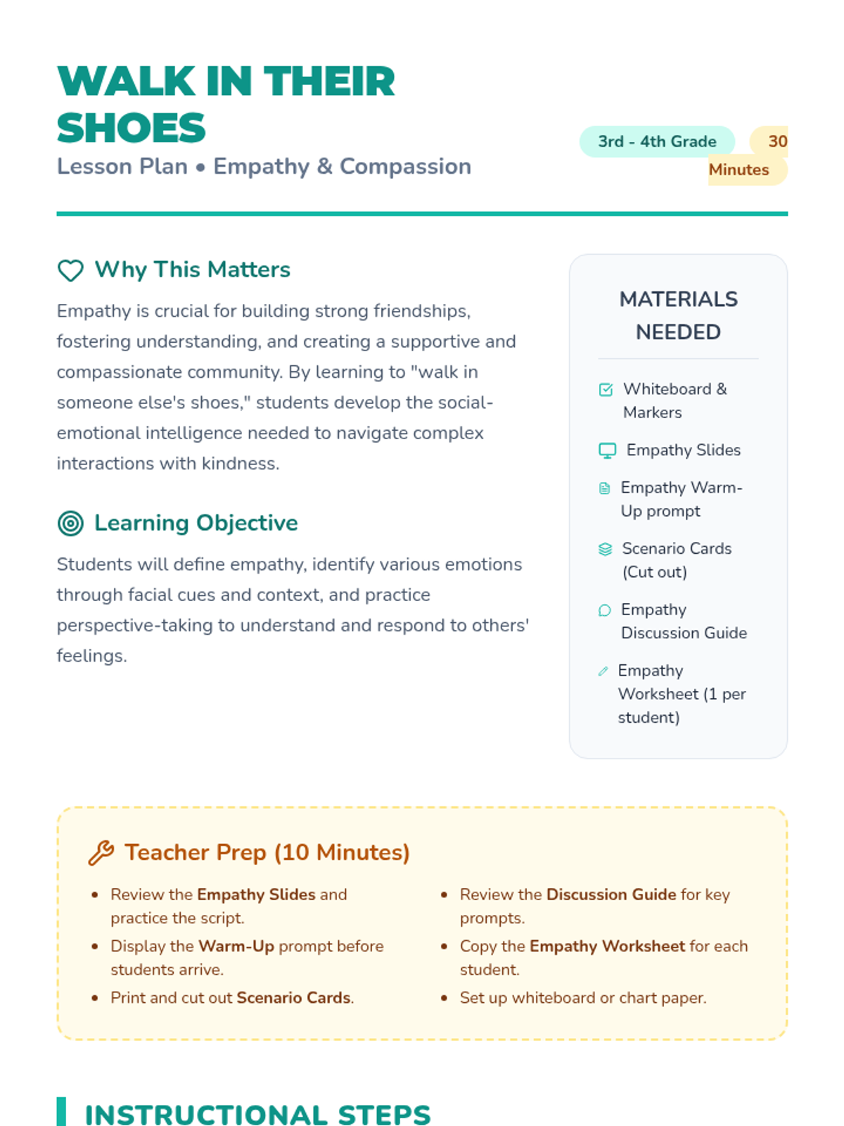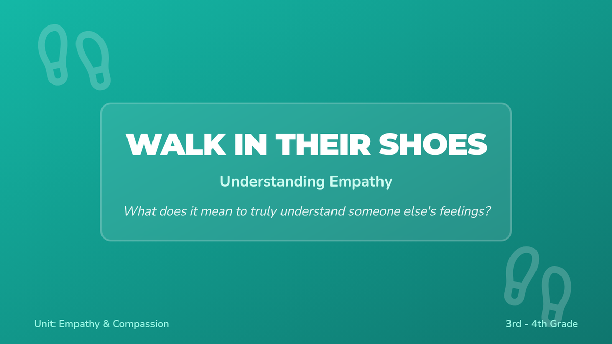 A 30-minute lesson for 3rd and 4th graders that introduces empathy through perspective-taking activities, scenario discussions, and reflective writing. Students learn to recognize emotions in others and practice responding with compassion.