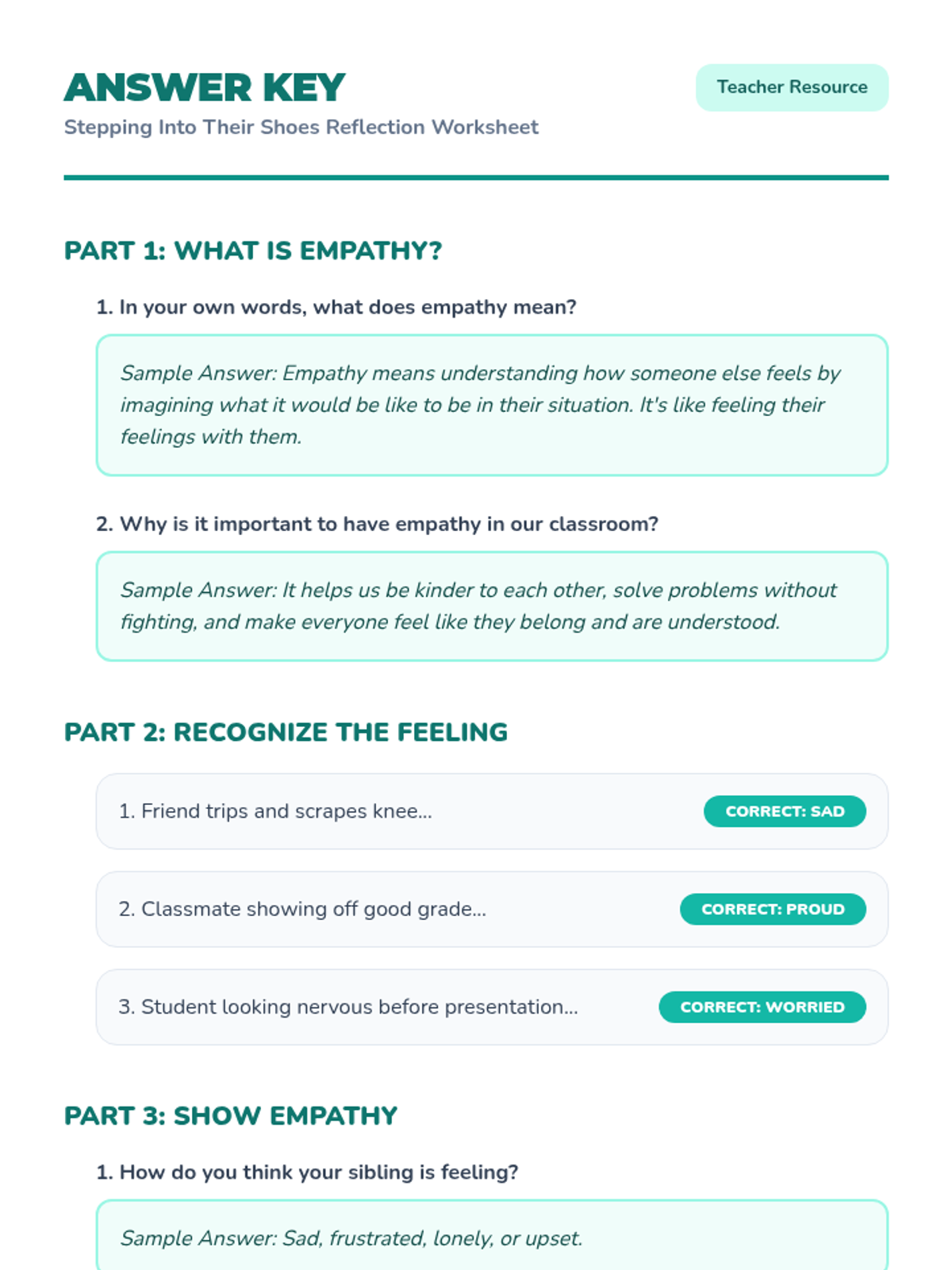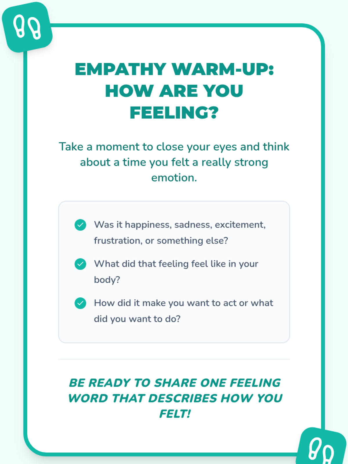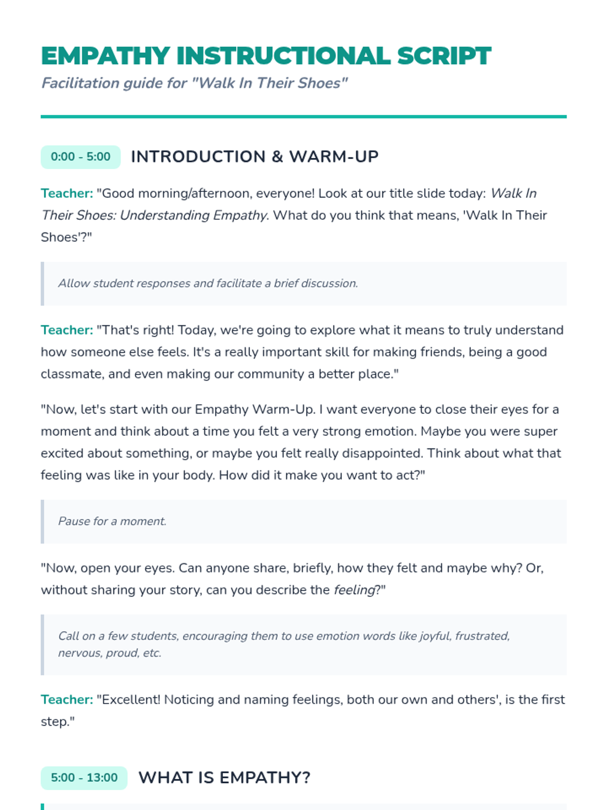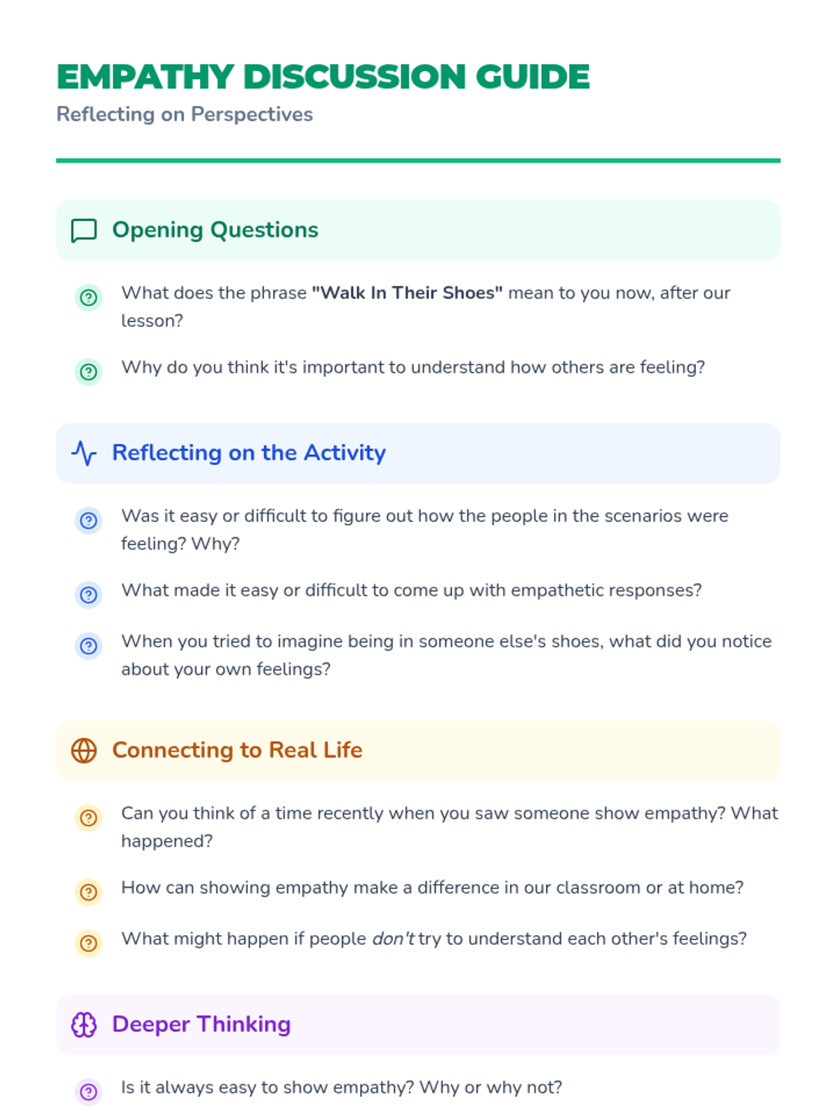 A 30-minute lesson for 3rd and 4th graders that introduces empathy through perspective-taking activities, scenario discussions, and reflective writing. Students learn to recognize emotions in others and practice responding with compassion.