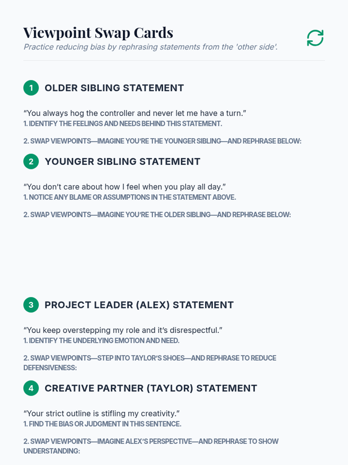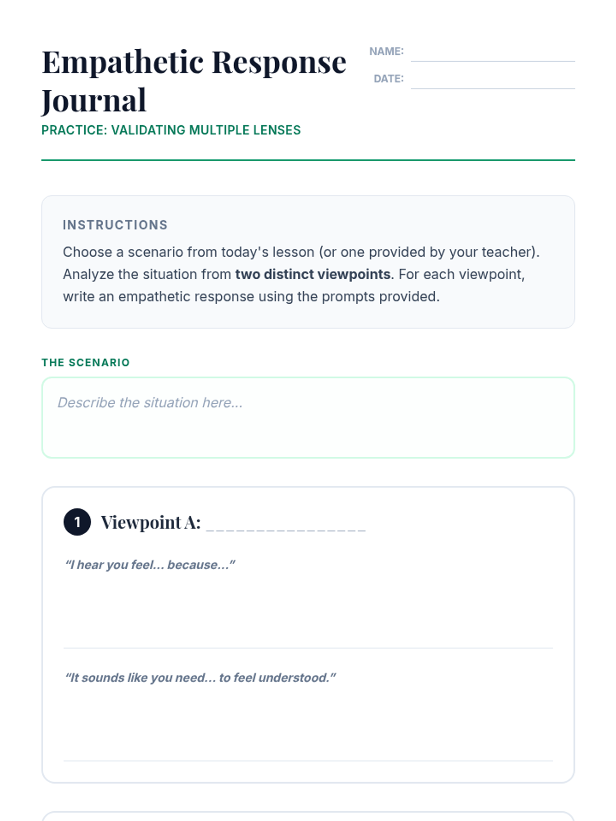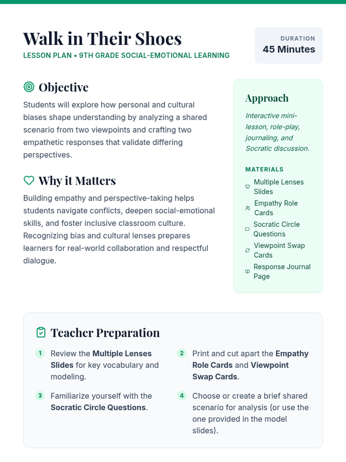 In this 45-minute 9th Grade lesson, students will explore perspective, empathy, bias, and cultural lenses by analyzing a scenario from two distinct viewpoints and crafting empathetic responses. This lesson builds critical social-emotional skills, deepening students’ ability to understand others and resolve conflicts.