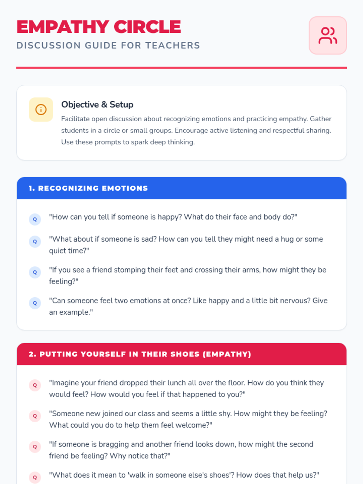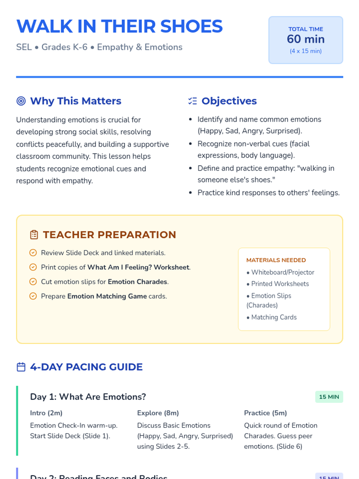 A 4-day SEL lesson sequence designed for K-6 students to develop empathy by recognizing and responding to emotions in themselves and others. Each 15-minute session fits easily into daily classroom routines, building a supportive and inclusive environment.