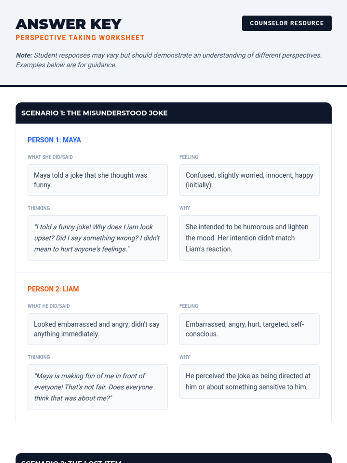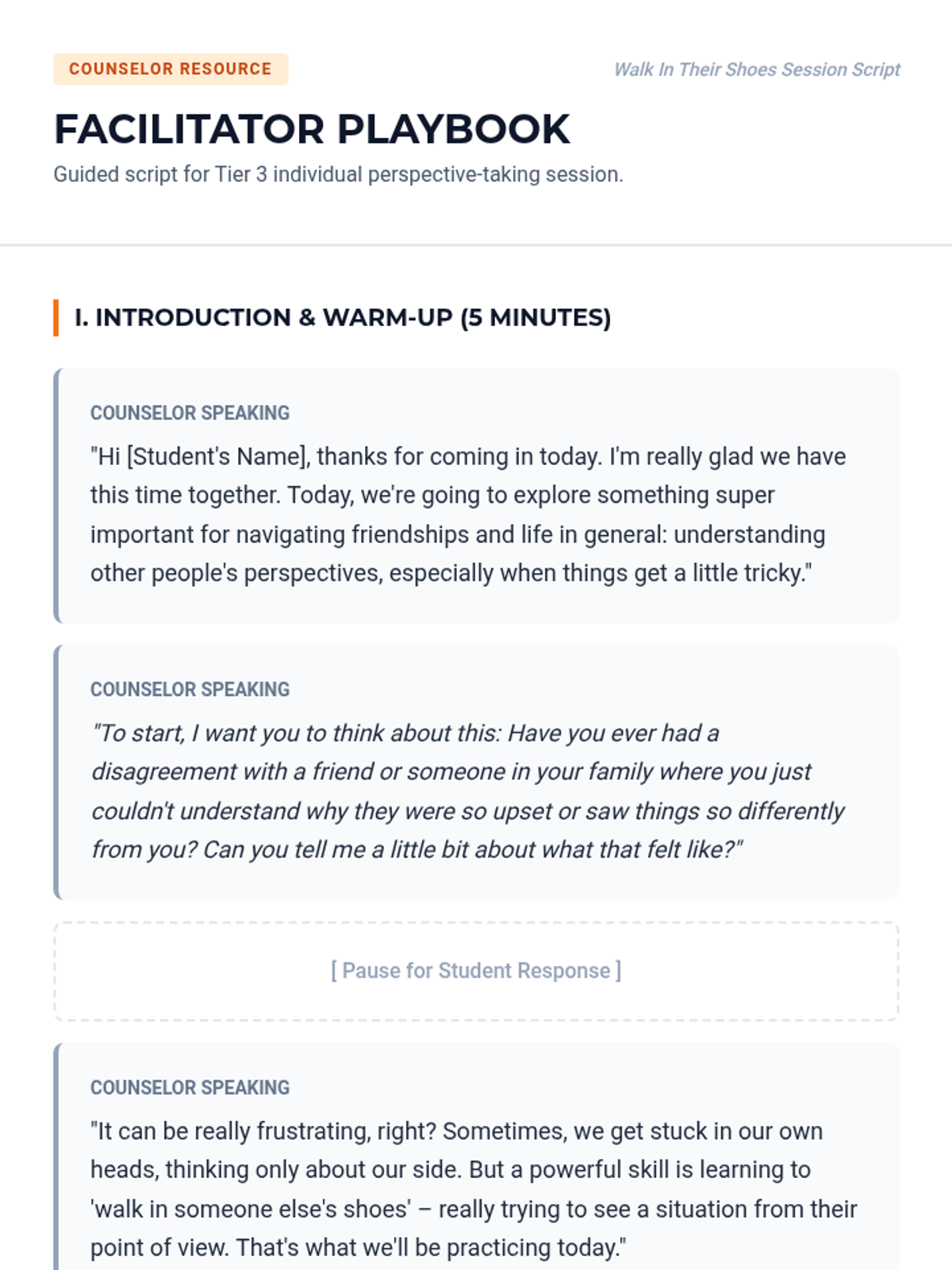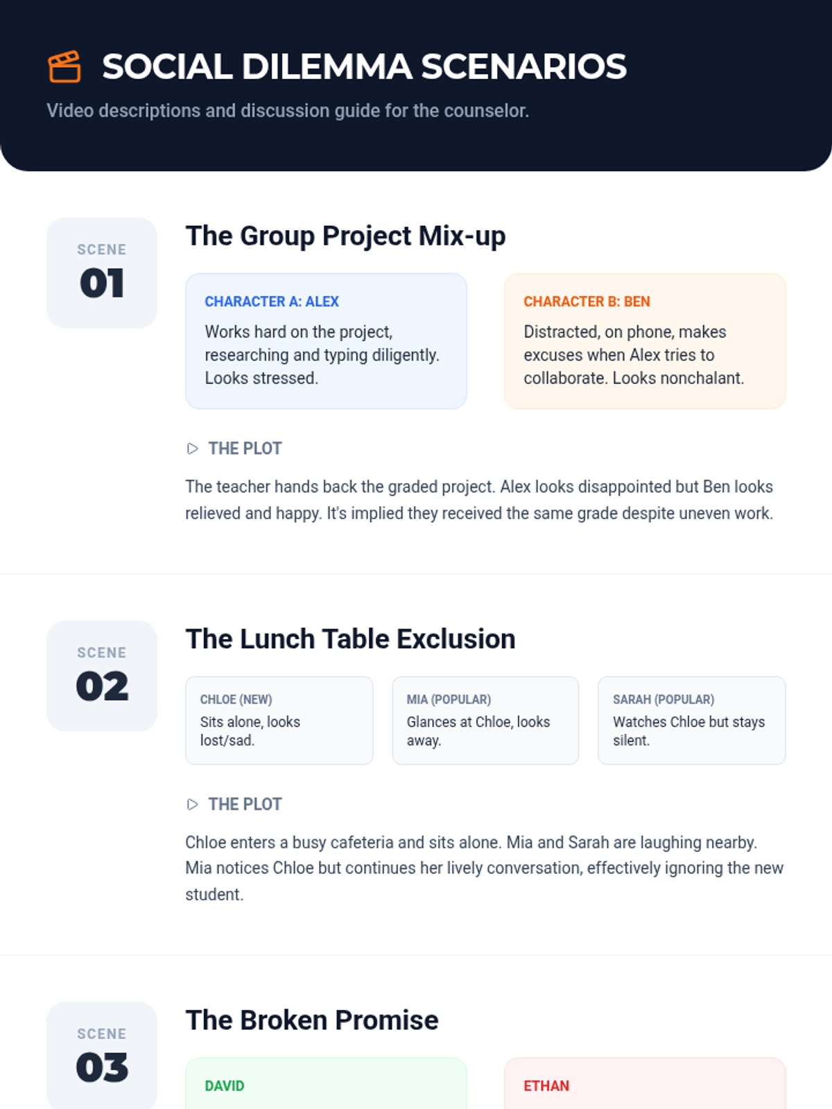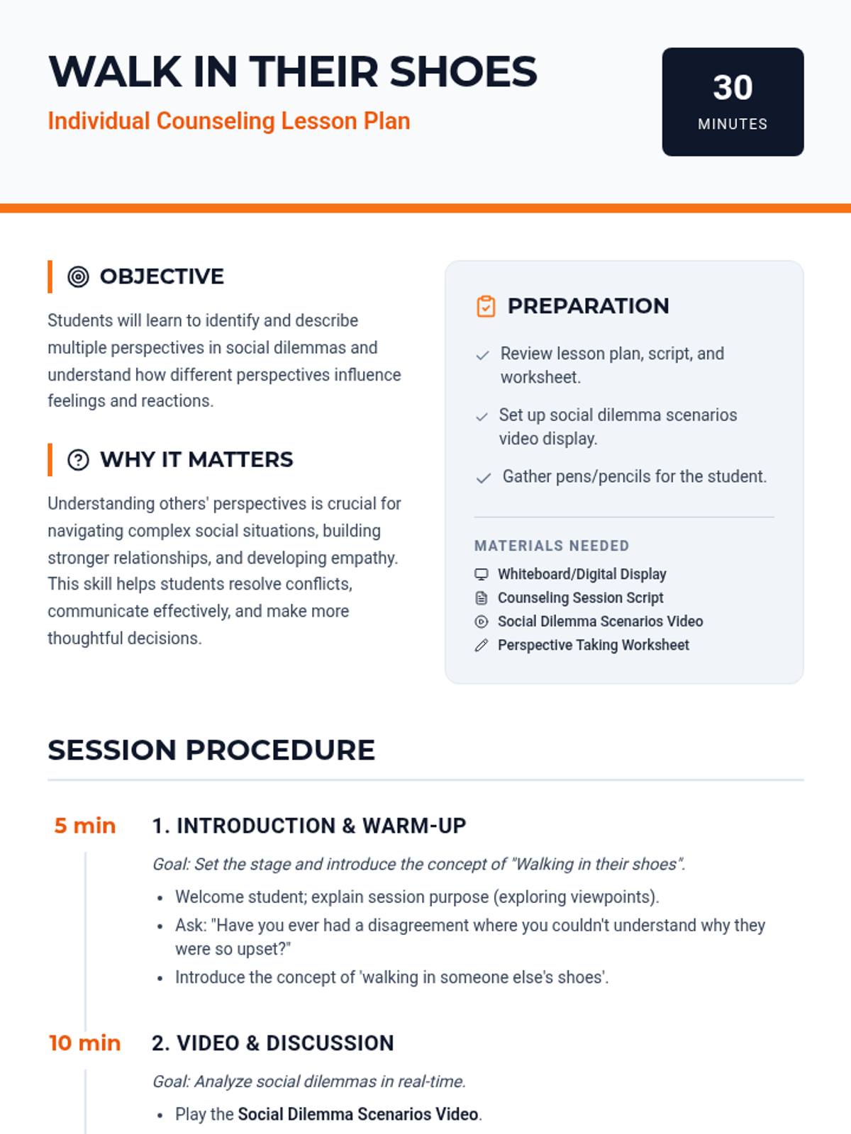 A 30-minute Tier 3 individual counseling session for 8th-grade students focused on perspective-taking and empathy through video analysis and scenario-based practice.