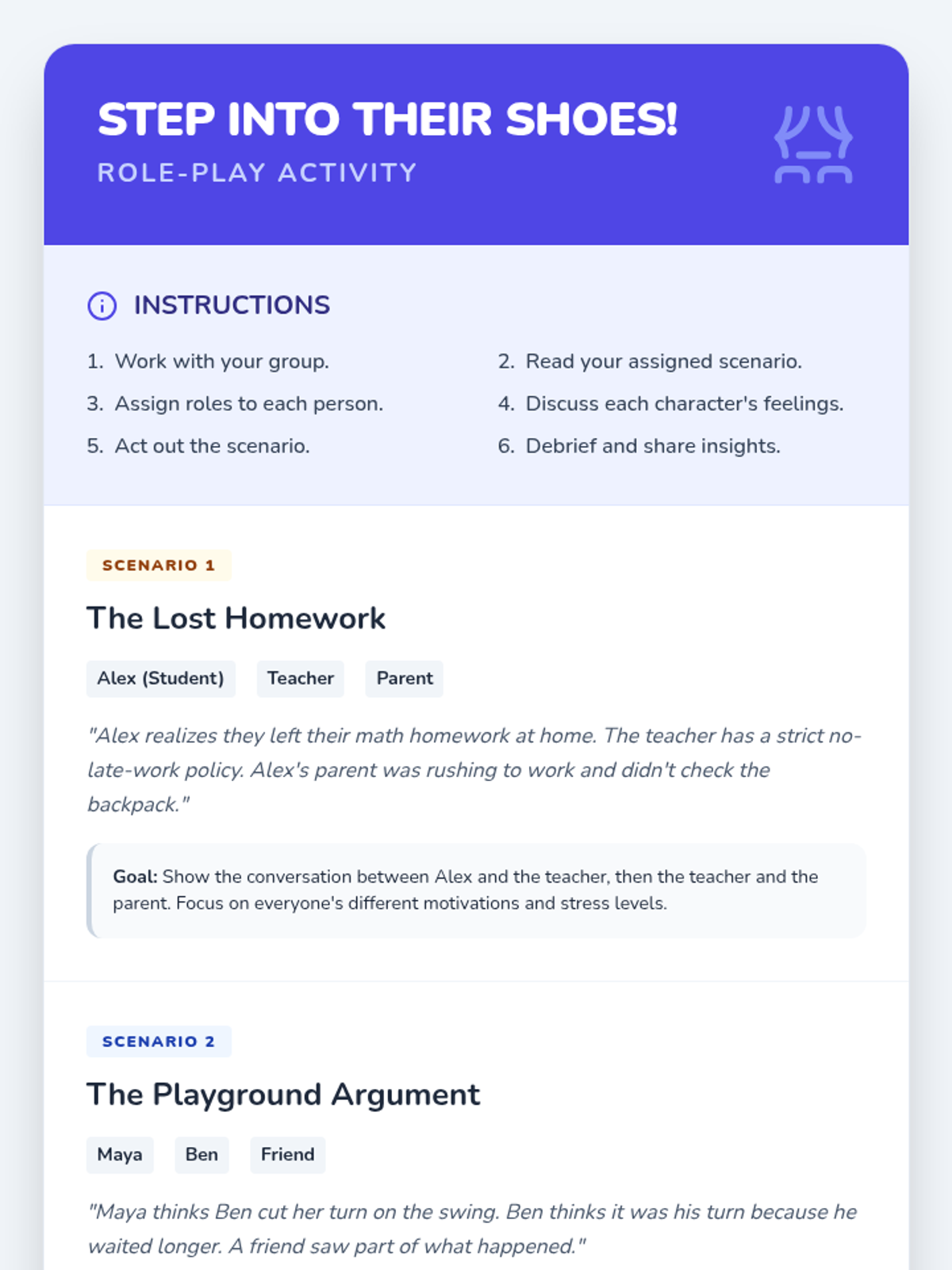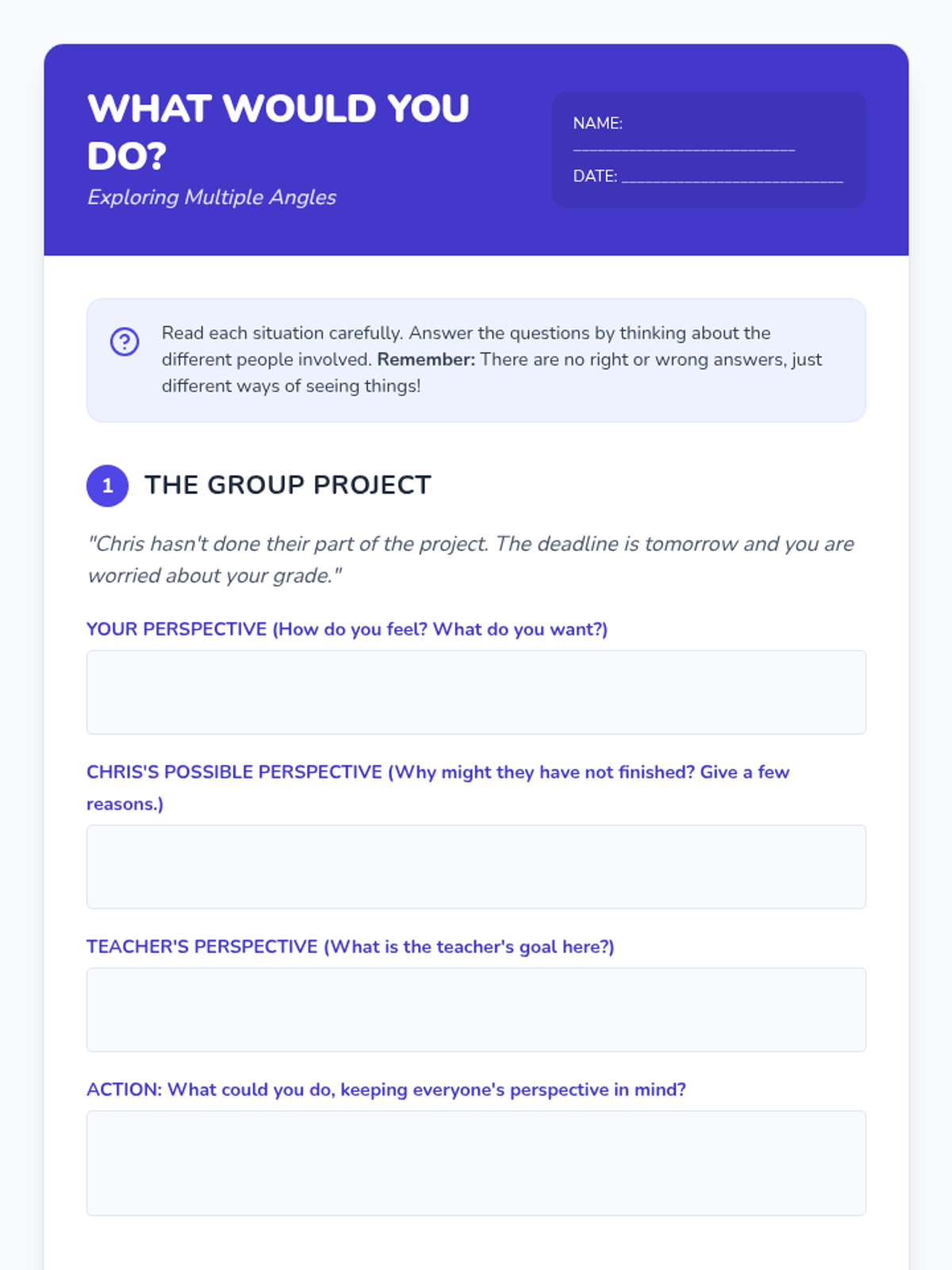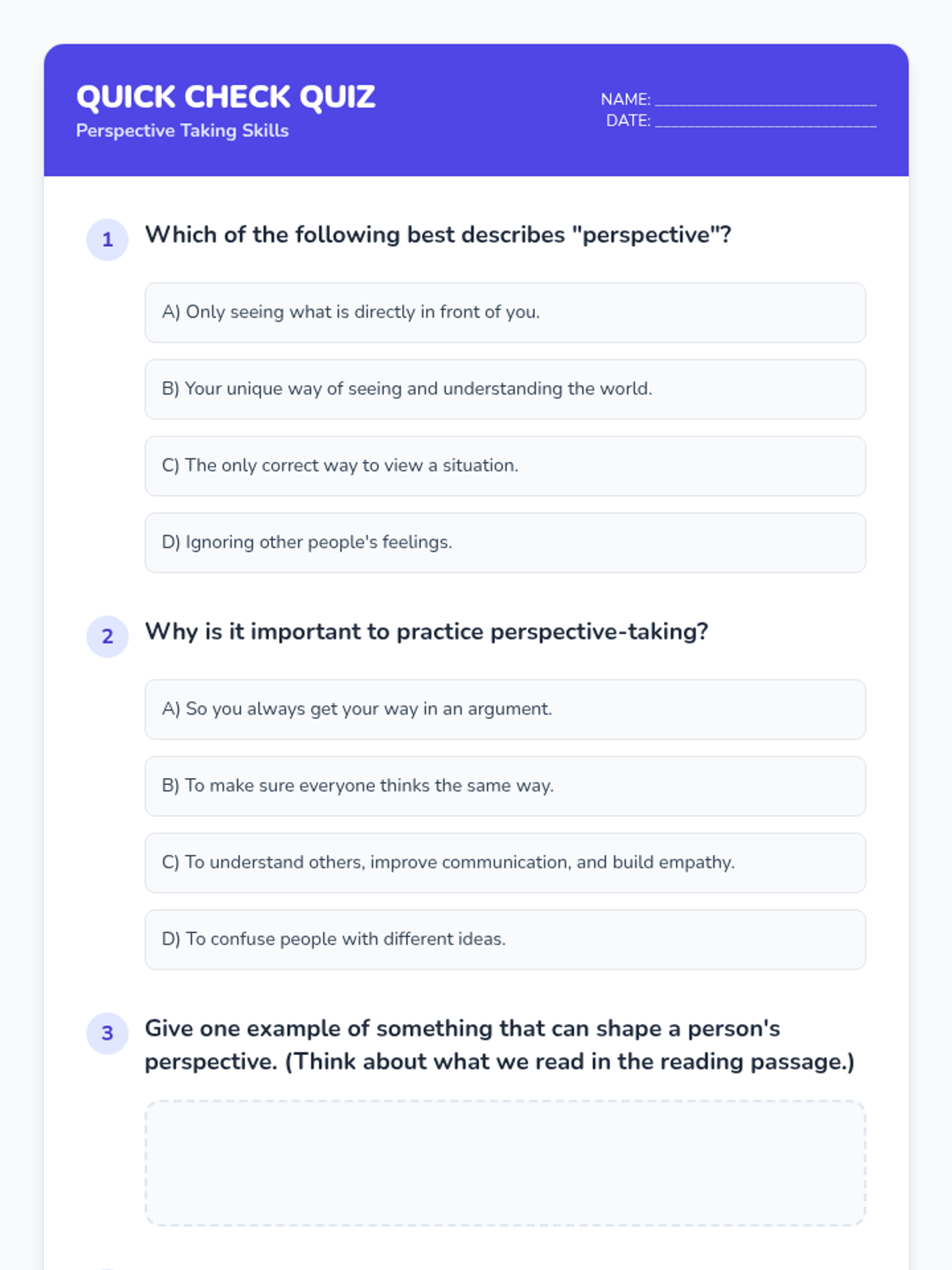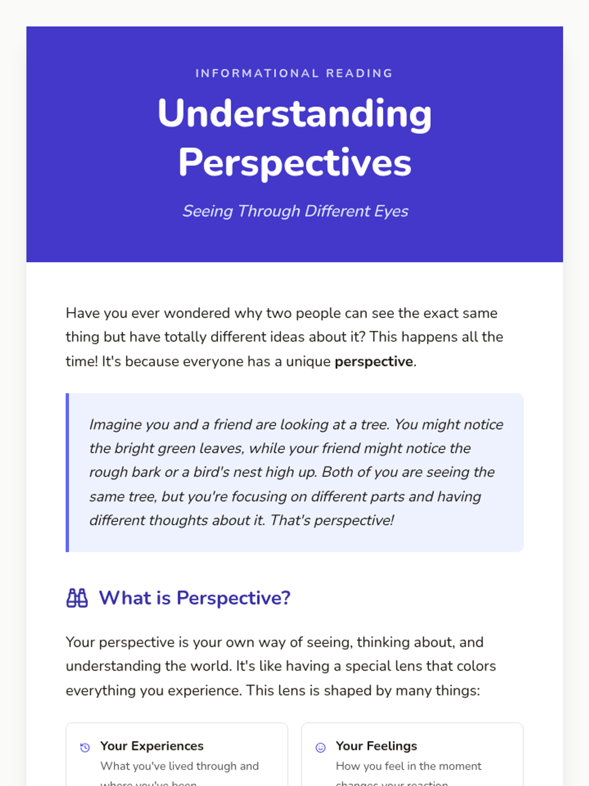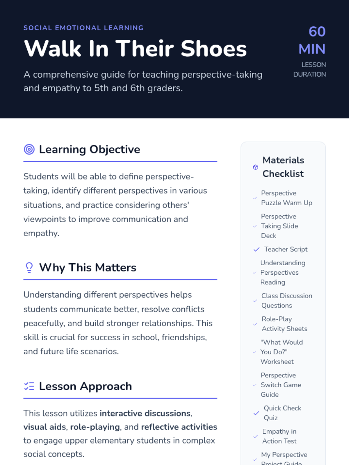 This lesson helps 5th and 6th-grade students understand and practice perspective-taking. Students will learn to recognize different viewpoints, fostering empathy and improving social interactions through interactive discussions, visual aids, role-playing, and reflective activities.