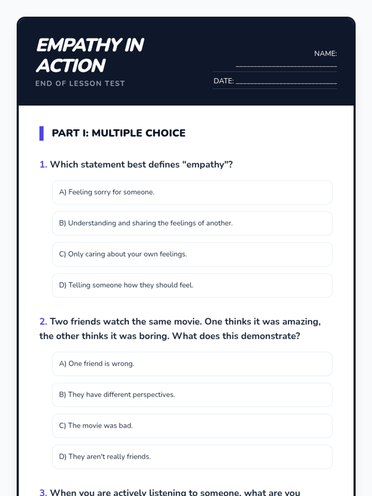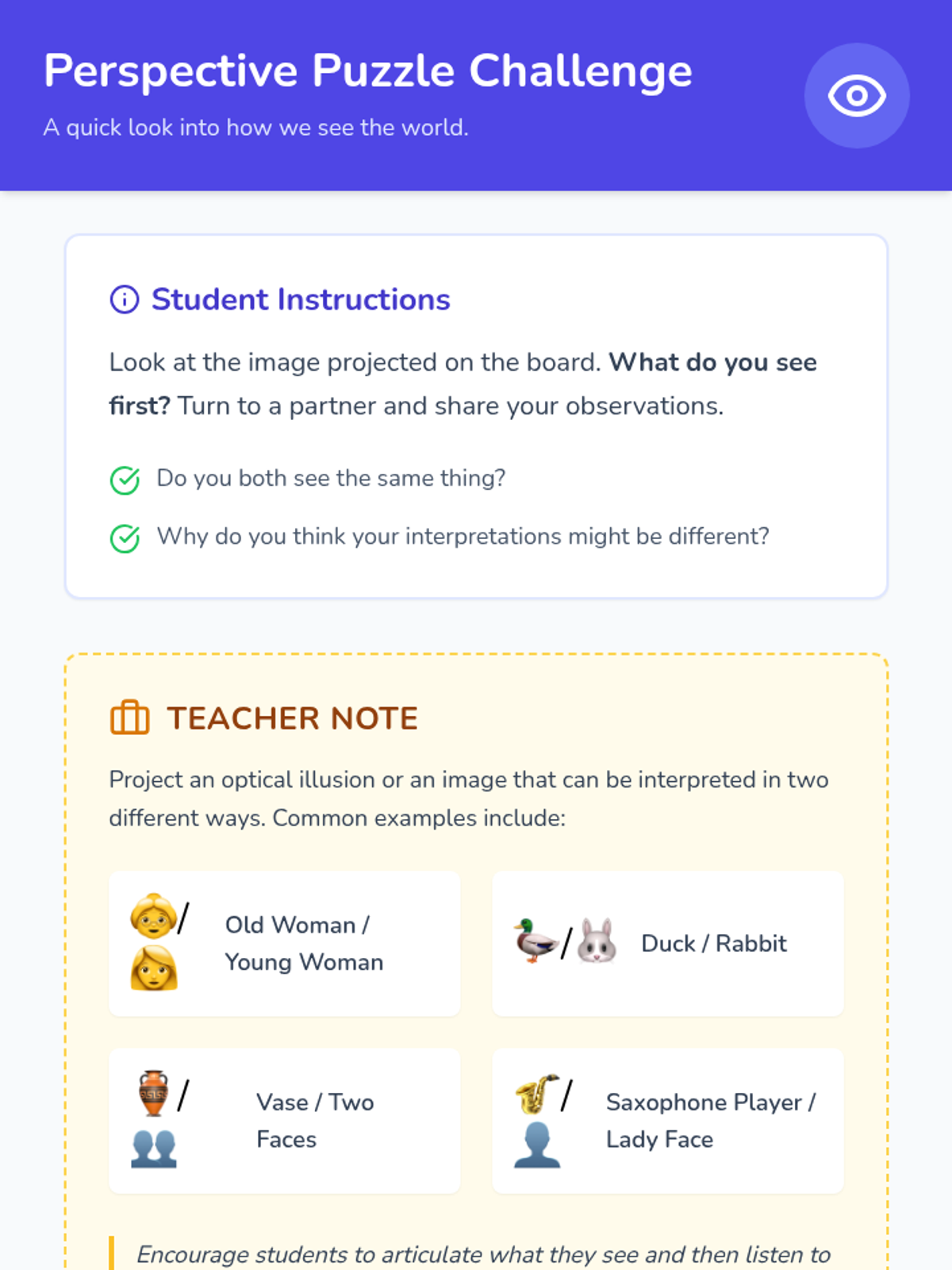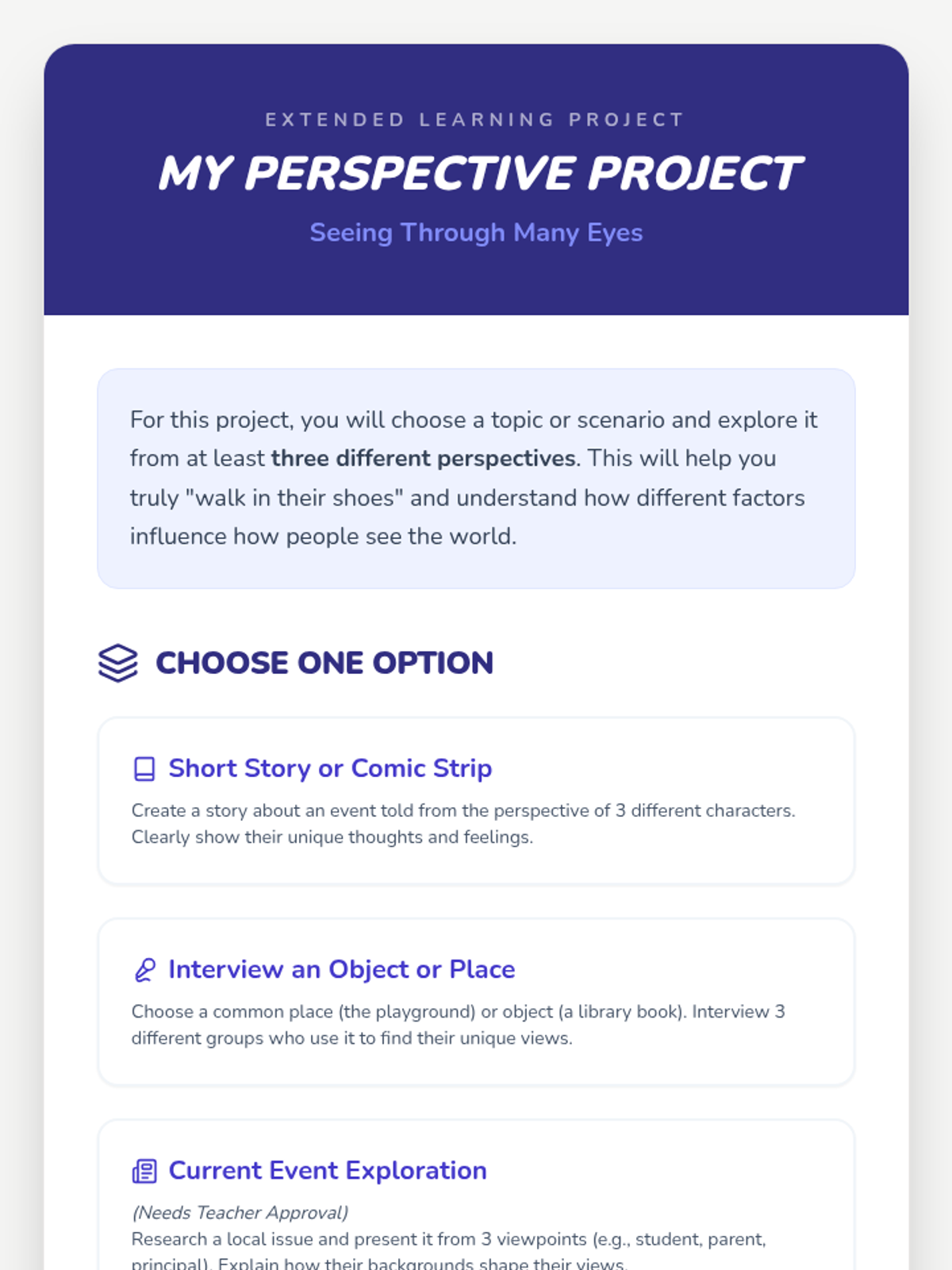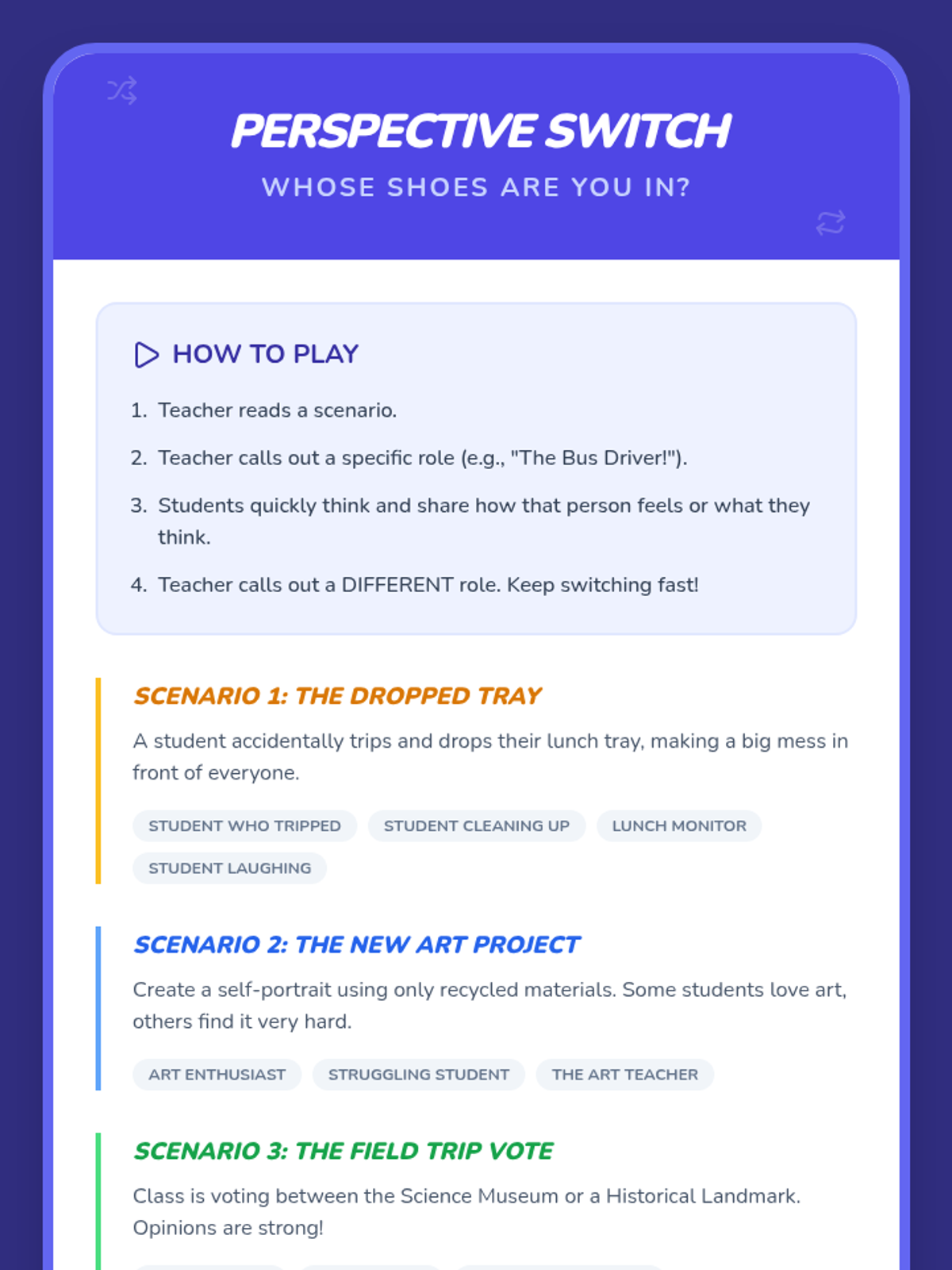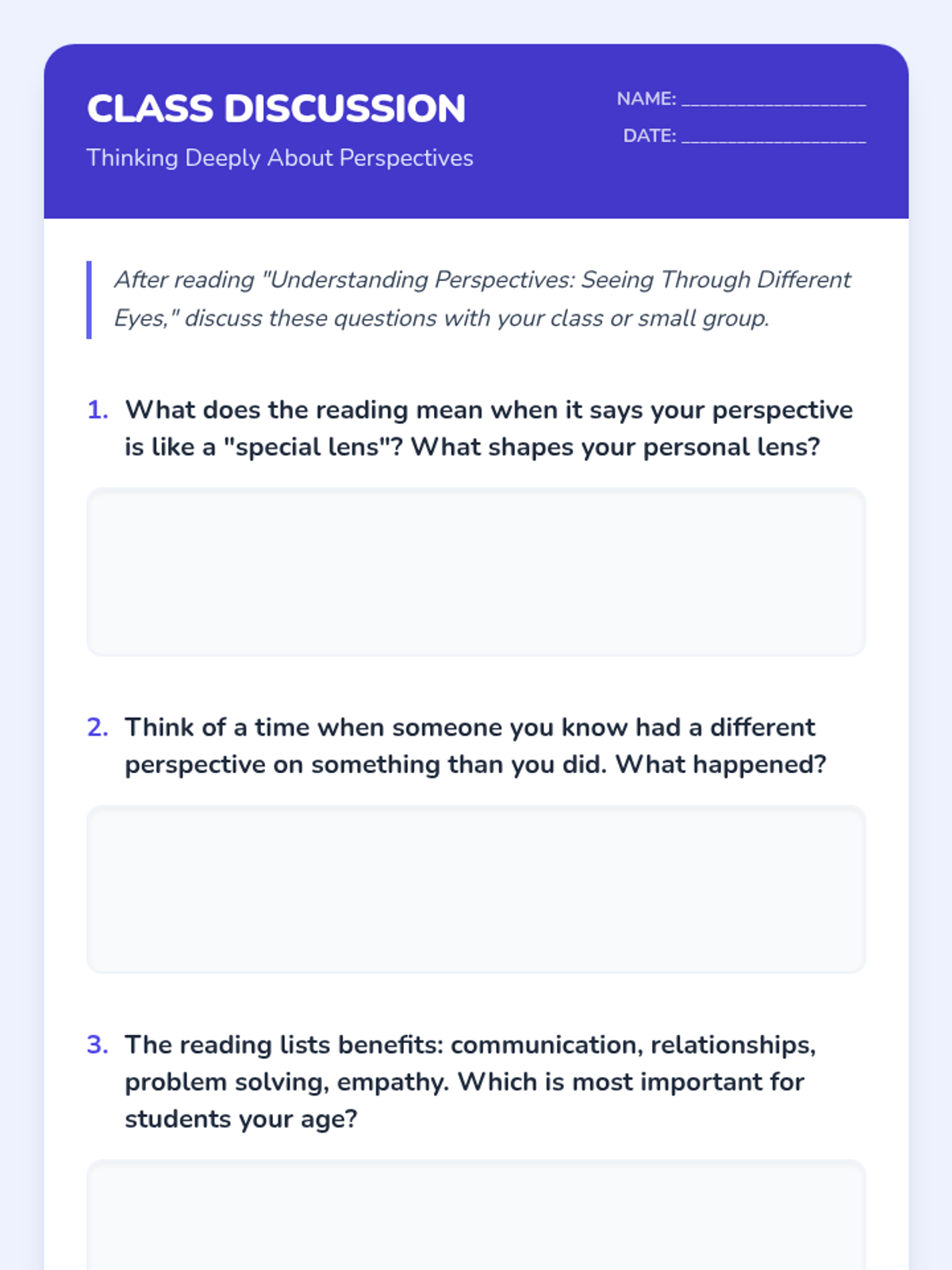 This lesson helps 5th and 6th-grade students understand and practice perspective-taking. Students will learn to recognize different viewpoints, fostering empathy and improving social interactions through interactive discussions, visual aids, role-playing, and reflective activities.