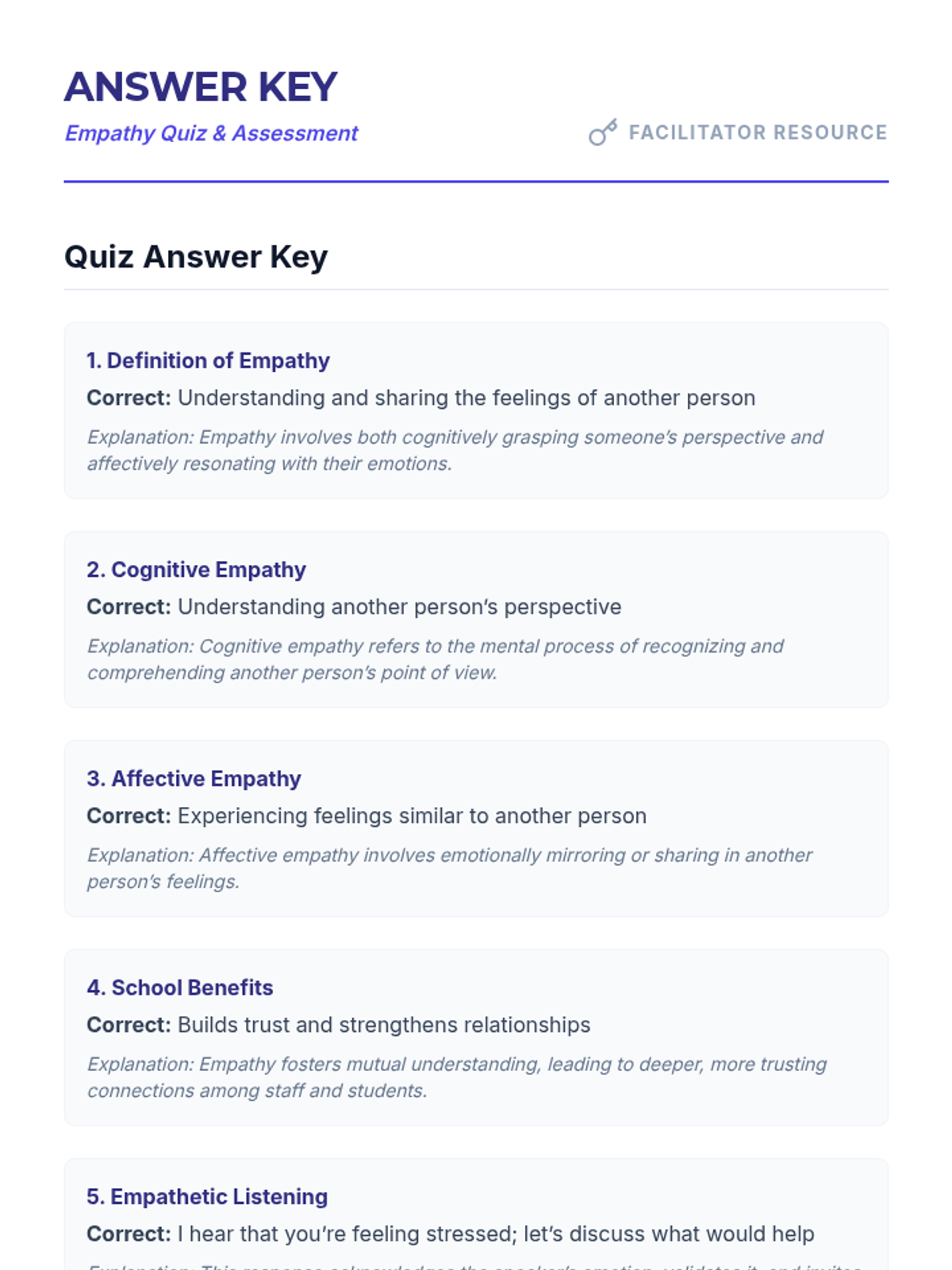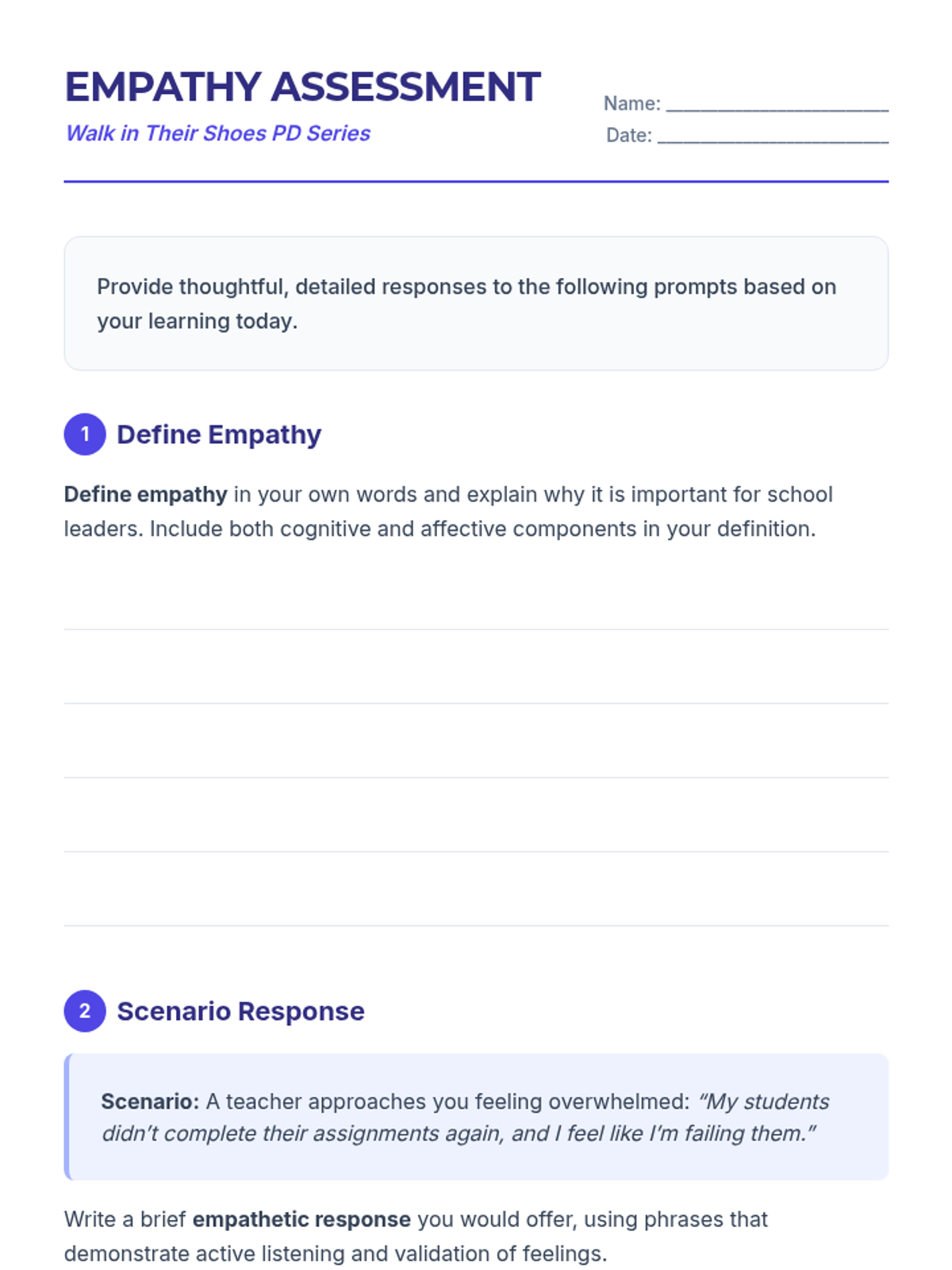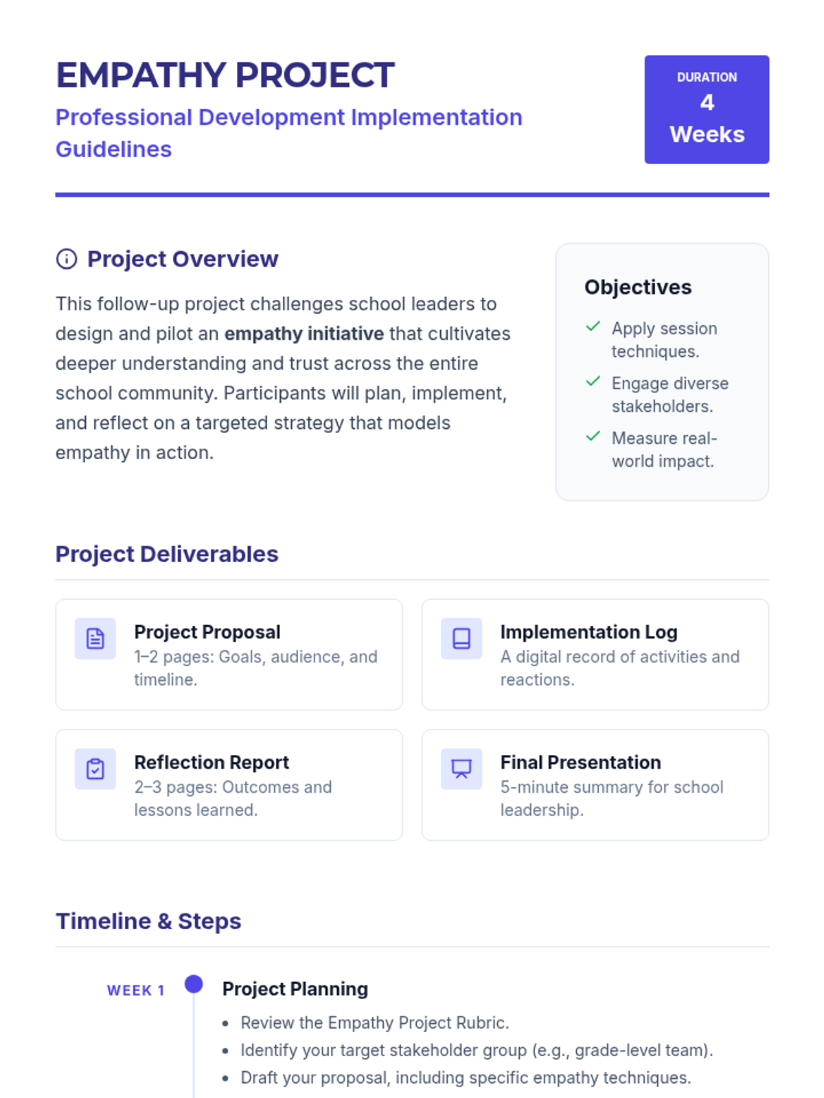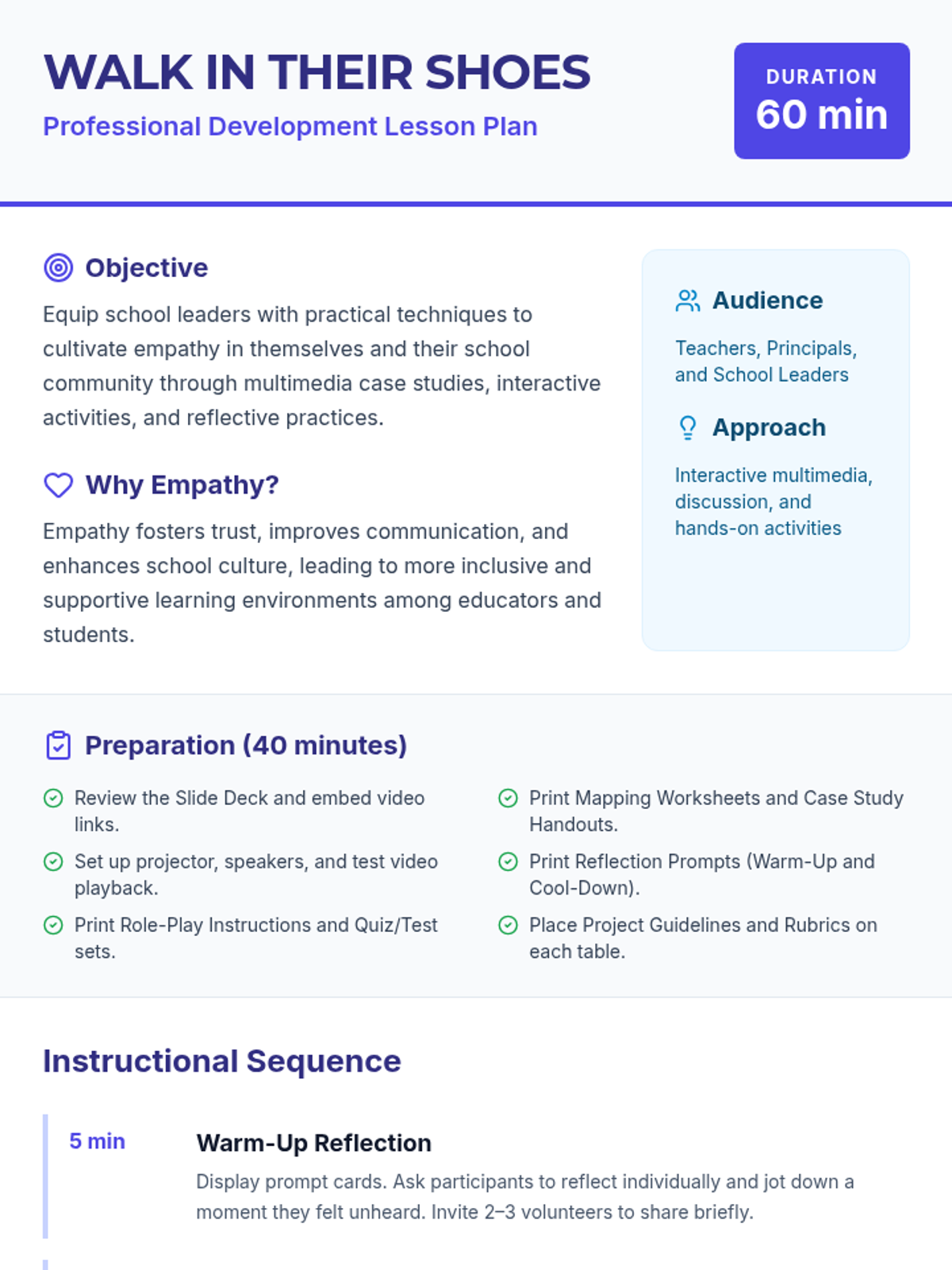 A one-hour professional development session for school leaders focused on cultivating and modeling empathy within the school community. This interactive session uses multimedia, case studies, and hands-on activities to build practical leadership skills.