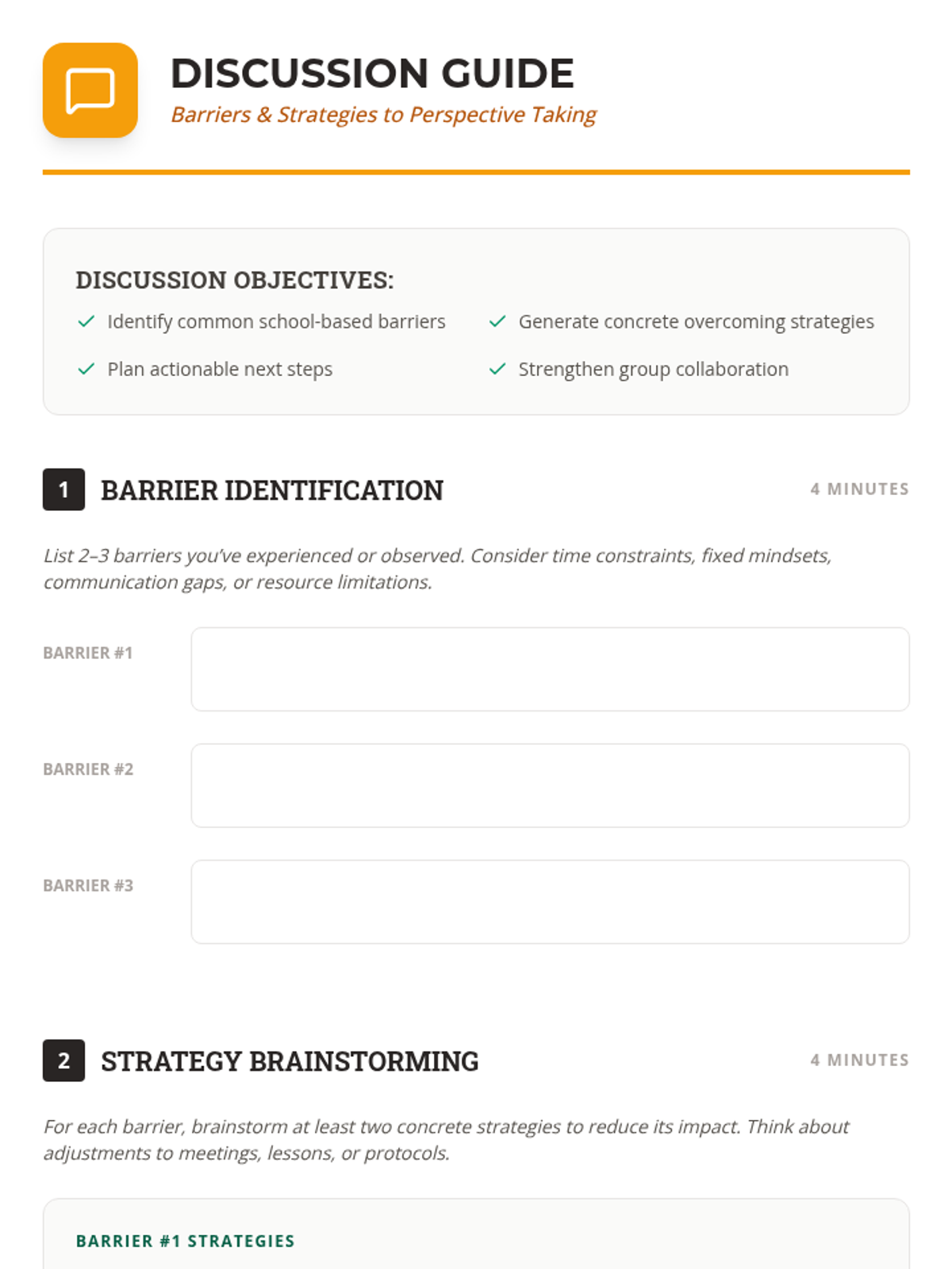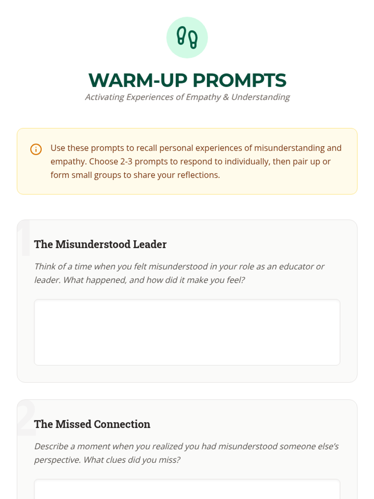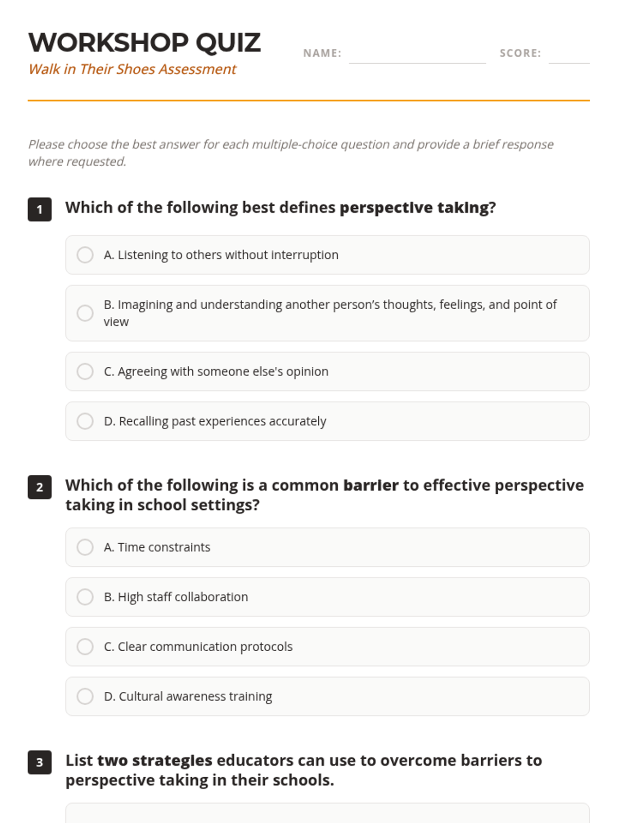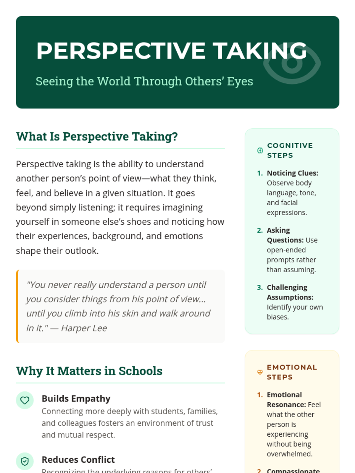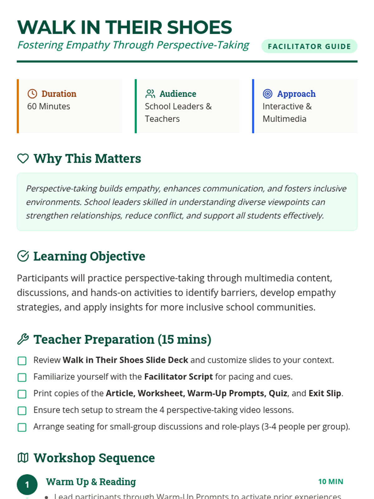 A one-hour workshop for school leaders and educators to practice perspective taking and foster empathy within their school communities through interactive activities and multimedia.