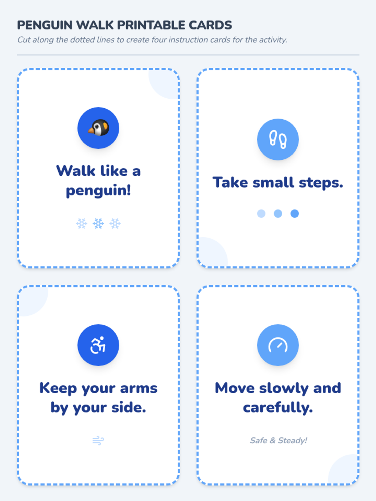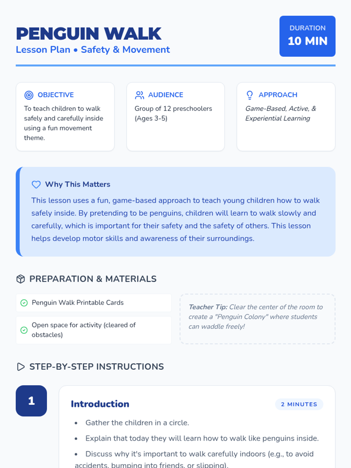 A fun, active lesson for preschoolers that uses a penguin theme to teach safe indoor walking habits through movement and play.