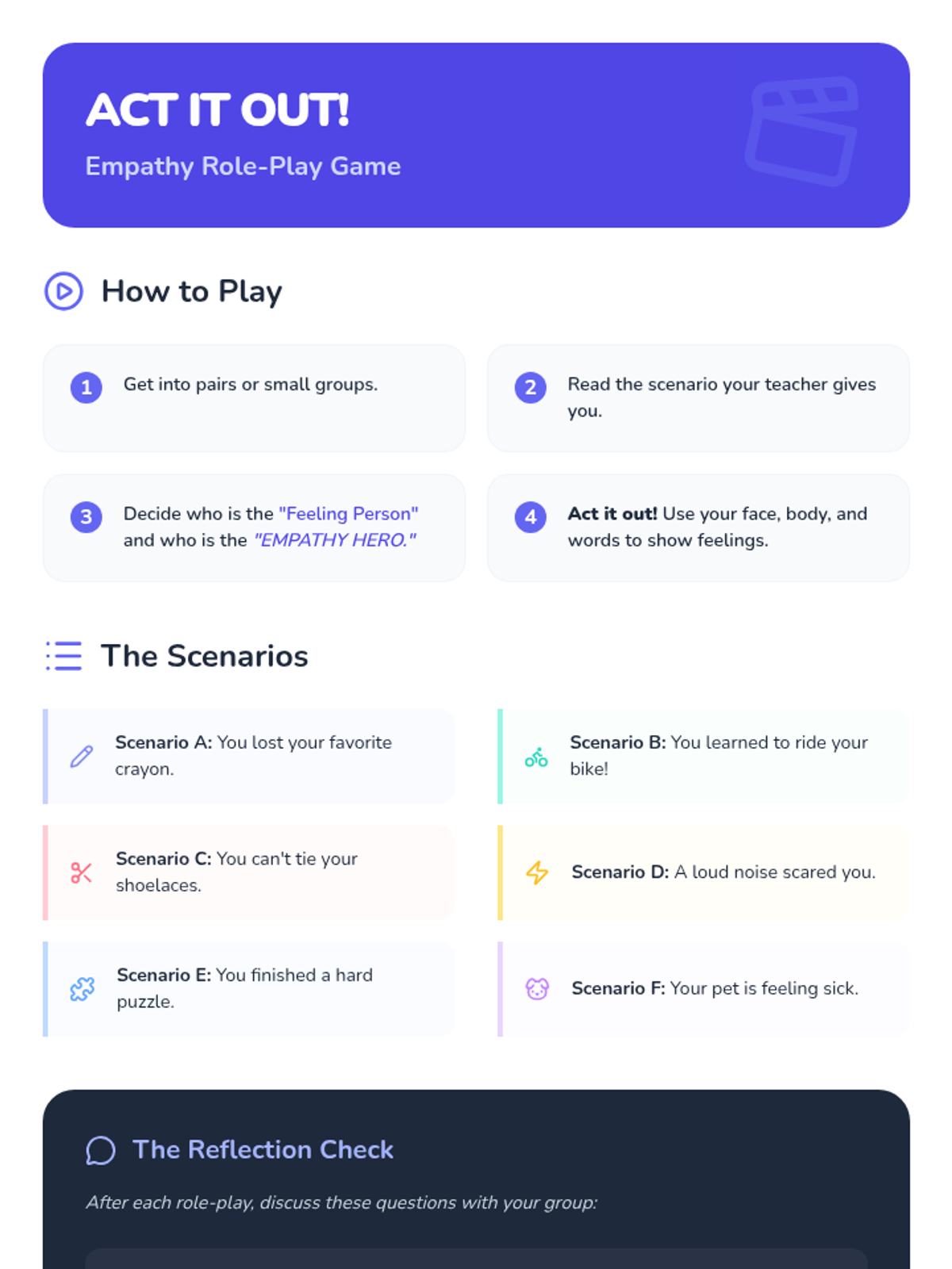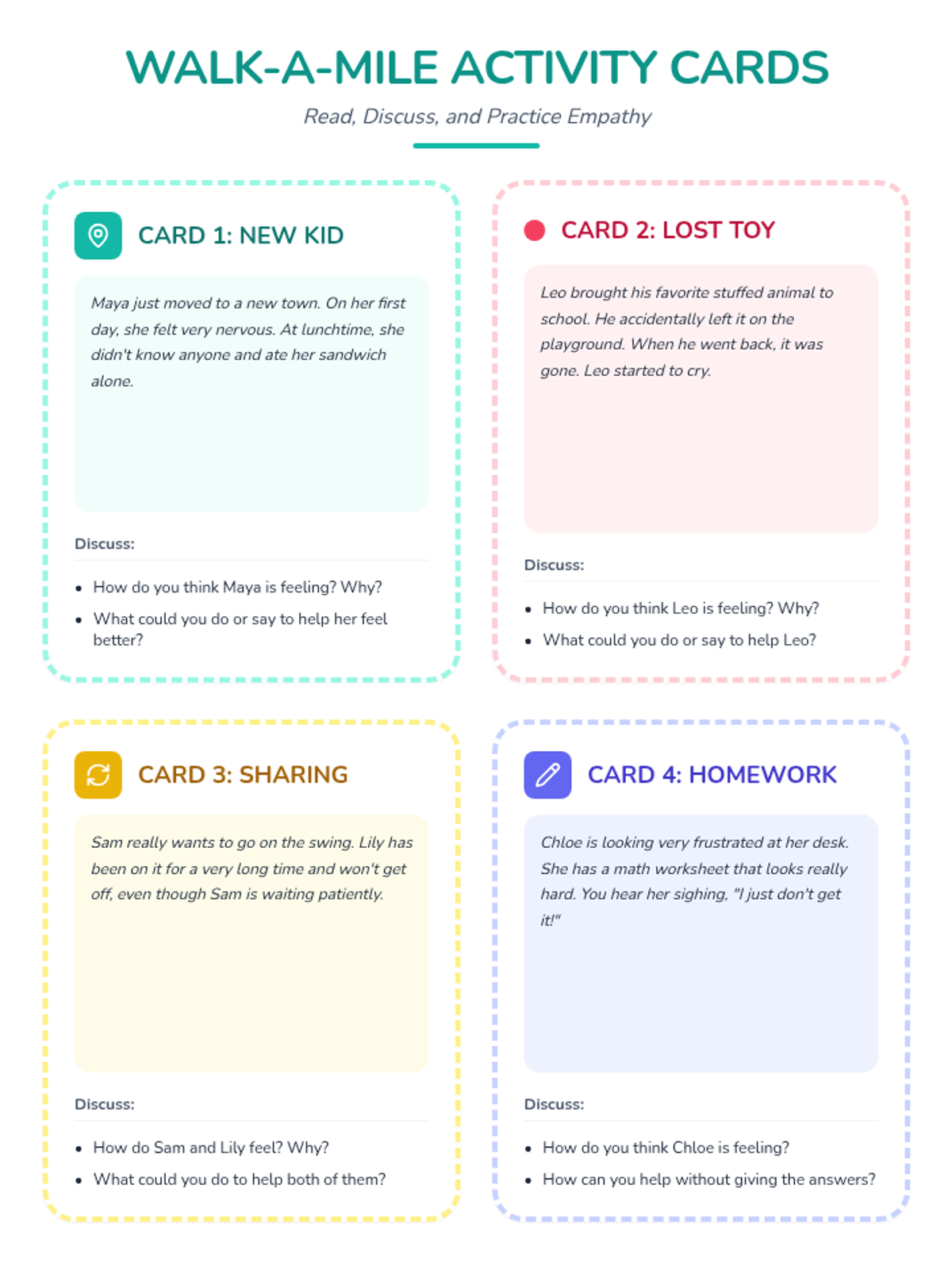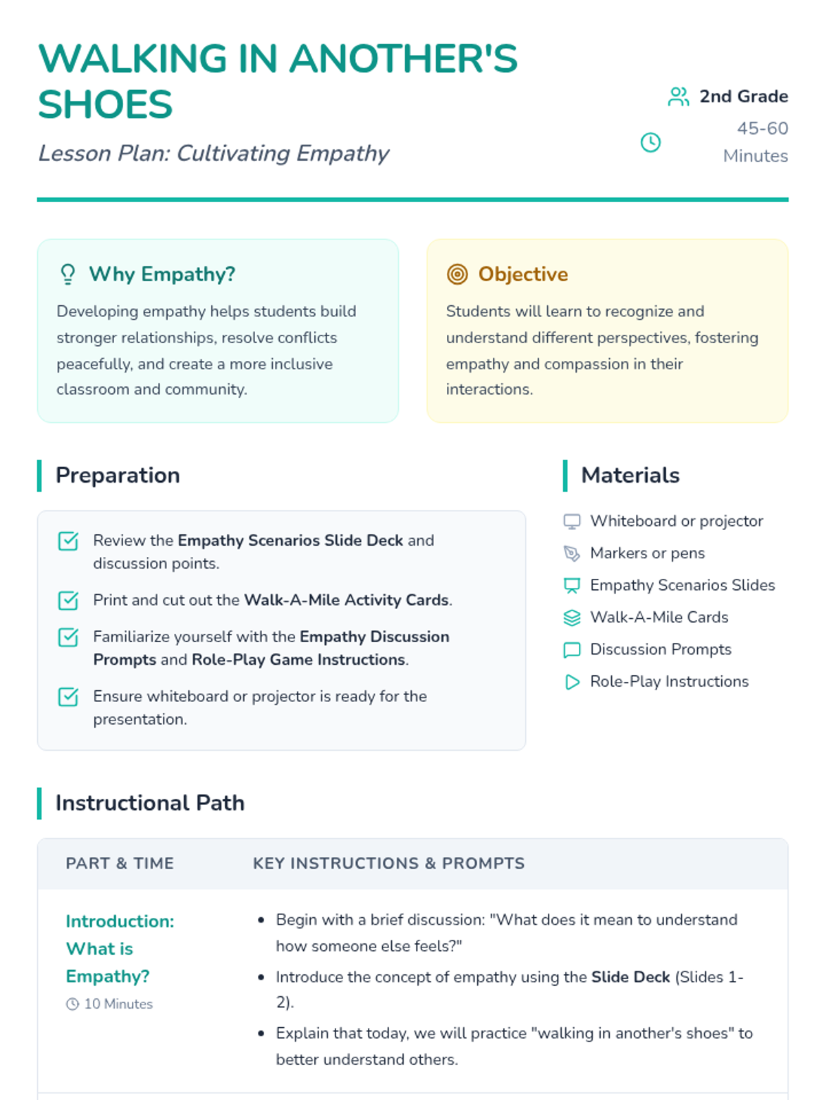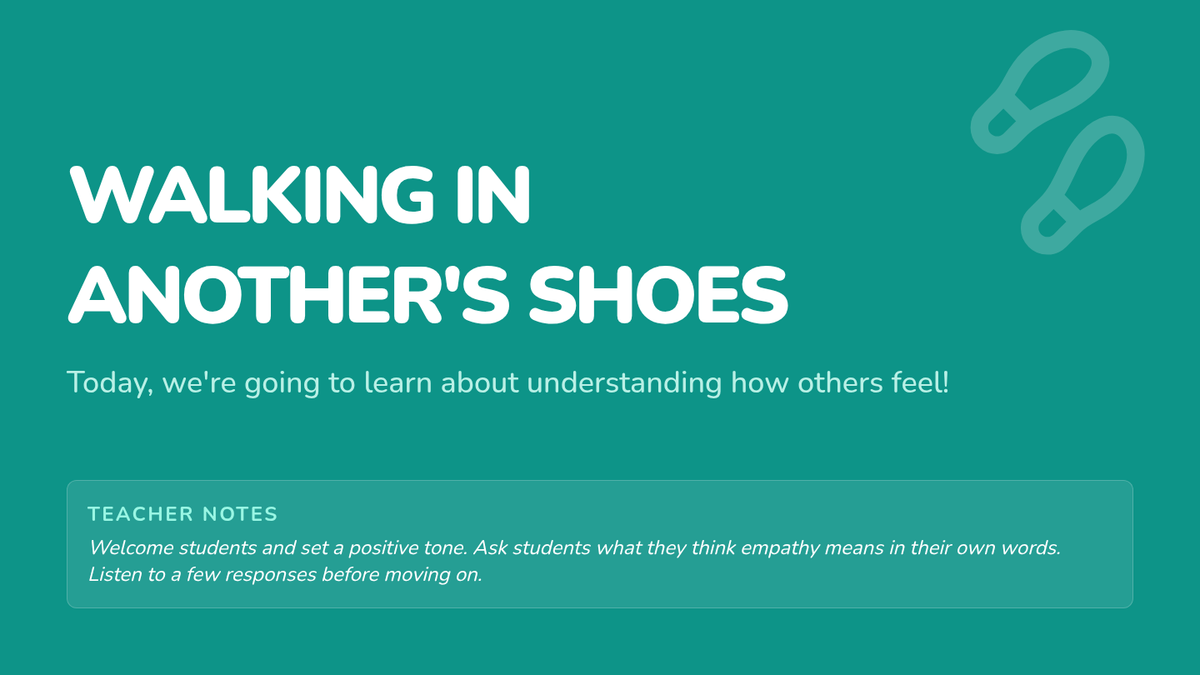 A lesson for 2nd graders to cultivate empathy by exploring different perspectives through scenarios, role-play, and discussion. Students will learn to 'walk in another's shoes' to understand and respond to the emotions of their peers.