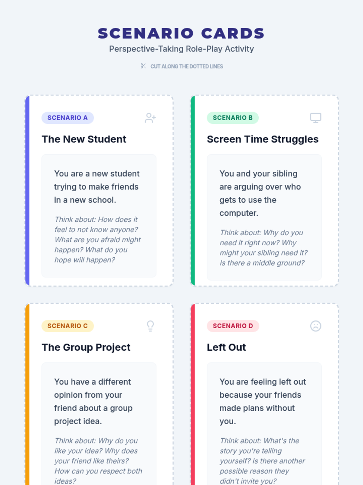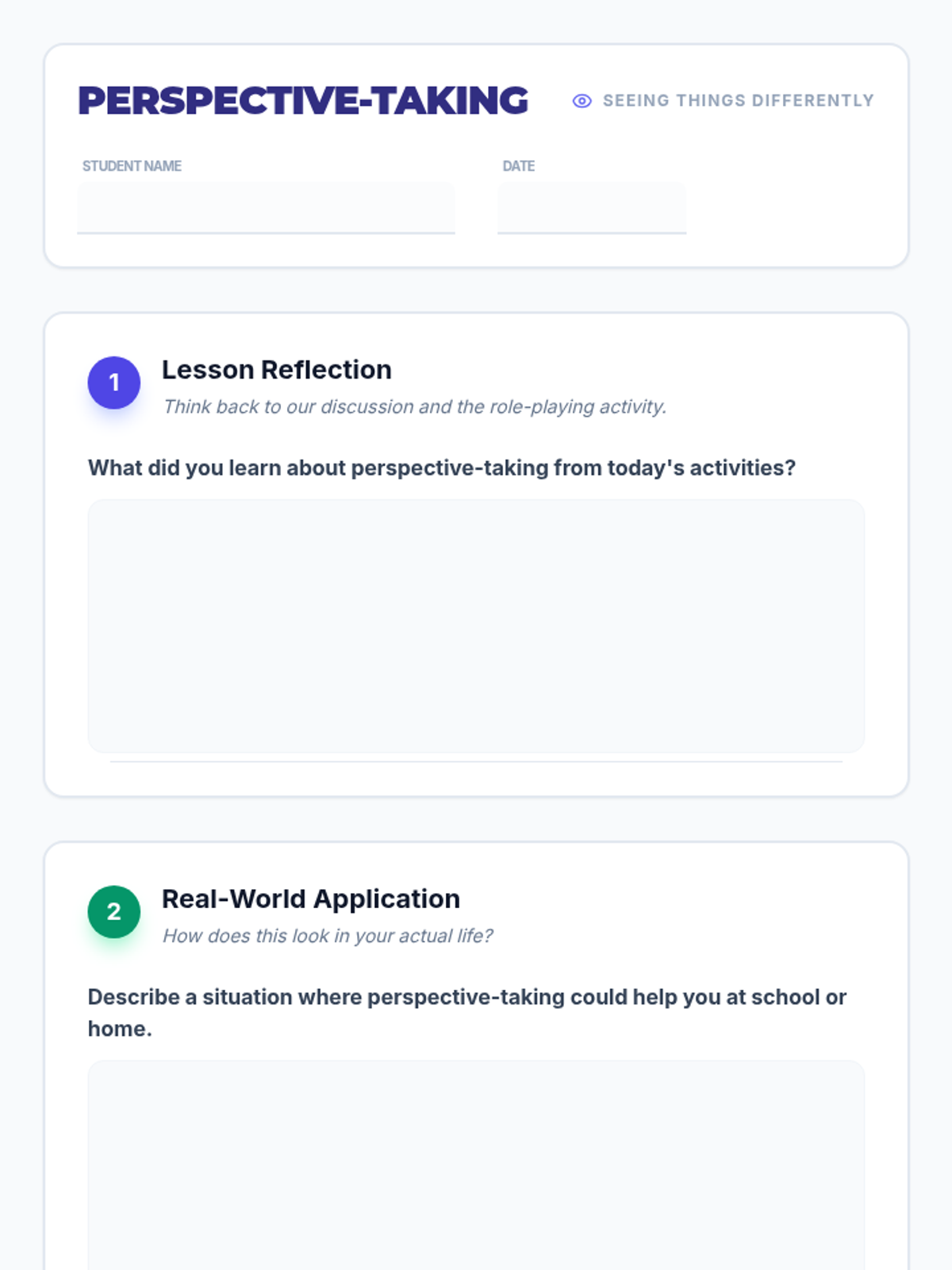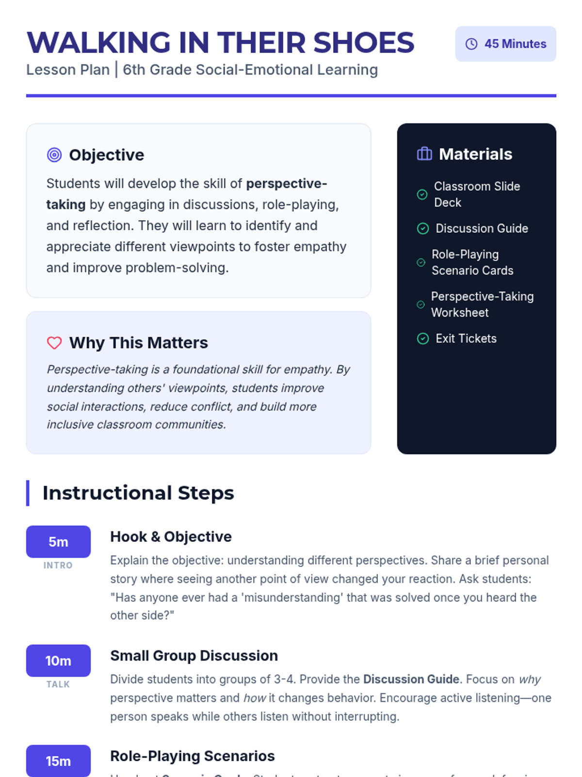 A 6th-grade lesson focused on developing perspective-taking skills through role-play, discussion, and reflection to foster empathy and social-emotional growth.