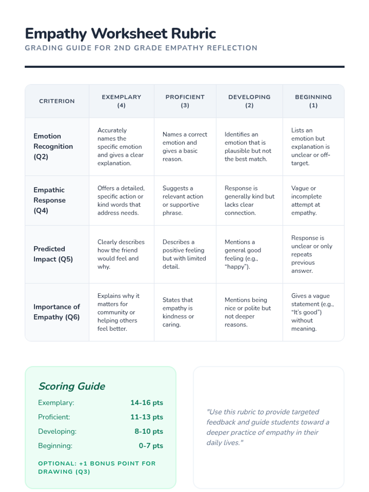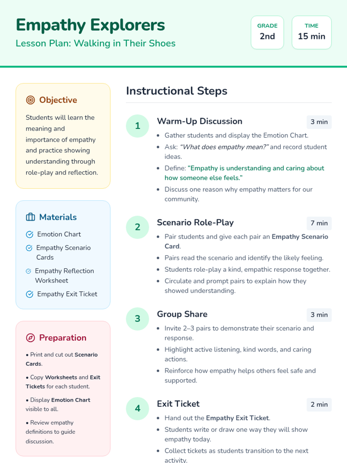 A 15-minute 2nd-grade lesson on empathy, focusing on understanding others' feelings and practicing kind responses through role-play and reflection.