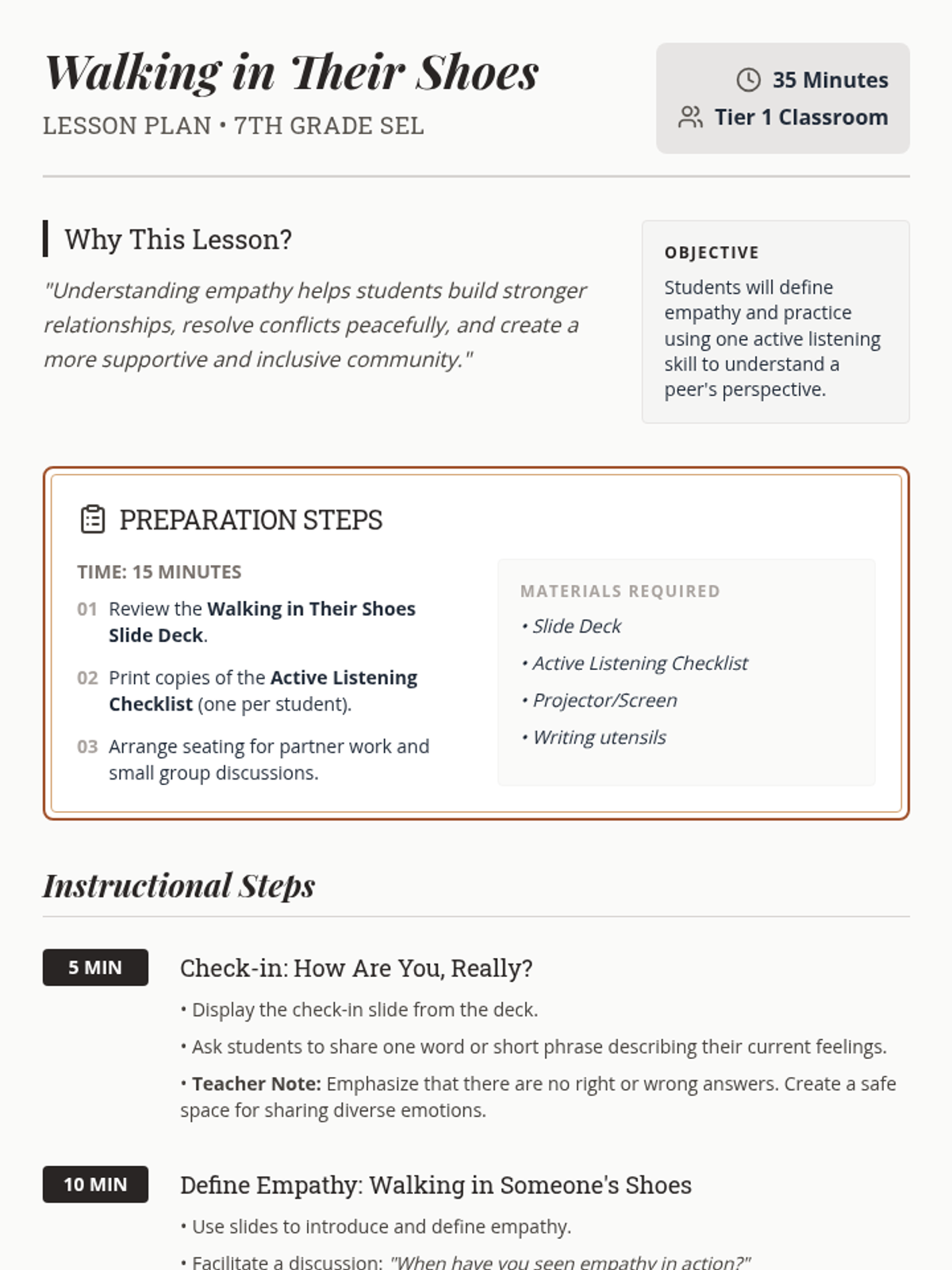 A 35-minute lesson for 7th graders to define empathy and practice active listening through partner activities and scenario discussions.
