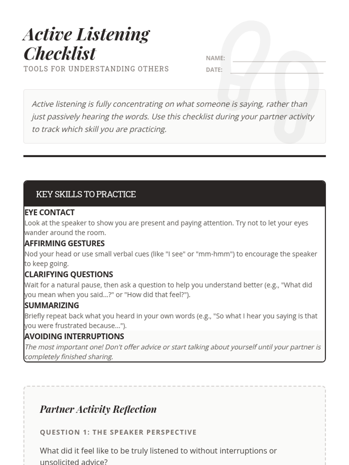 Developing advanced listening skills, including paraphrasing and validating others' perspectives in English.