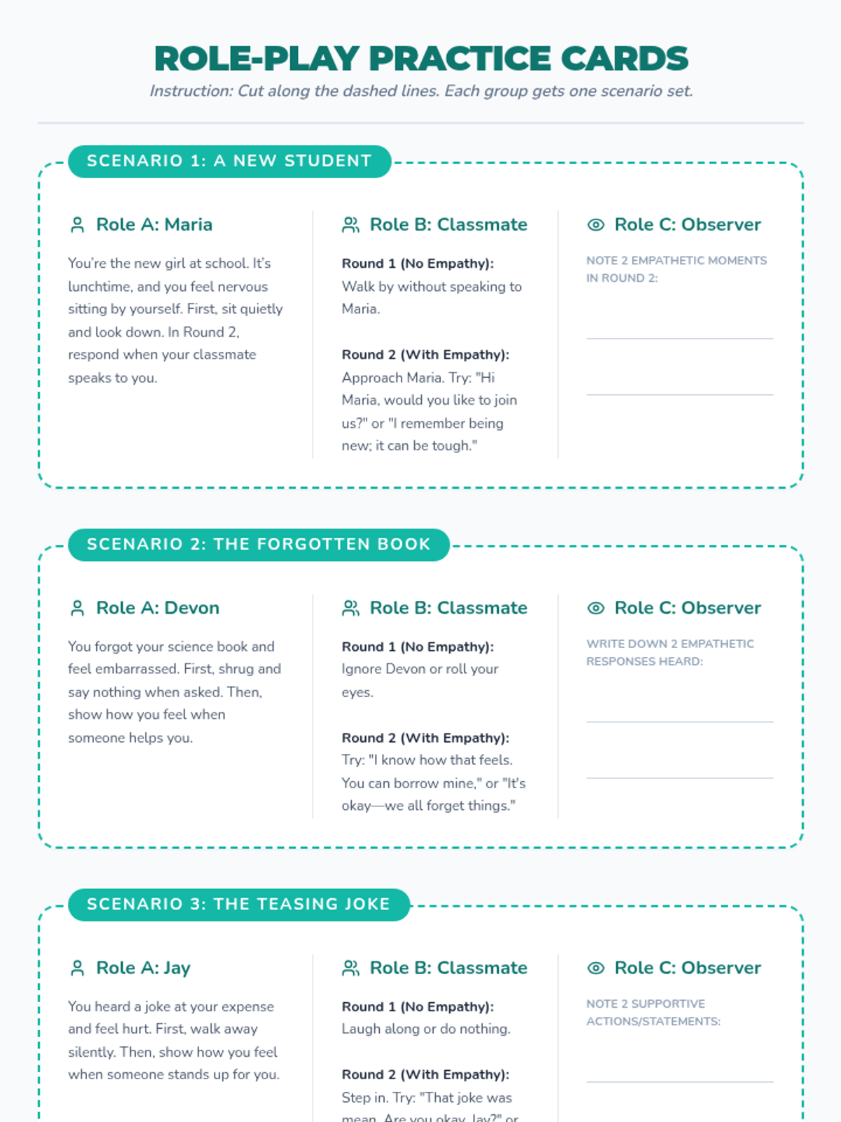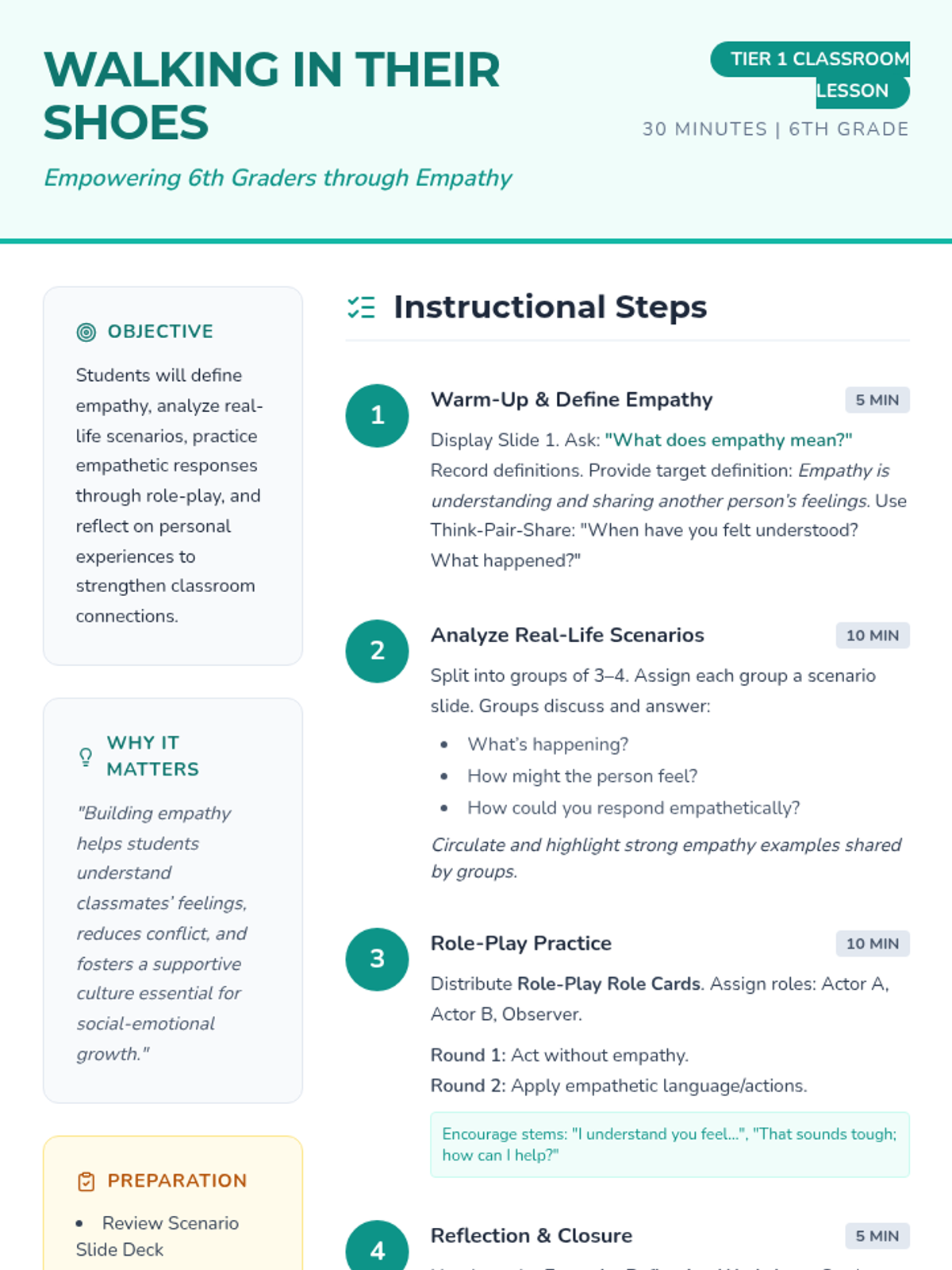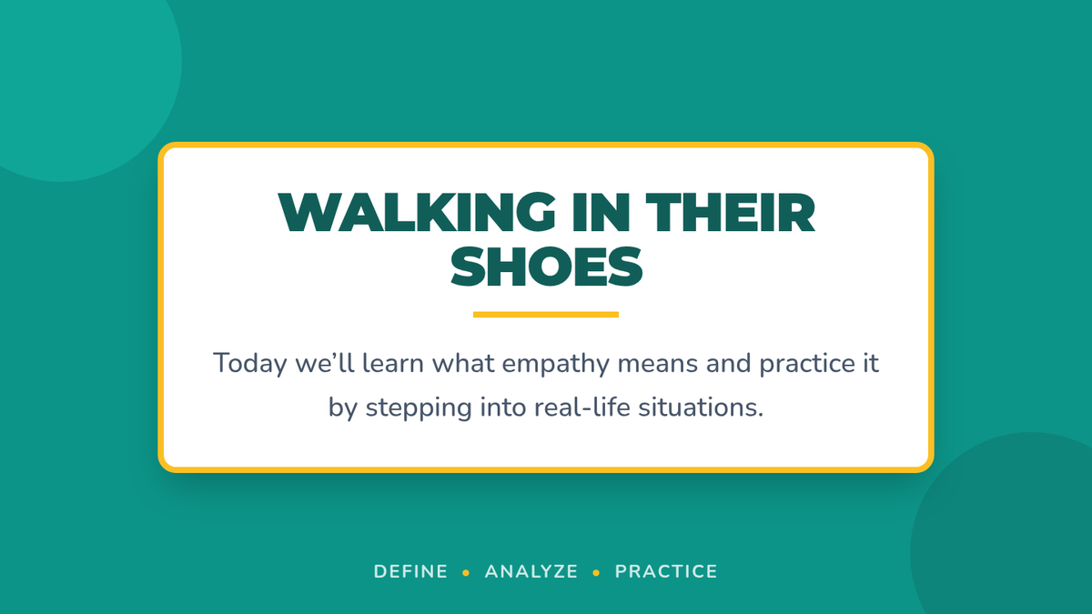 A 30-minute blended lesson for 6th graders to define, practice, and reflect on empathy through real-life scenarios and role-play. Students build community by 'walking in the shoes' of others.