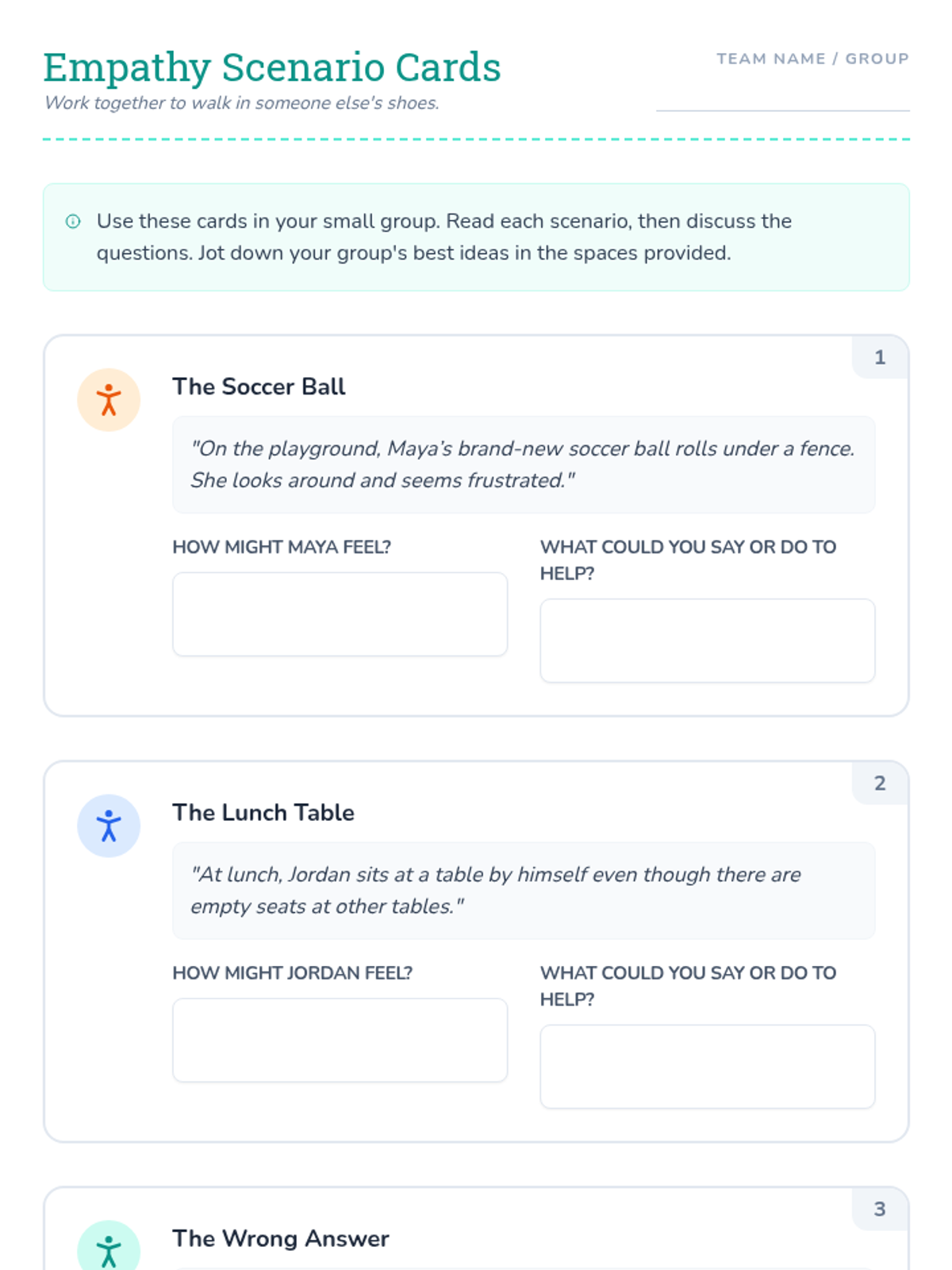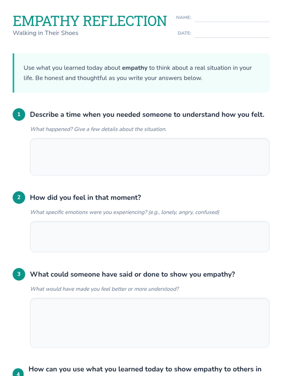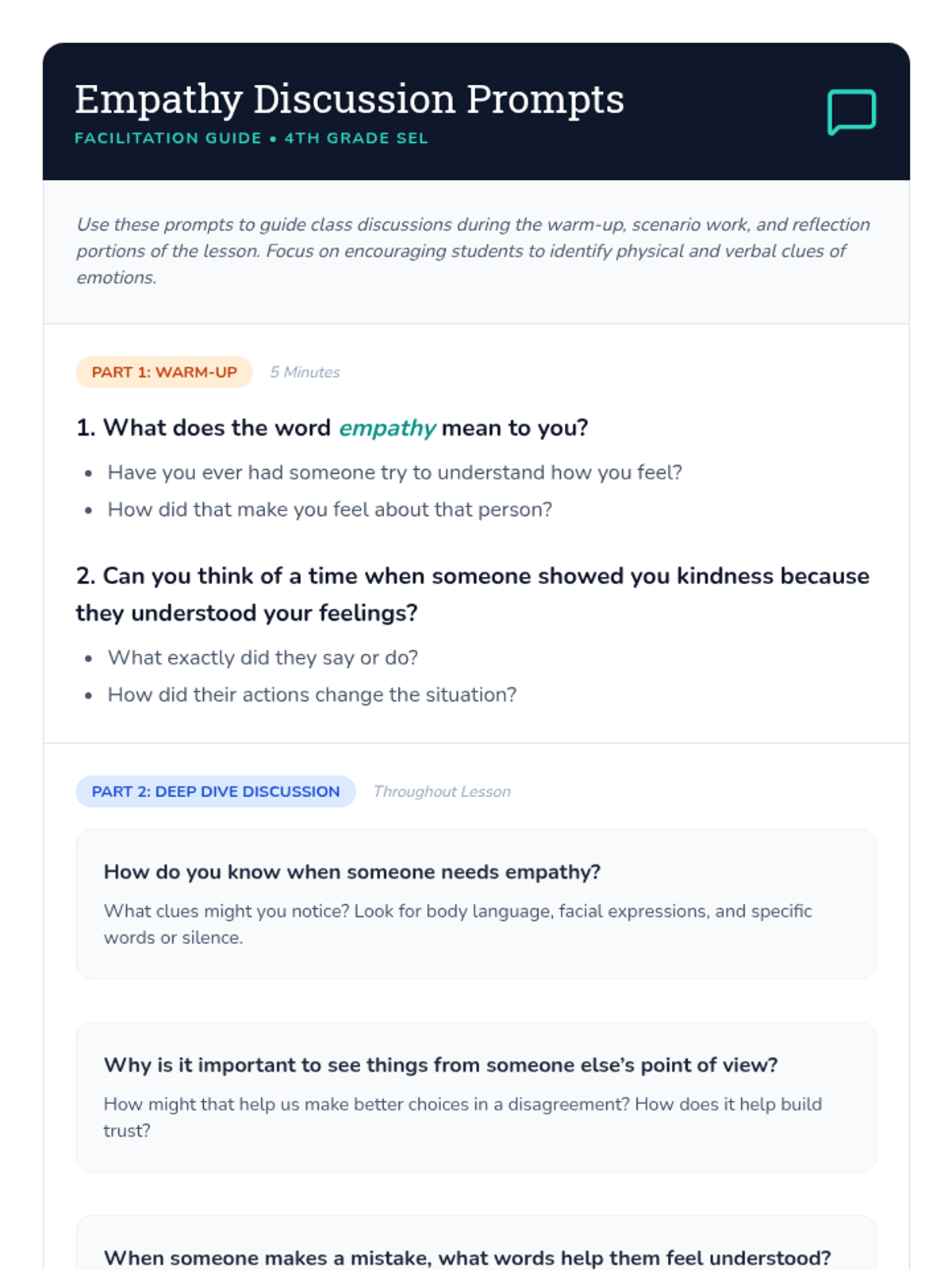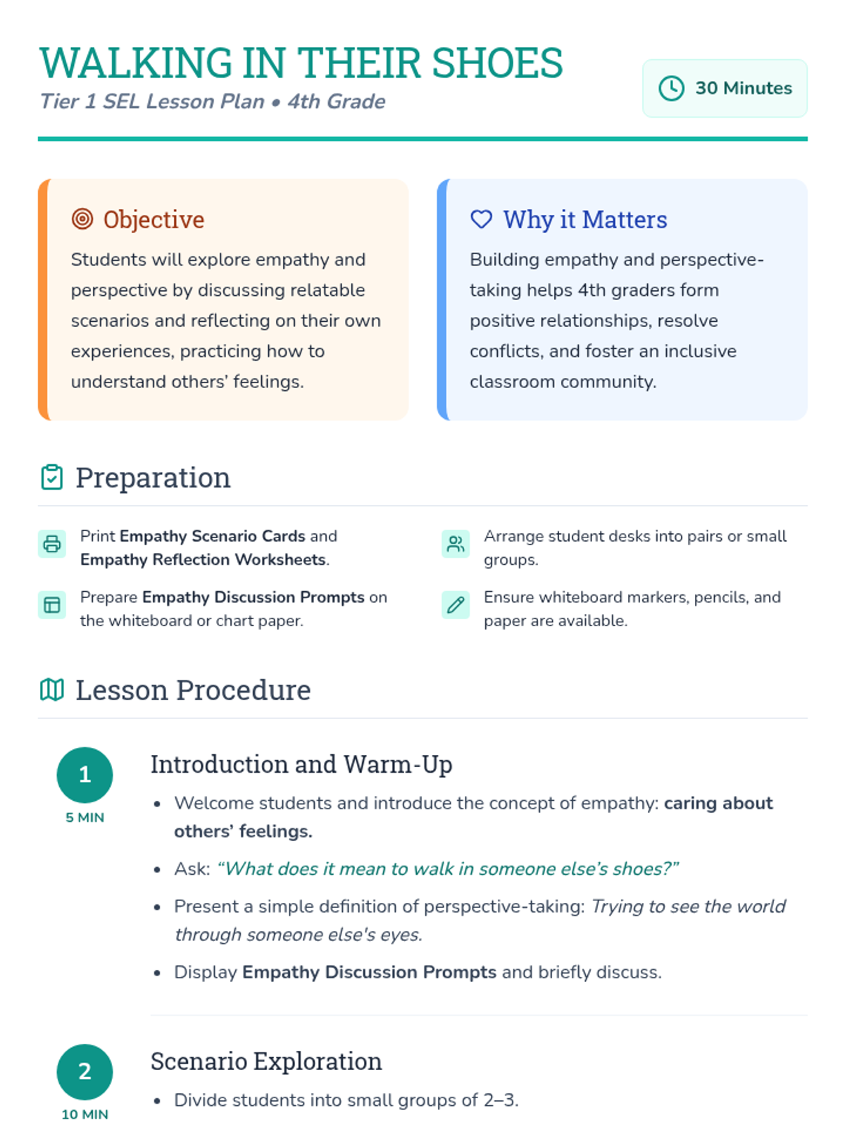 A 30-minute Tier 1 SEL lesson for 4th graders focused on empathy and perspective-taking through relatable scenarios and personal reflection.