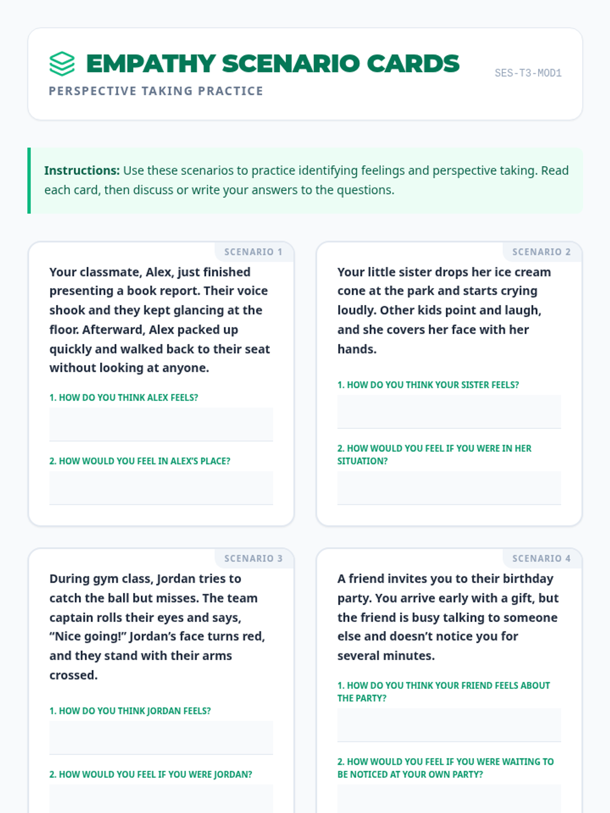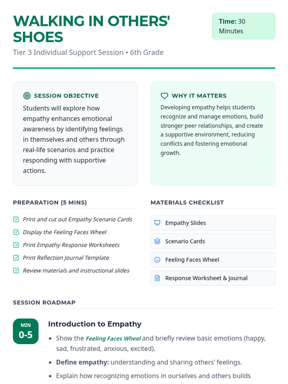 A 30-minute Tier 3 individual session for 6th graders to explore empathy, identify emotions, and practice supportive responses to build stronger relationships.