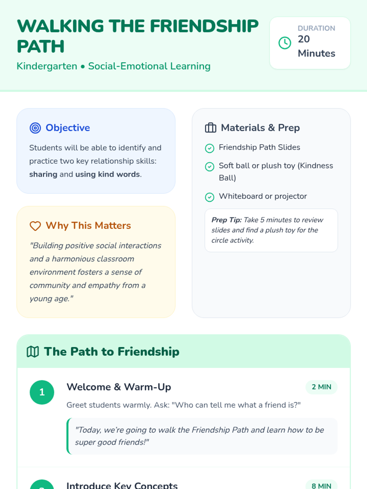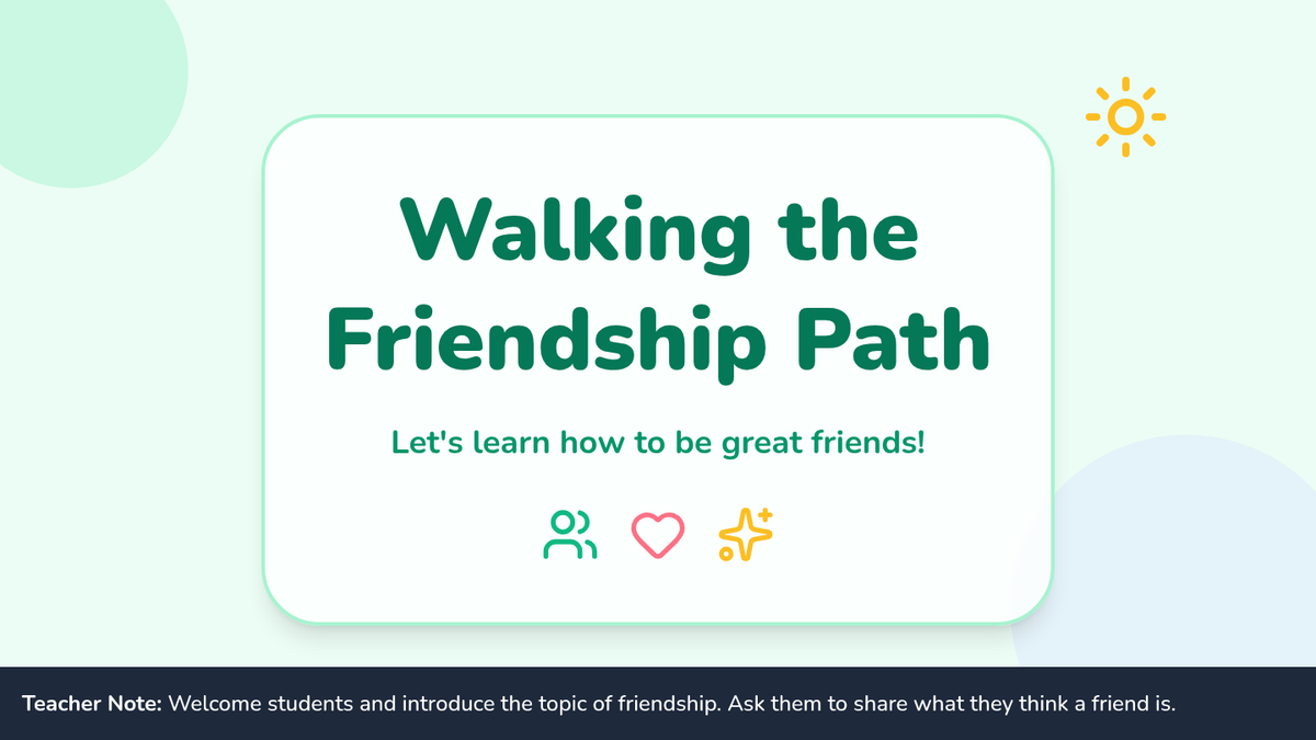 A delightful 20-minute lesson for Kindergarten students to learn and practice essential relationship skills like sharing and using kind words through interactive slides and a circle activity.