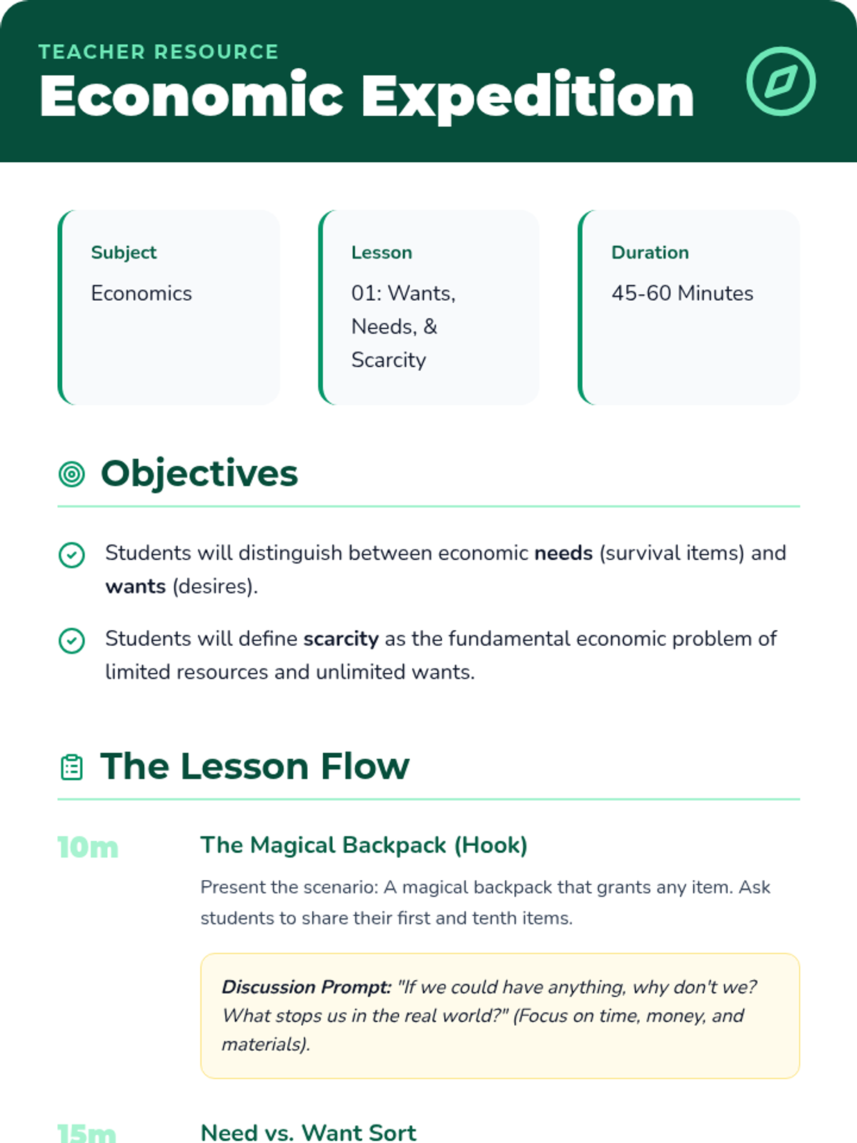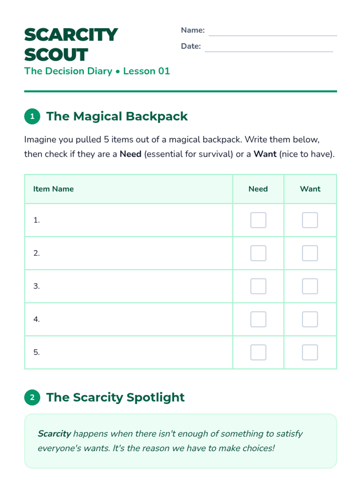 Students explore the fundamental economic problem of unlimited wants versus limited resources. Through a sorting activity and class discussion, they define scarcity and explain why it forces people to make choices.