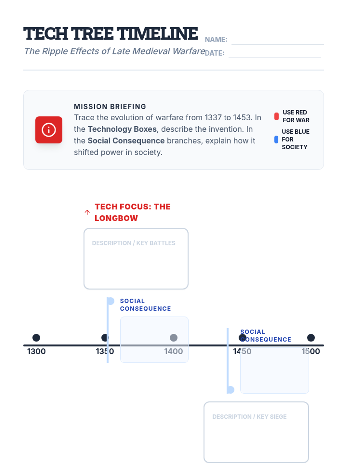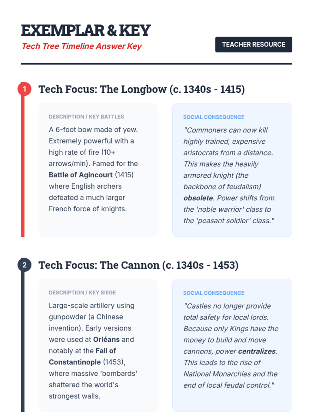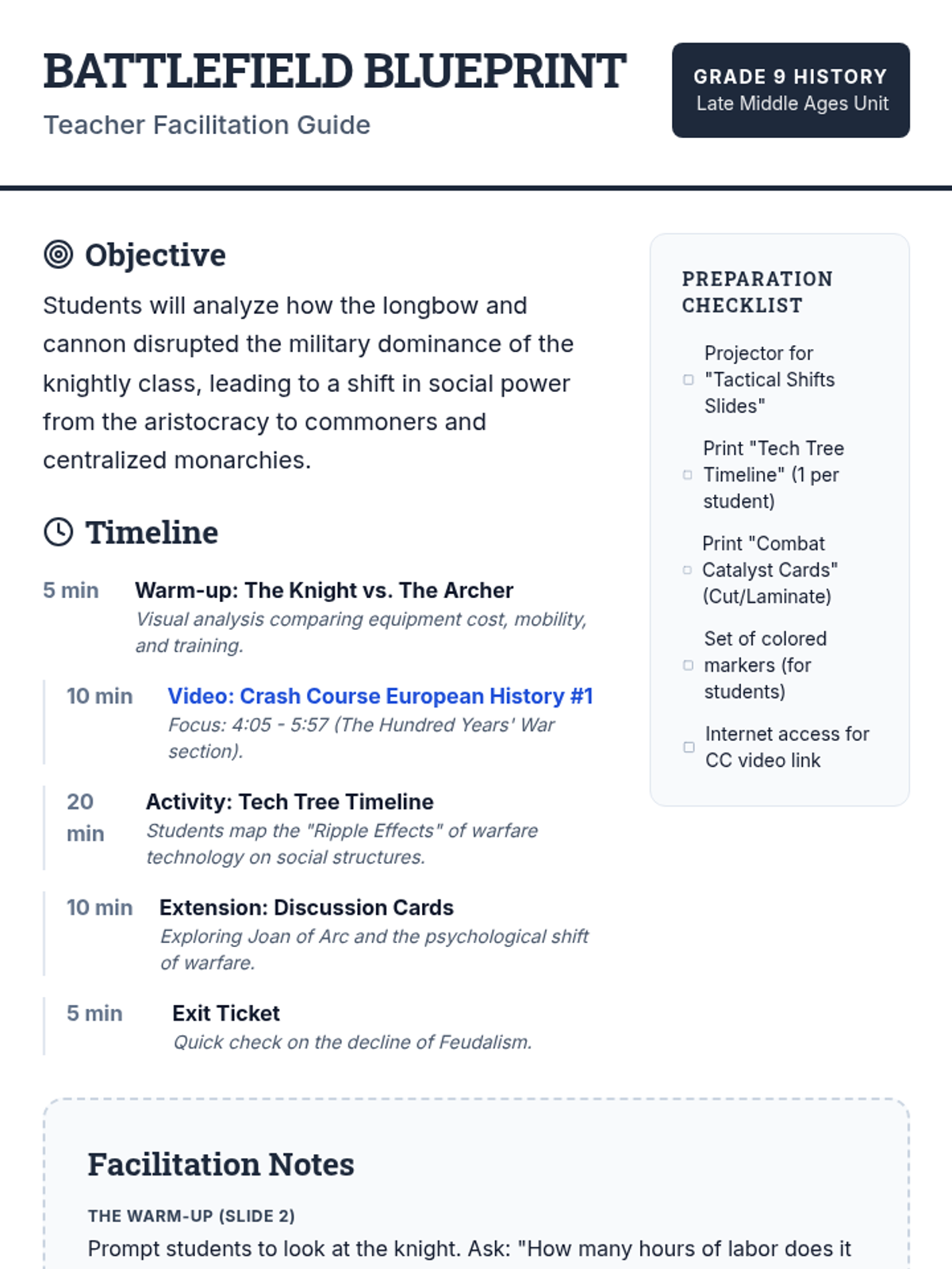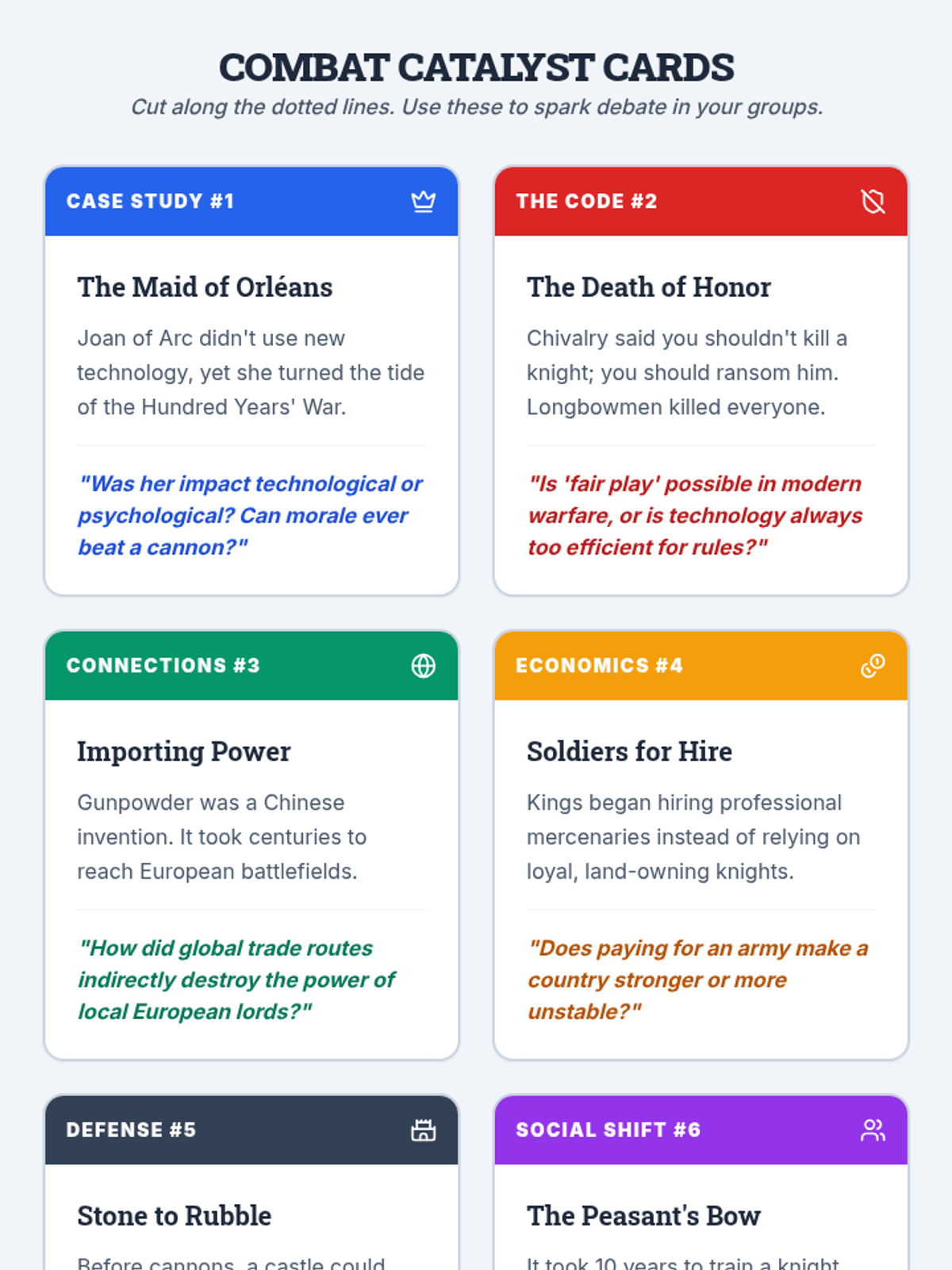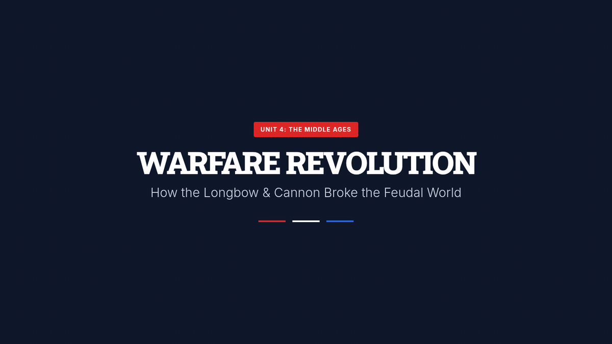 A 9th-grade history lesson exploring how the longbow and cannon disrupted the feudal order, shifted power to commoners, and ended the age of chivalry.