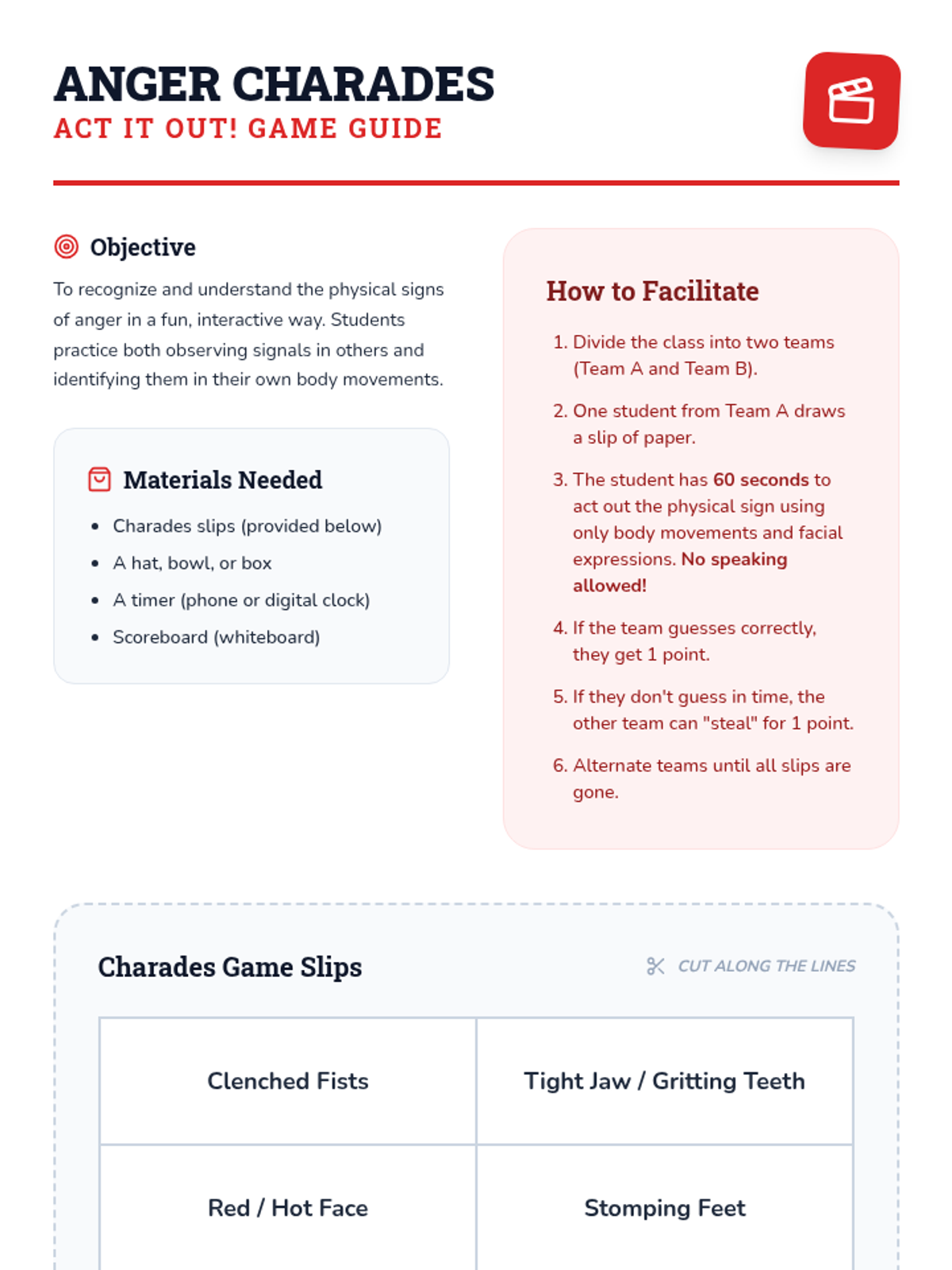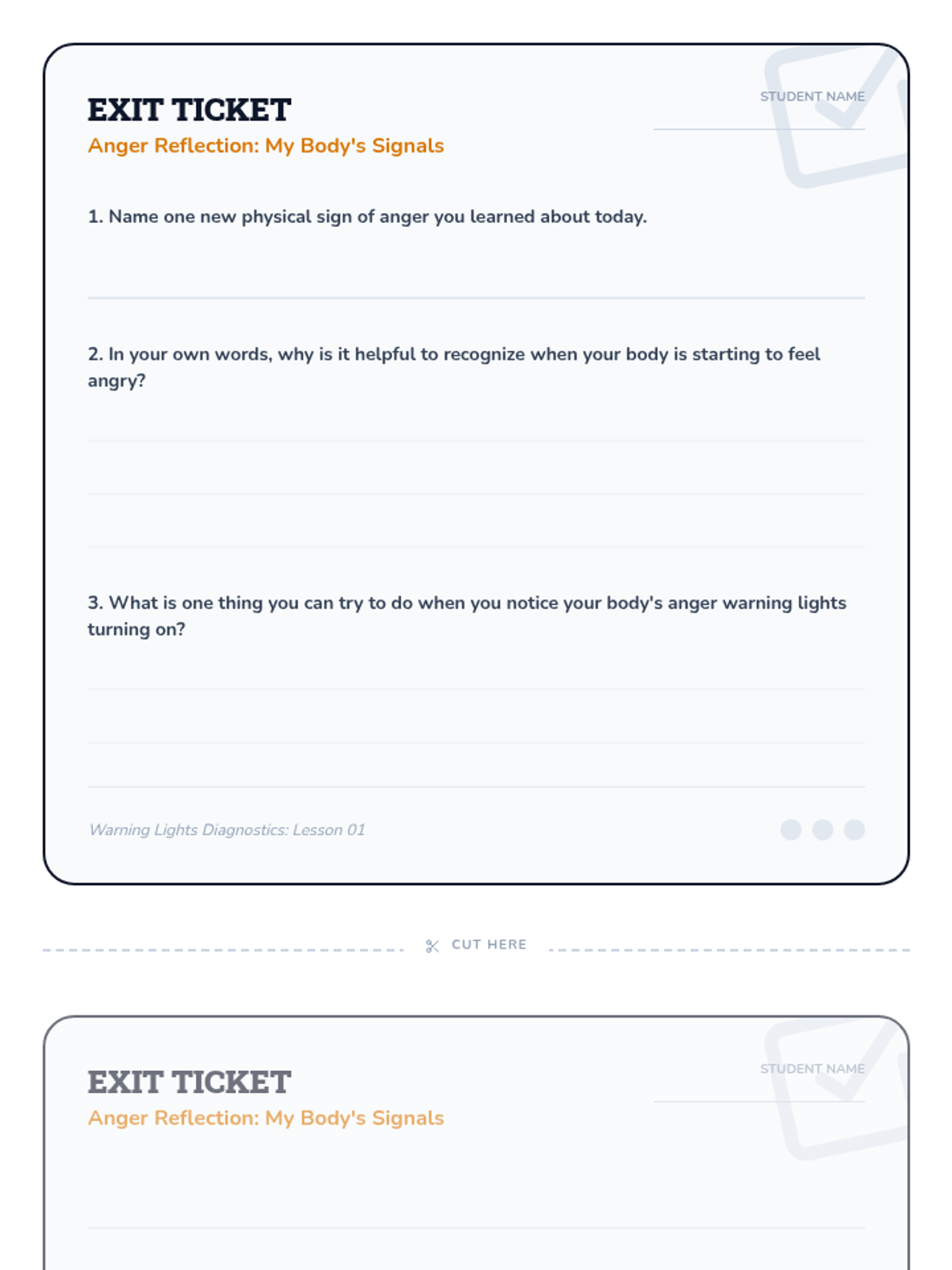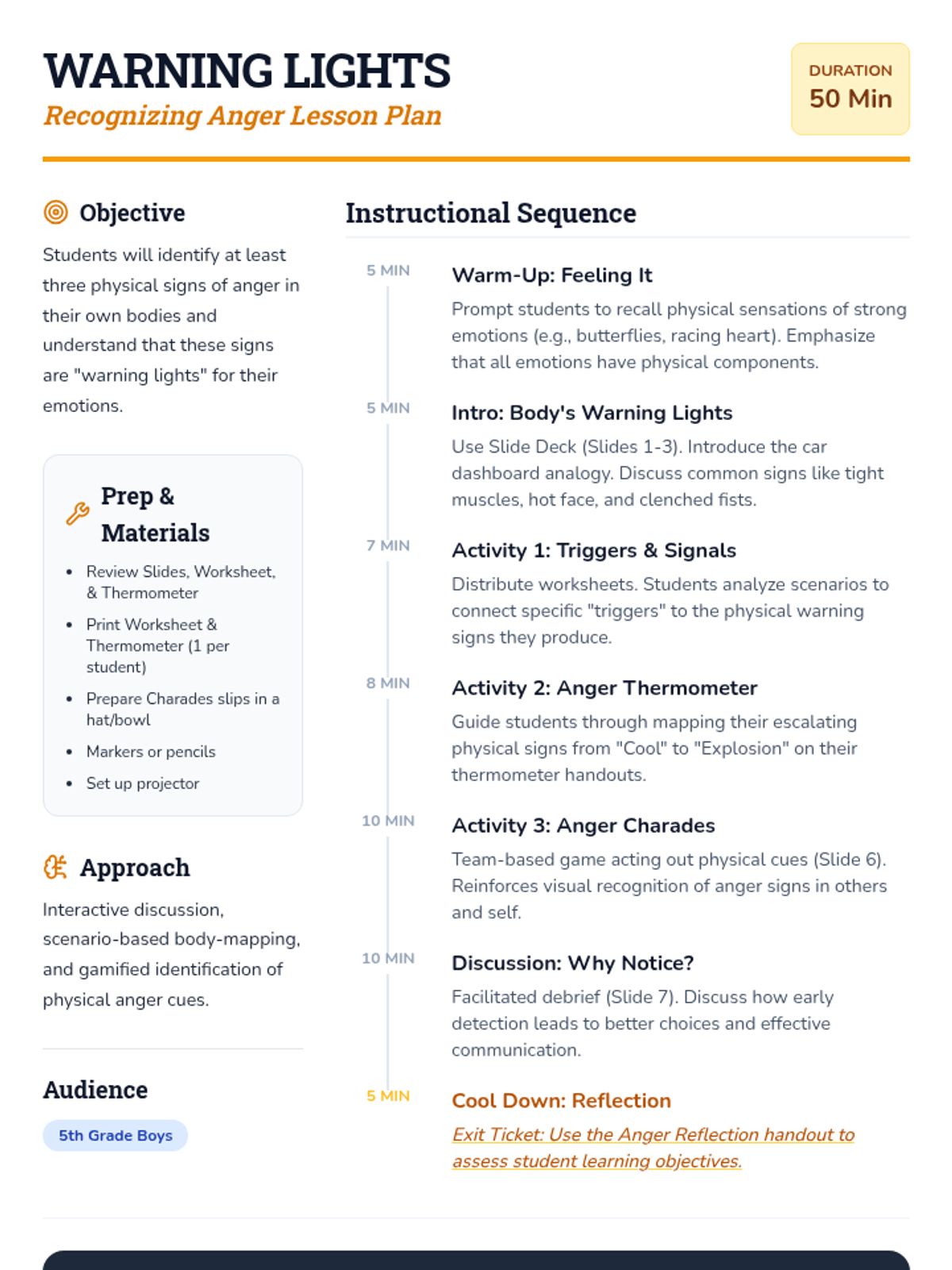 A 30-minute Tier 1 SEL lesson for 5th-grade boys focused on identifying physical cues of anger using a 'warning lights' metaphor. Students explore triggers, map their own physical responses on an 'anger thermometer,' and practice recognizing signs through interactive games.