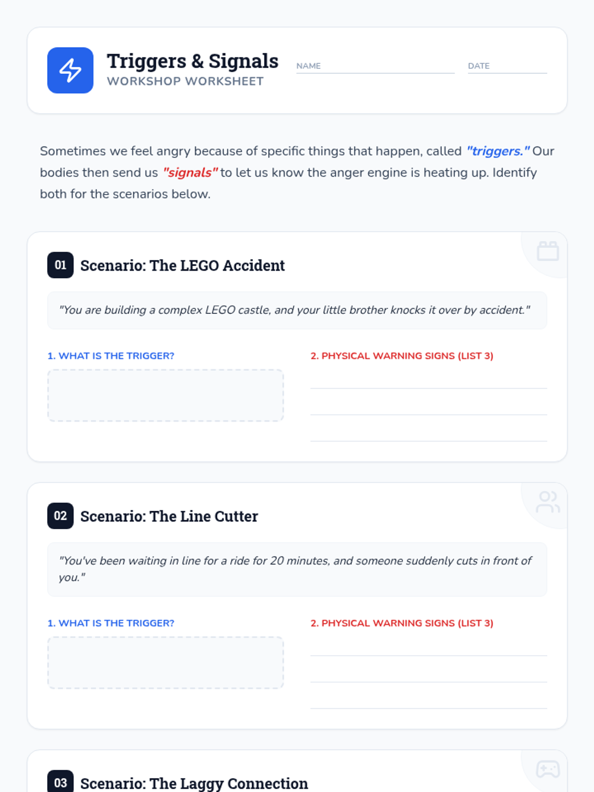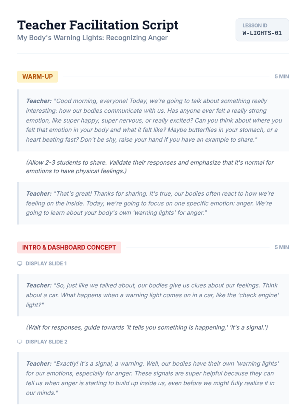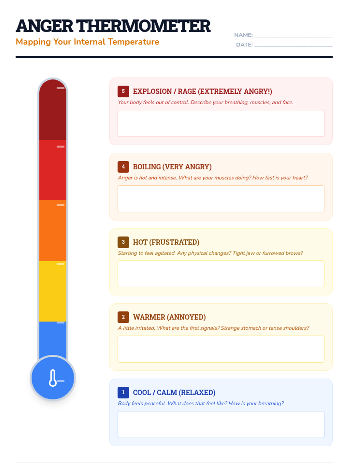 A 30-minute Tier 1 SEL lesson for 5th-grade boys focused on identifying physical cues of anger using a 'warning lights' metaphor. Students explore triggers, map their own physical responses on an 'anger thermometer,' and practice recognizing signs through interactive games.