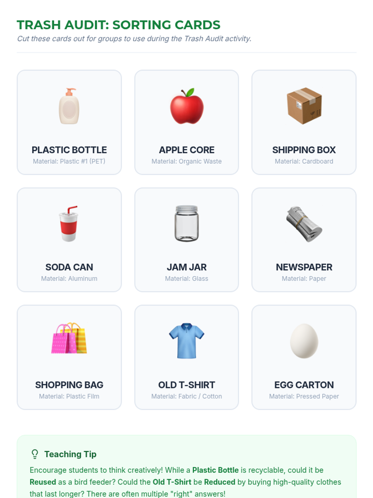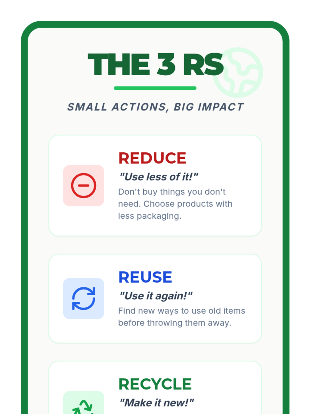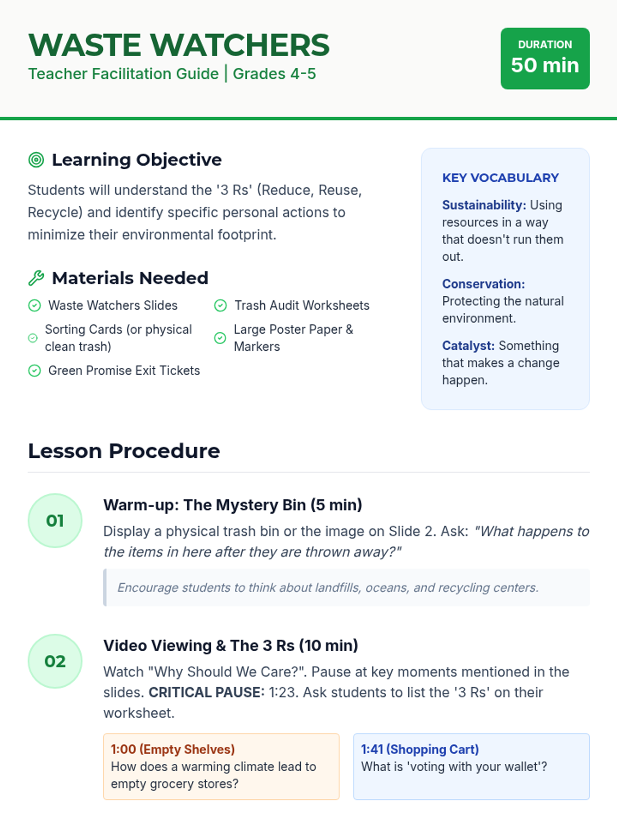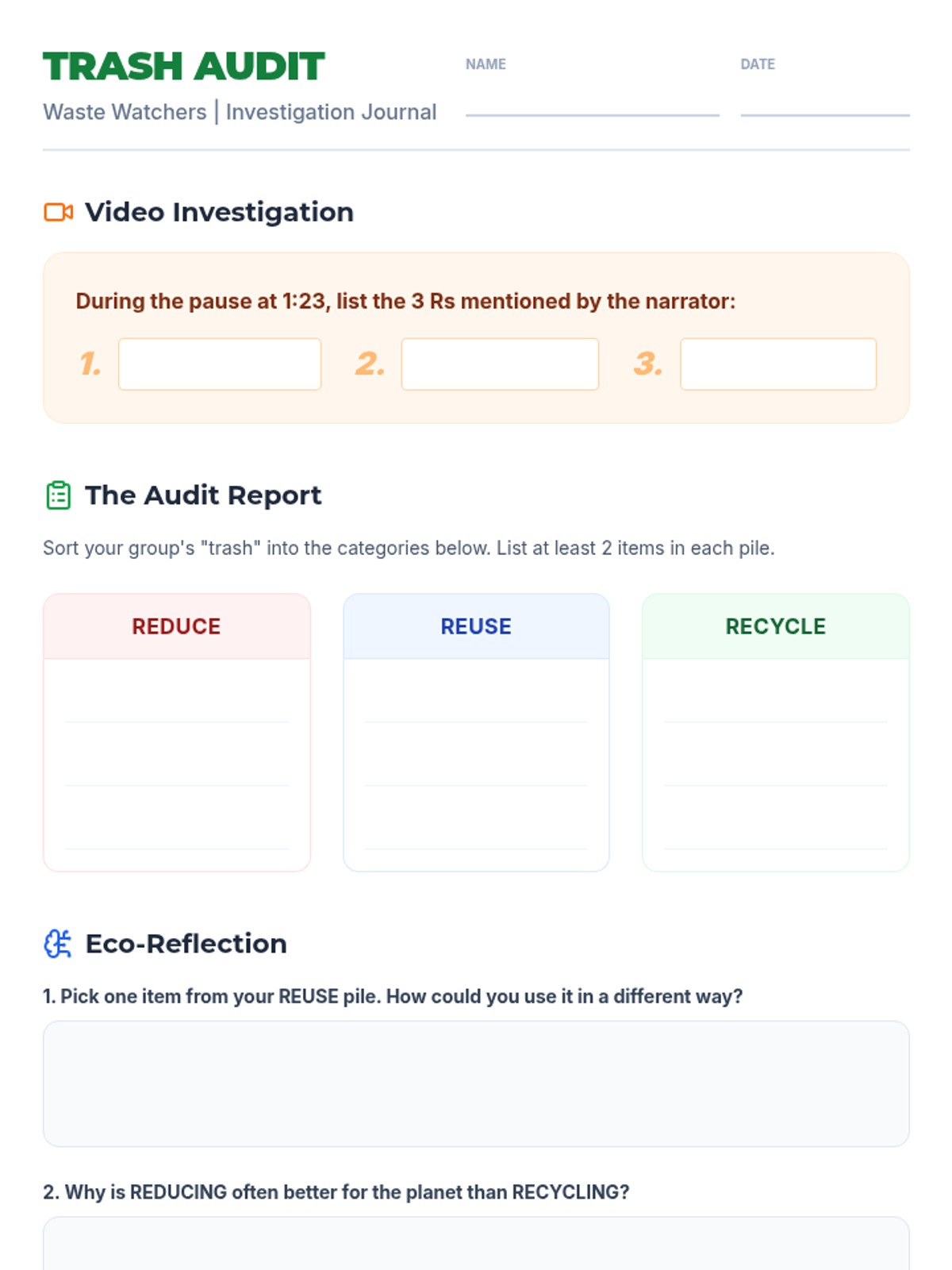 In this lesson, 4th-5th grade students explore the '3 Rs' (Reduce, Reuse, Recycle) through a compelling video on climate change and a hands-on 'Trash Audit' activity. Students learn to distinguish between waste management strategies and commit to a personal eco-friendly action.