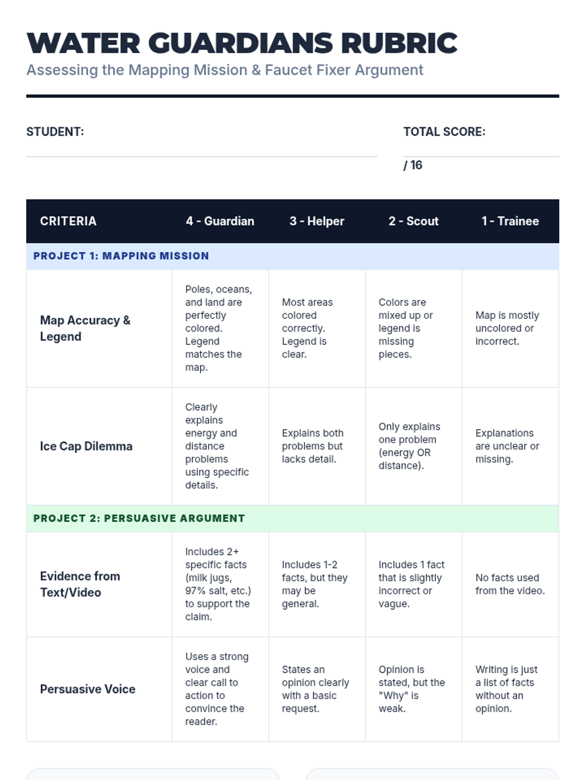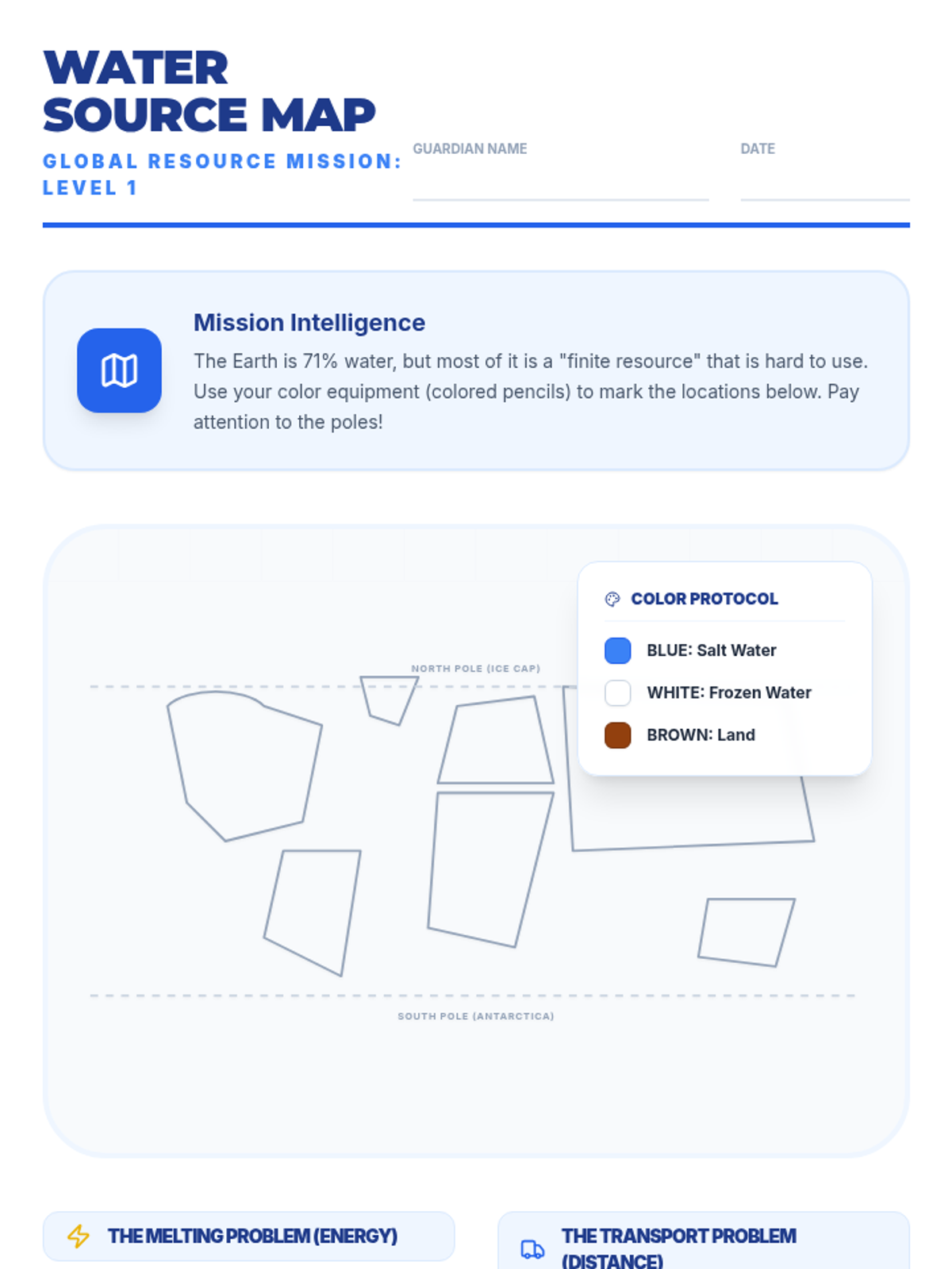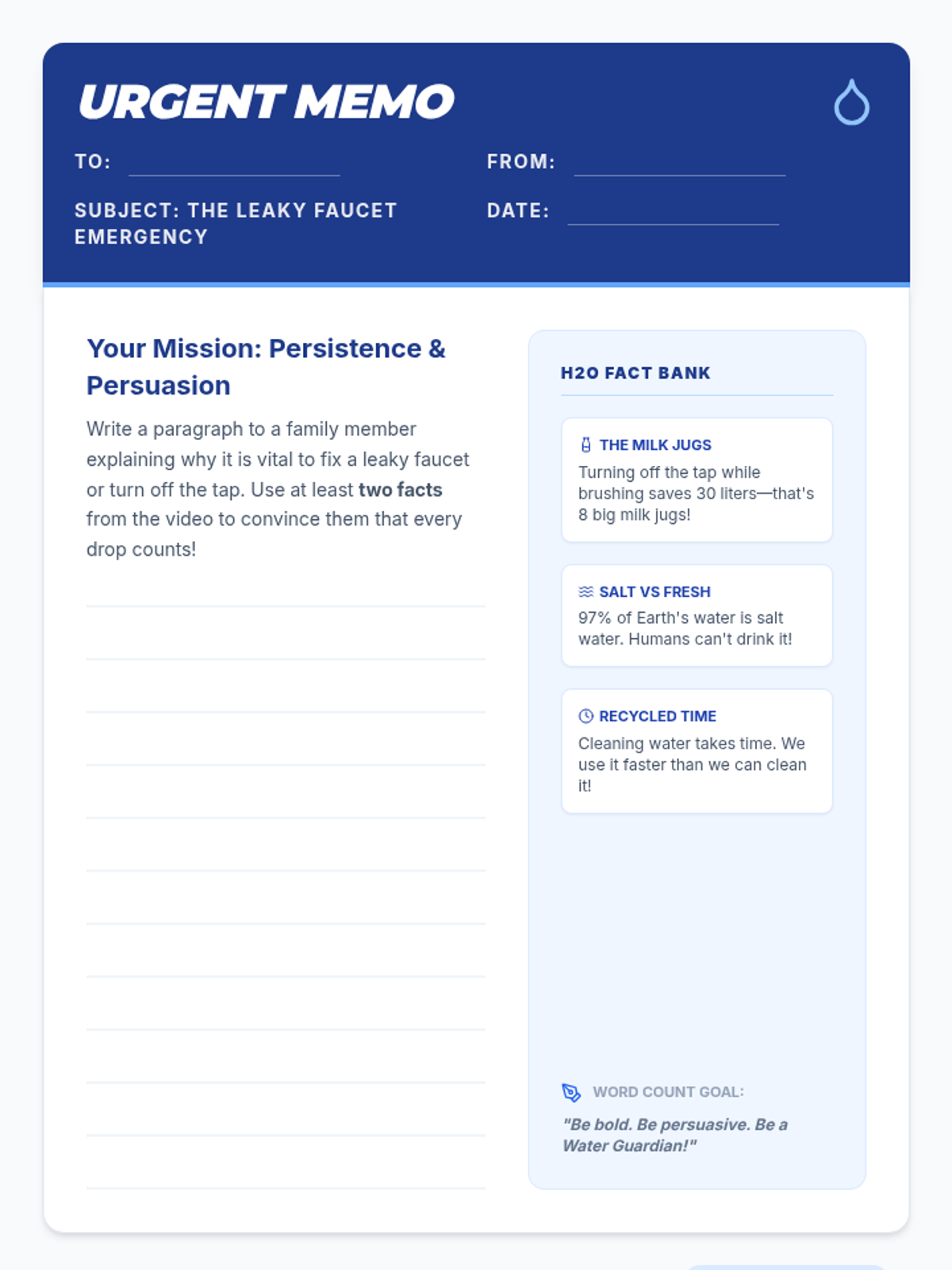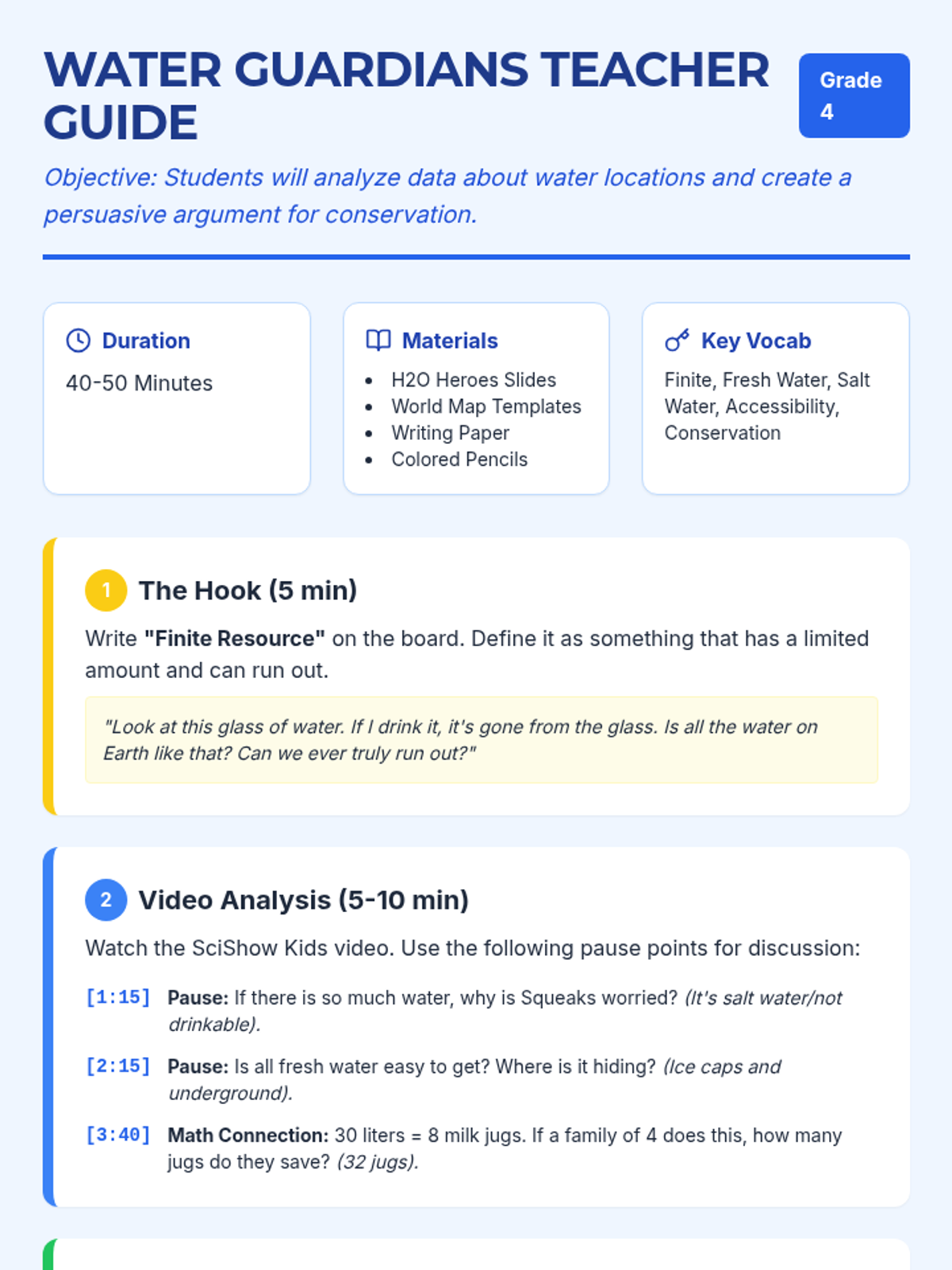 Students explore the scarcity of fresh water through a SciShow Kids video, create a global water source map, and write a persuasive paragraph about faucet conservation. The lesson emphasizes the difference between salt water, frozen water, and accessible fresh water.