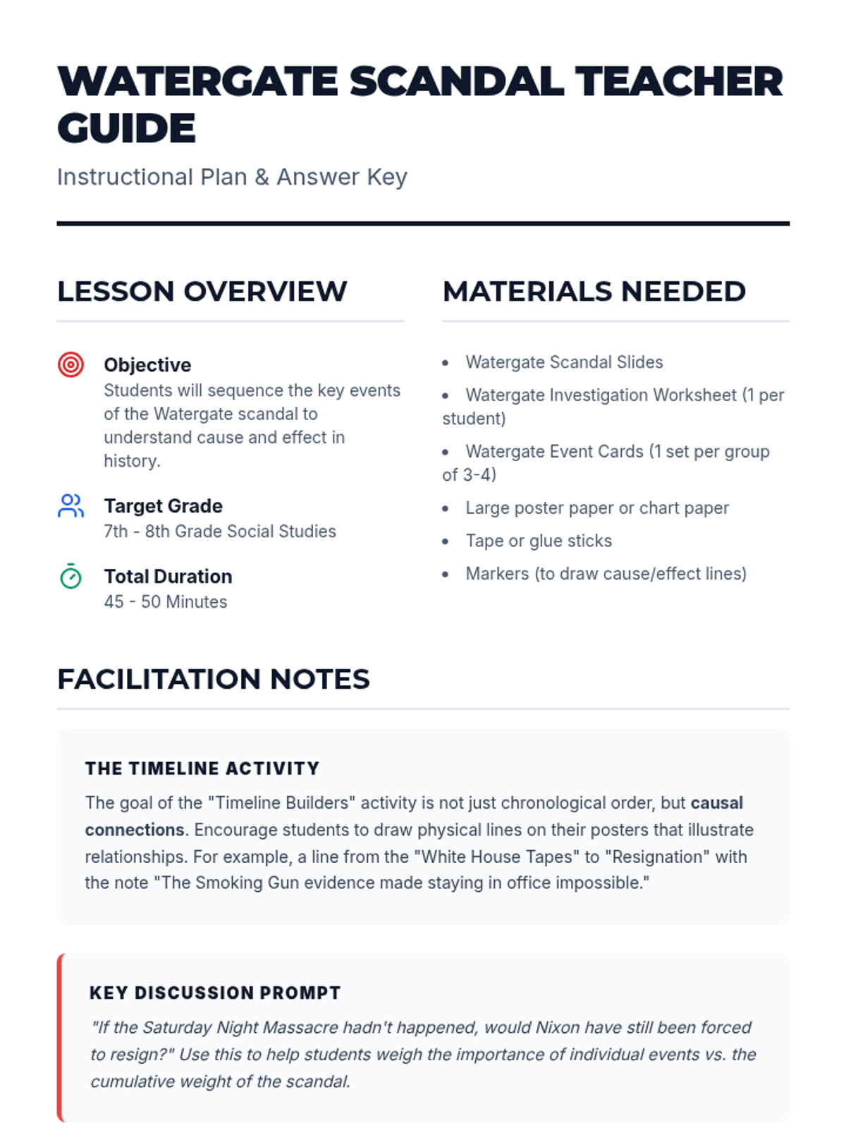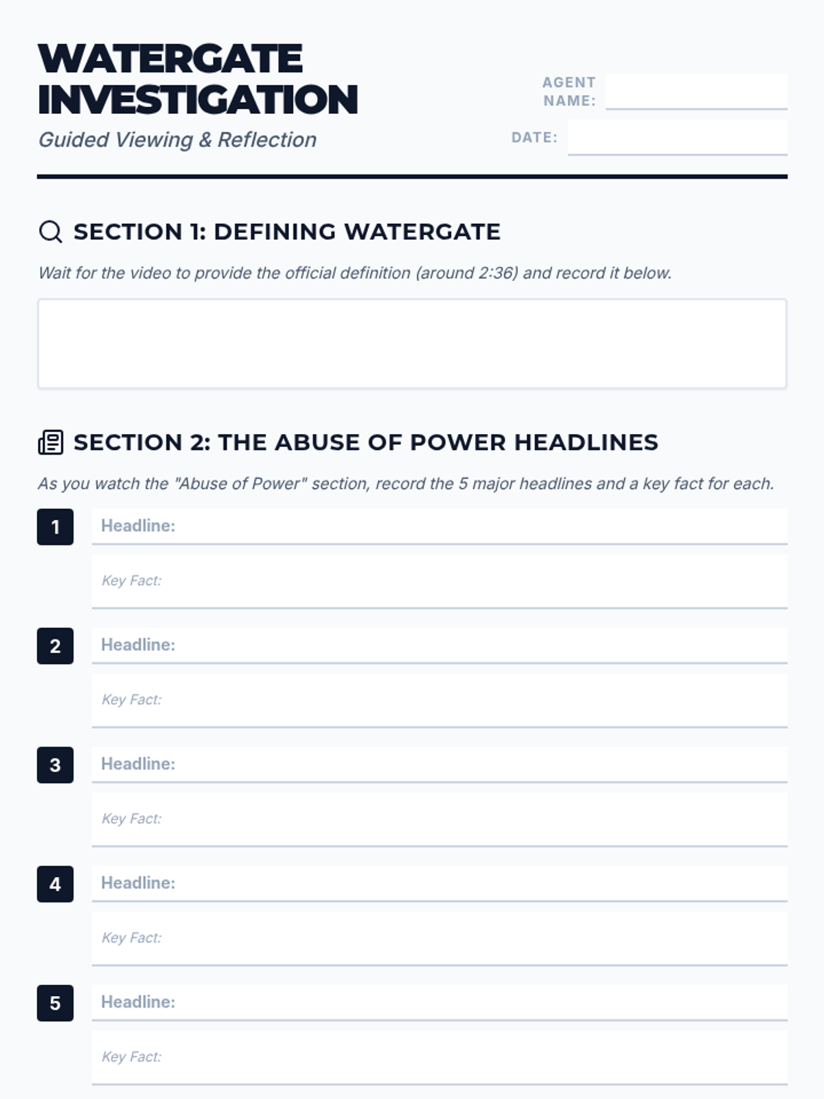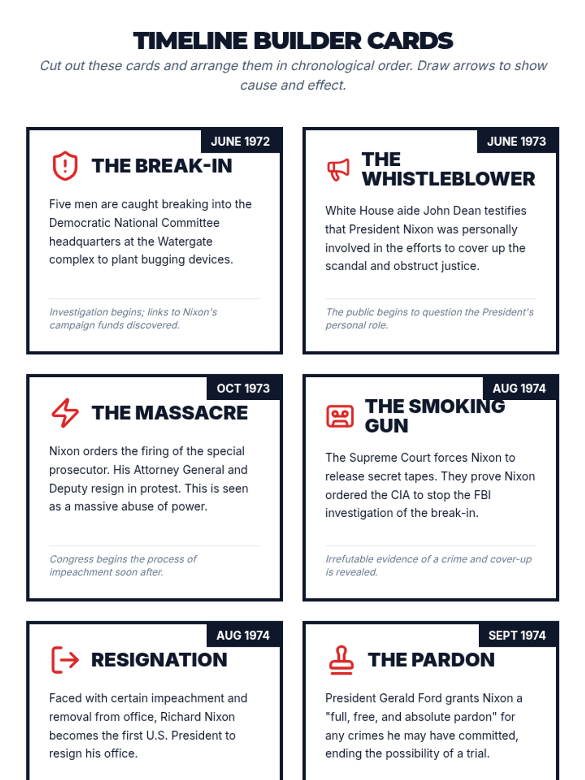 Students will investigate the Watergate scandal, sequencing key events from the 1972 break-in to the 1974 pardon. They will analyze how specific abuses of power led to Nixon's resignation and evaluate the lasting impact on American trust in government.