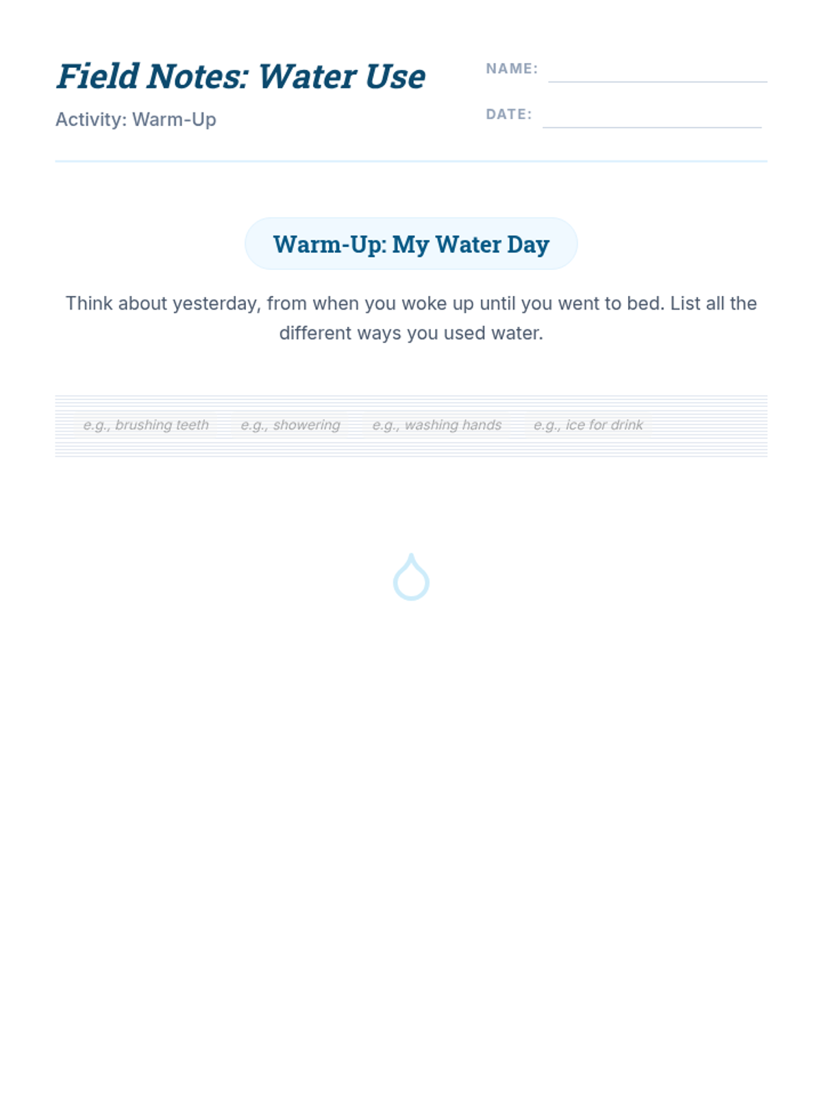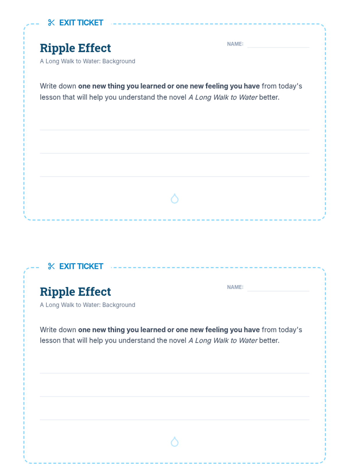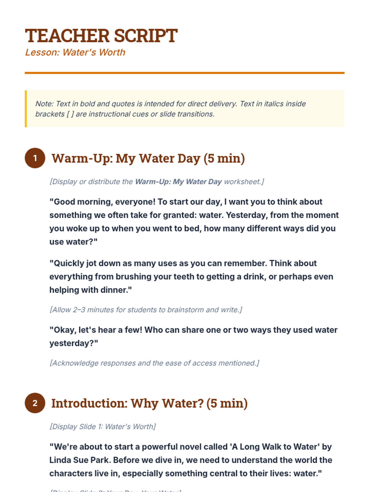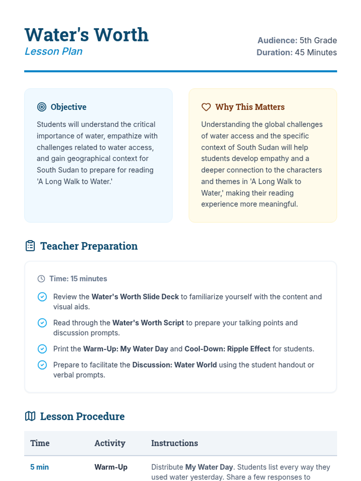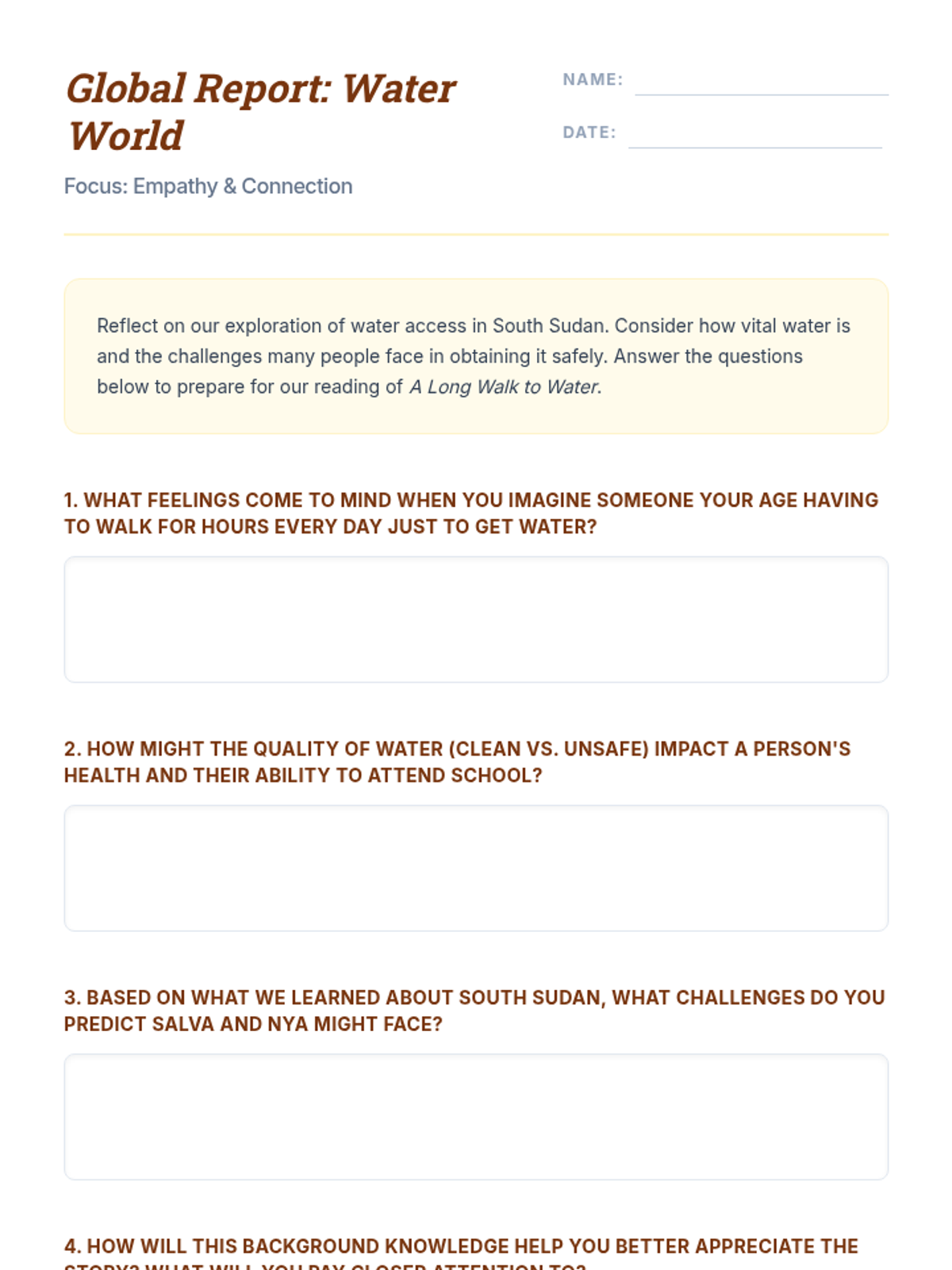 This lesson prepares students for Linda Sue Park's 'A Long Walk to Water' by exploring water scarcity, South Sudan's geography, and the daily reality of fetching water. Students build empathy and background knowledge through reflection, discussion, and visual exploration.