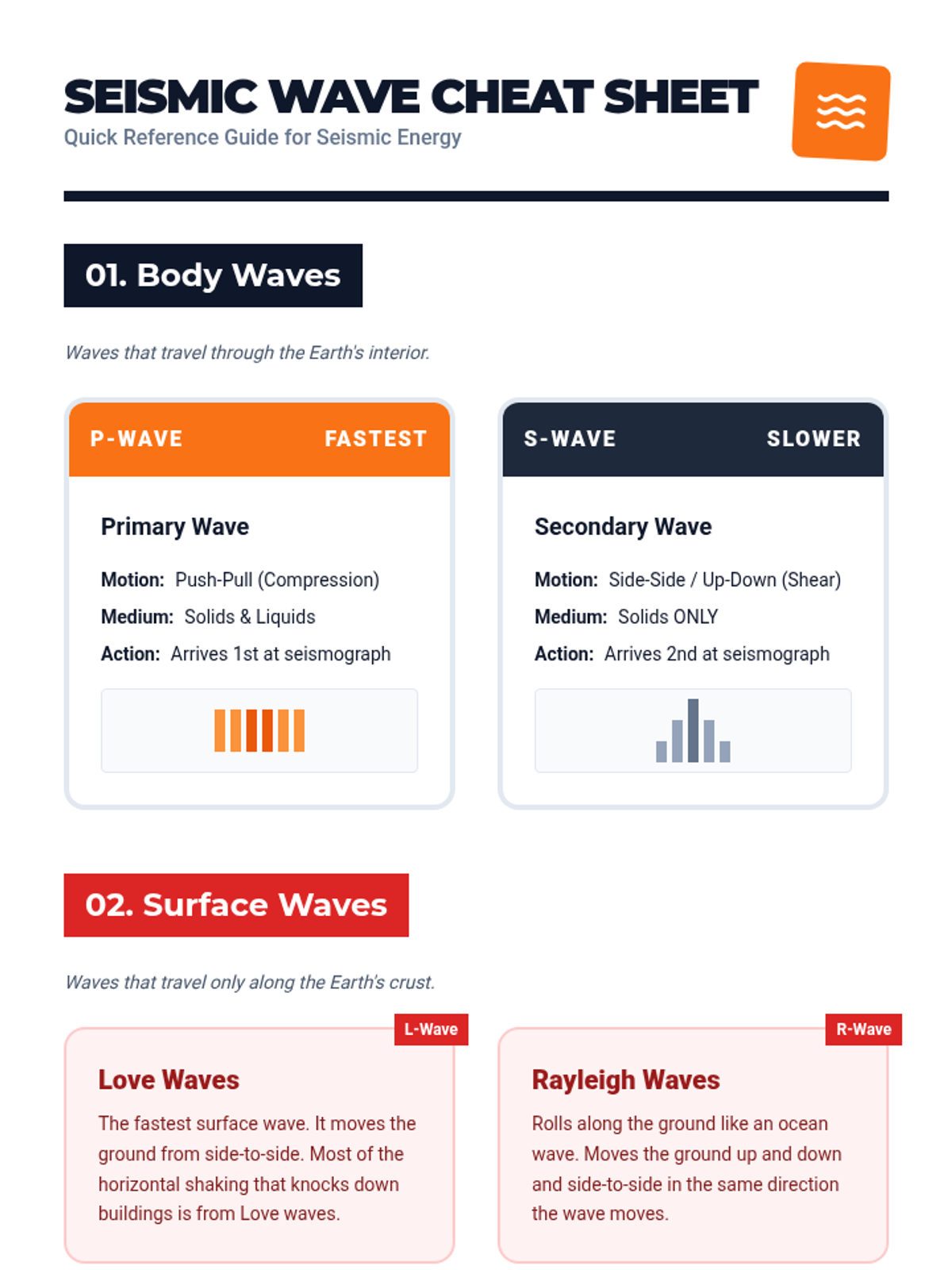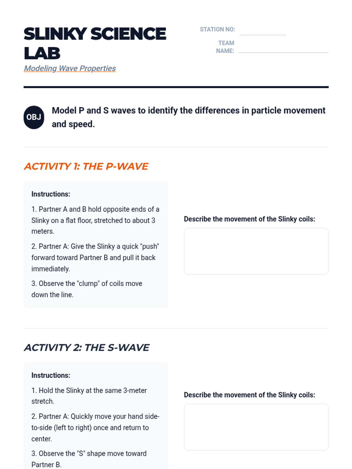 Differentiating between P, S, and surface waves through physical modeling and wave property analysis. Students learn how energy travels through different mediums within the Earth.