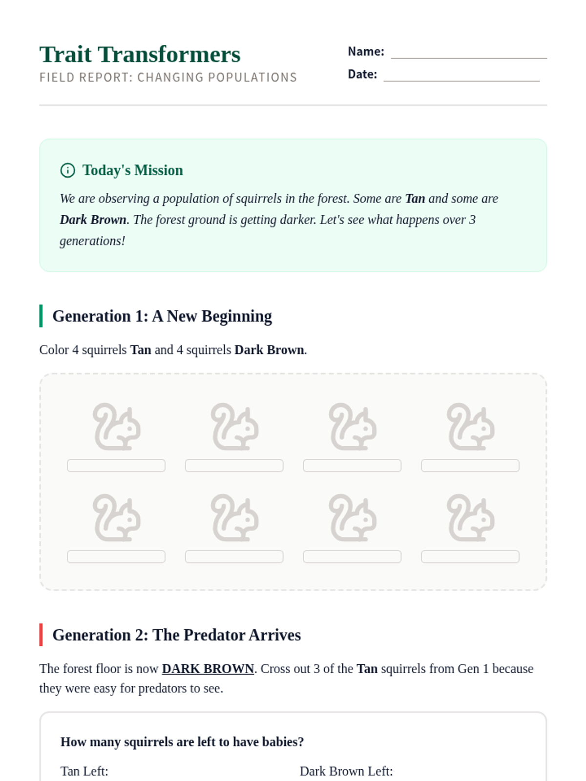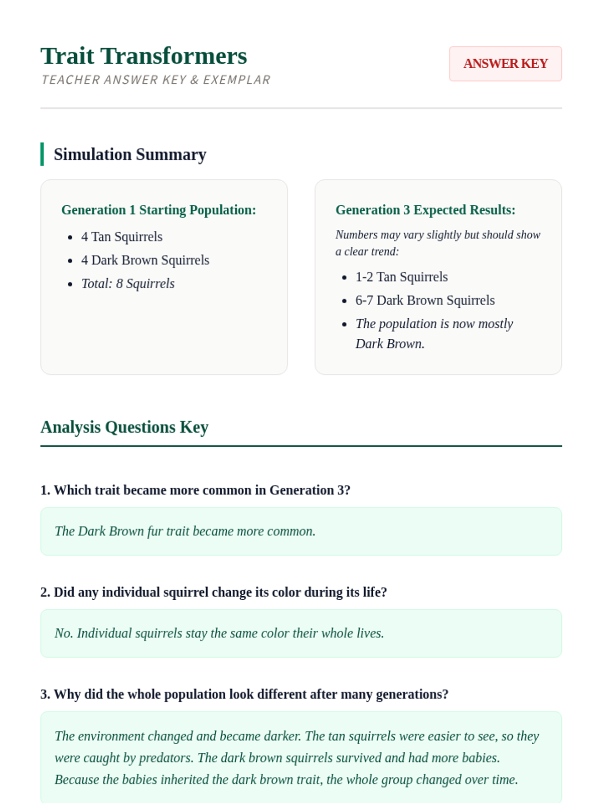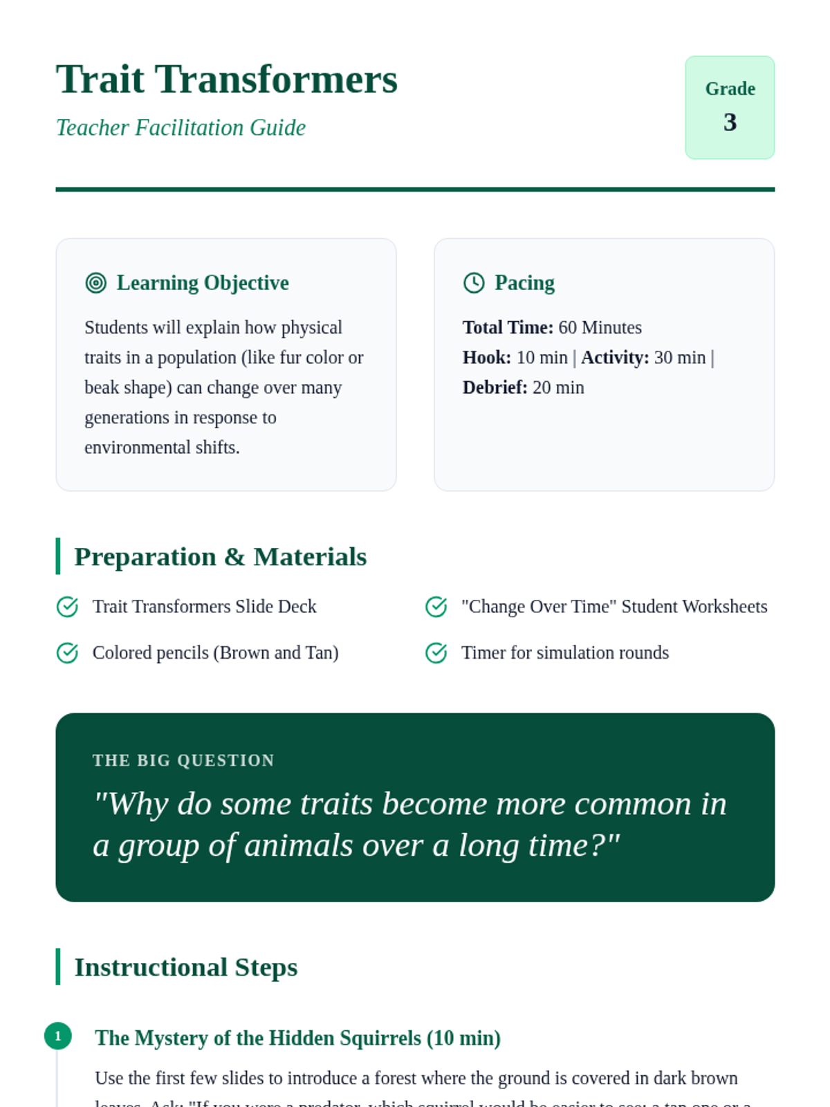 Students explore how physical traits in a population can change over generations. Through observation and modeling, they identify how certain traits become more common when they help an organism survive in its environment.