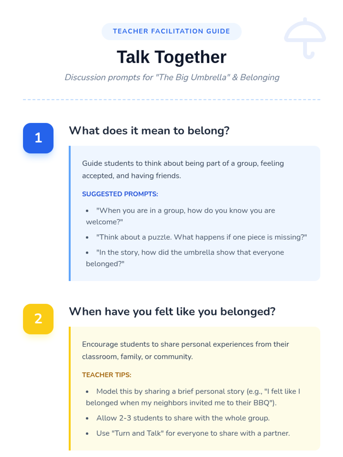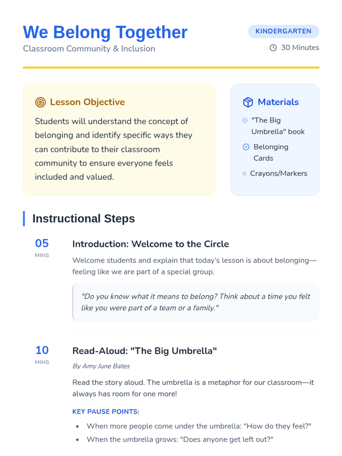 A heartwarming Kindergarten lesson centered on the book 'The Big Umbrella,' teaching students about inclusion, acceptance, and how to build a classroom community where everyone belongs.