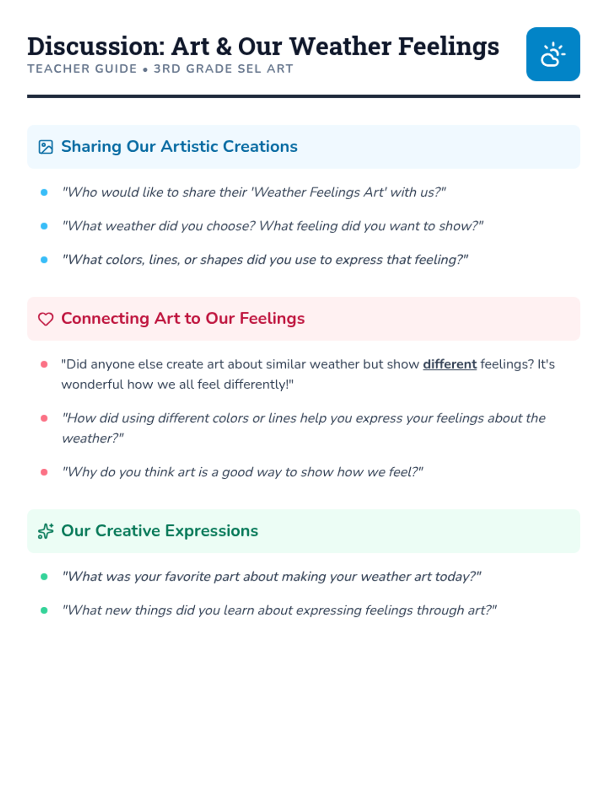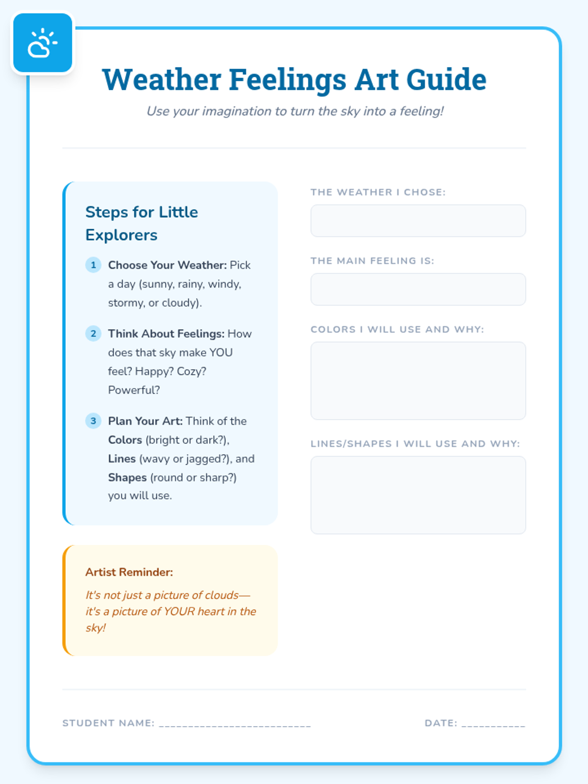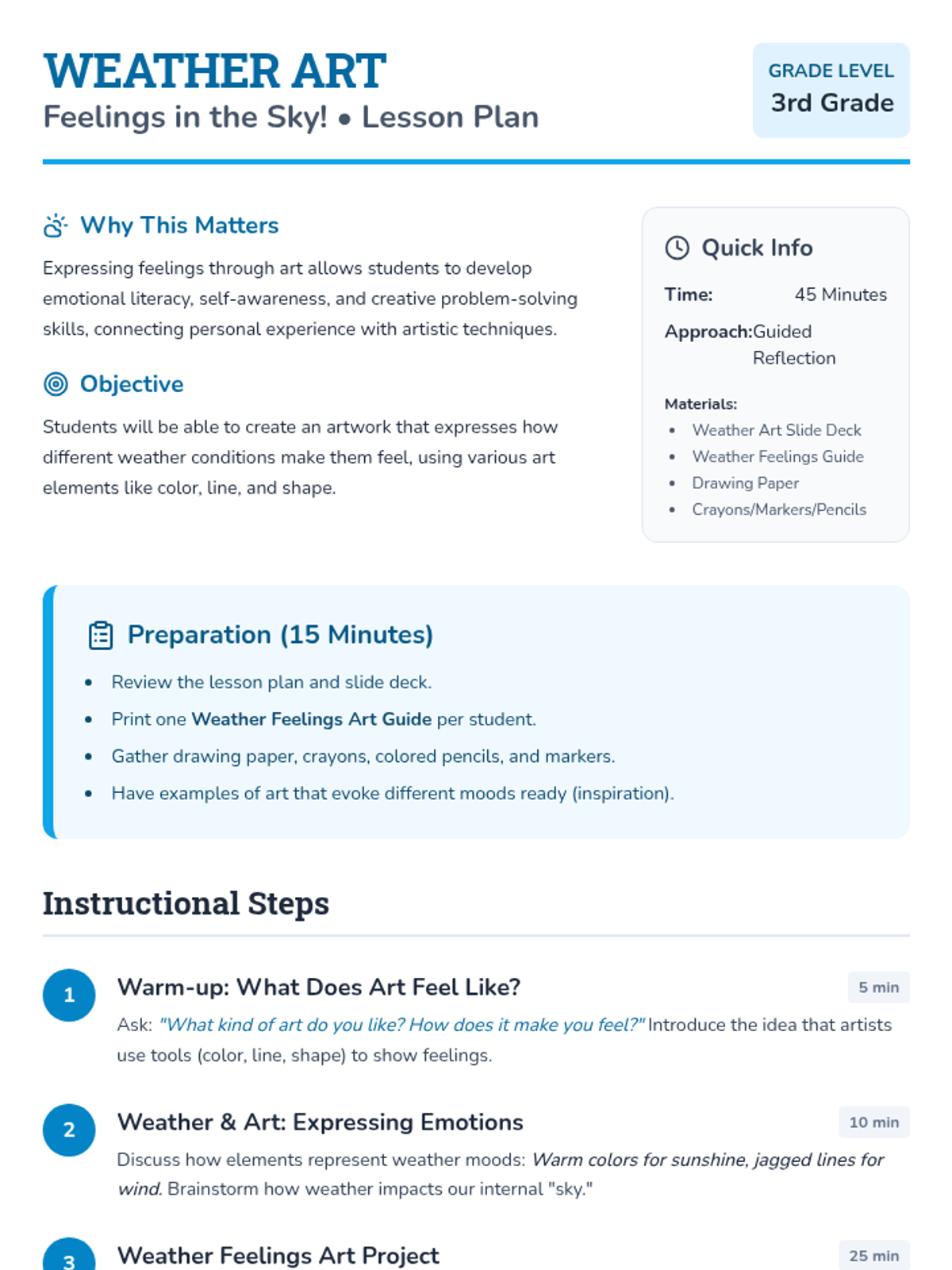 A 45-minute SEL-integrated art lesson for 3rd-grade students. Students express their emotions through the metaphor of weather, using color, line, and shape to create "sky moods."