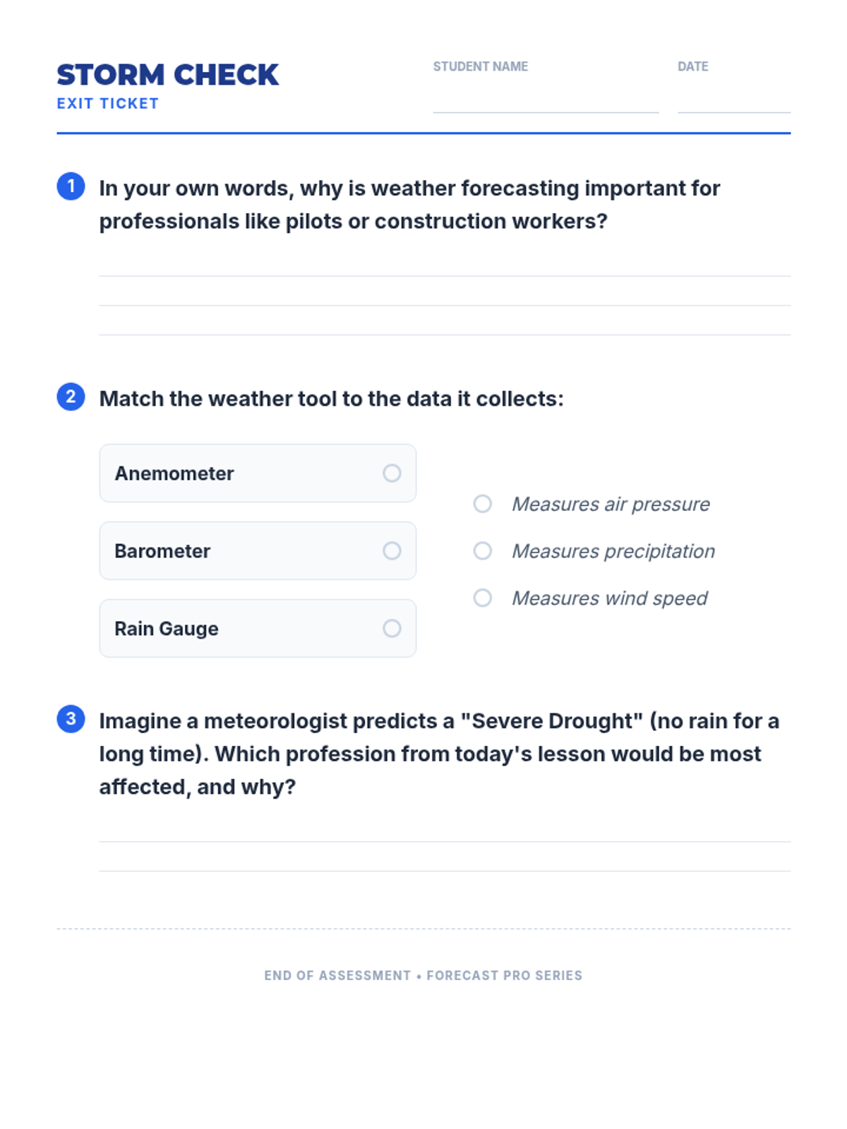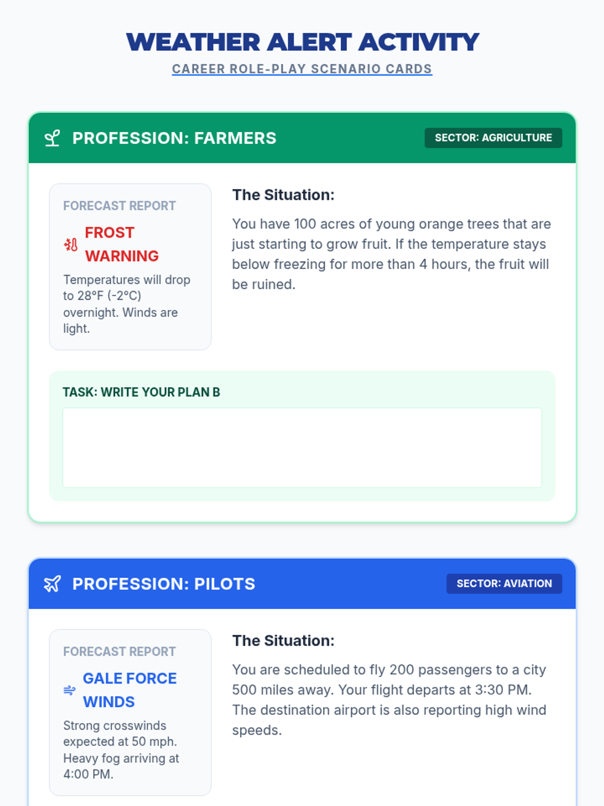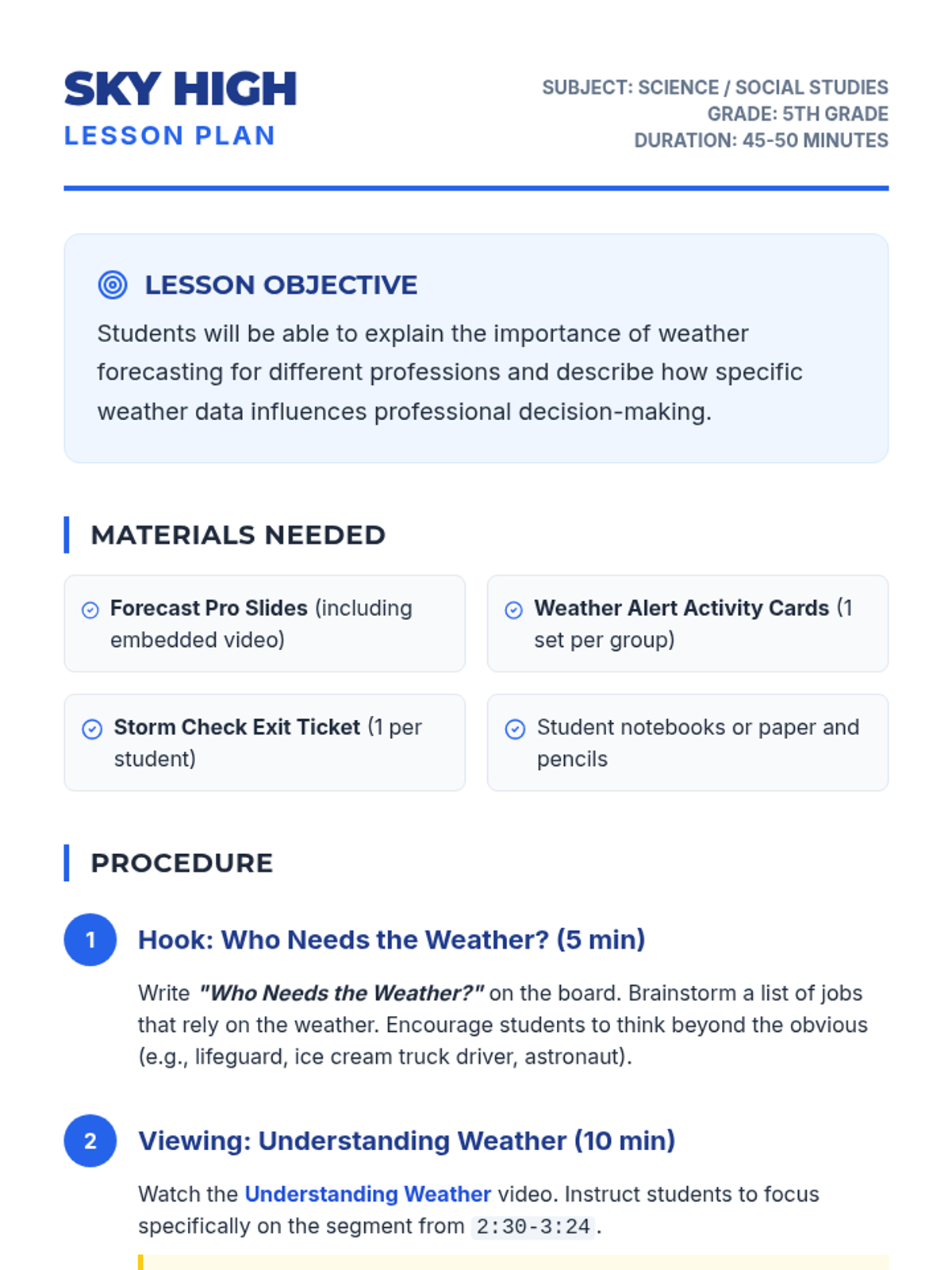 A 5th-grade science and career-focused lesson where students analyze how weather forecasting affects various professions and safety. Students engage with a video on weather measurement and participate in a career-based role-play activity to develop 'Plan B' strategies for weather-related challenges.