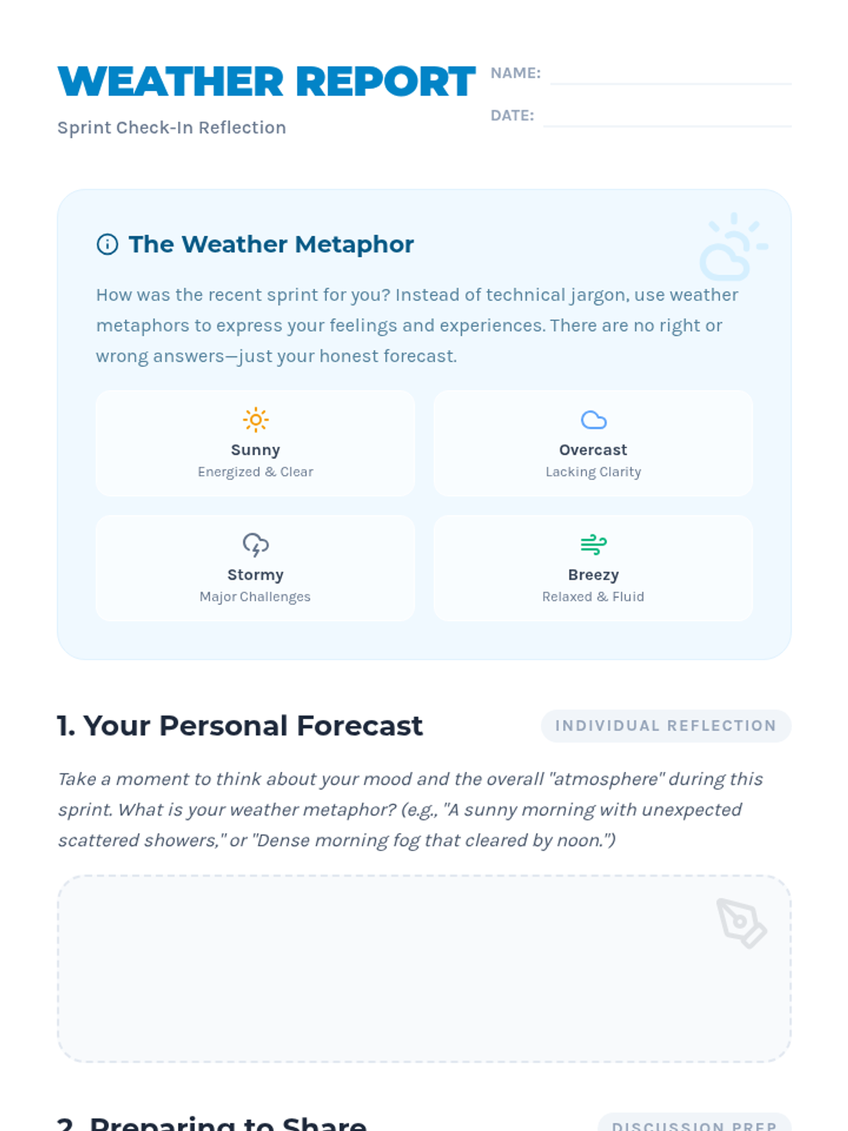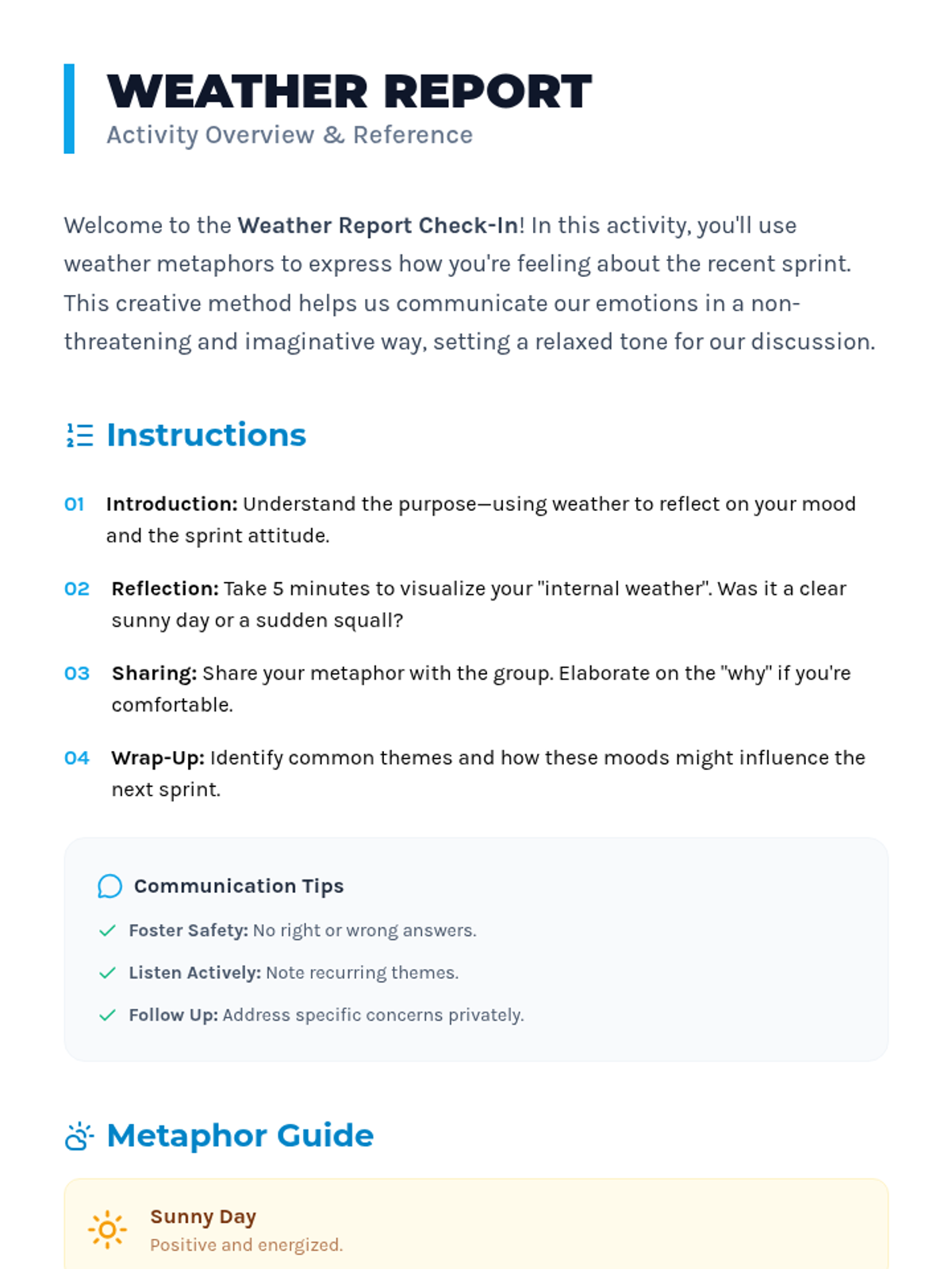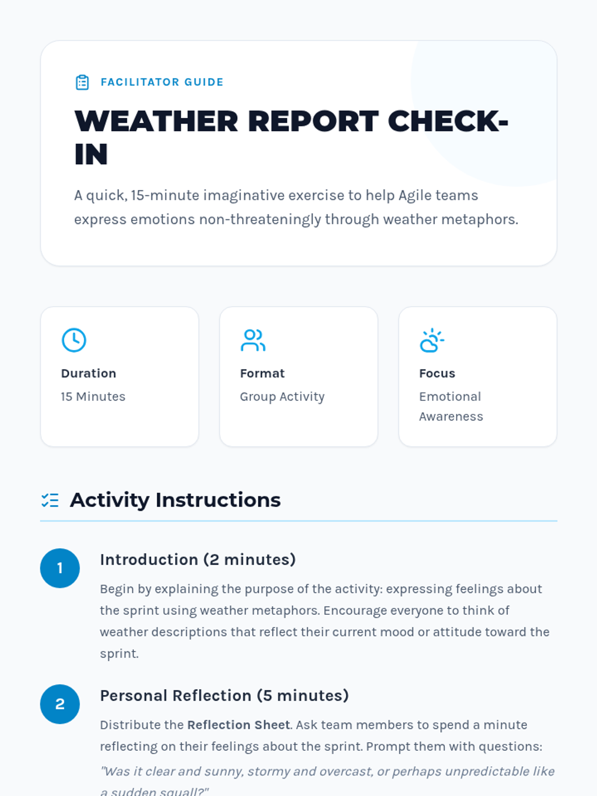 A quick, 15-minute Agile check-in using weather metaphors to help teams express their emotional state and sprint experiences in a creative, low-pressure environment.