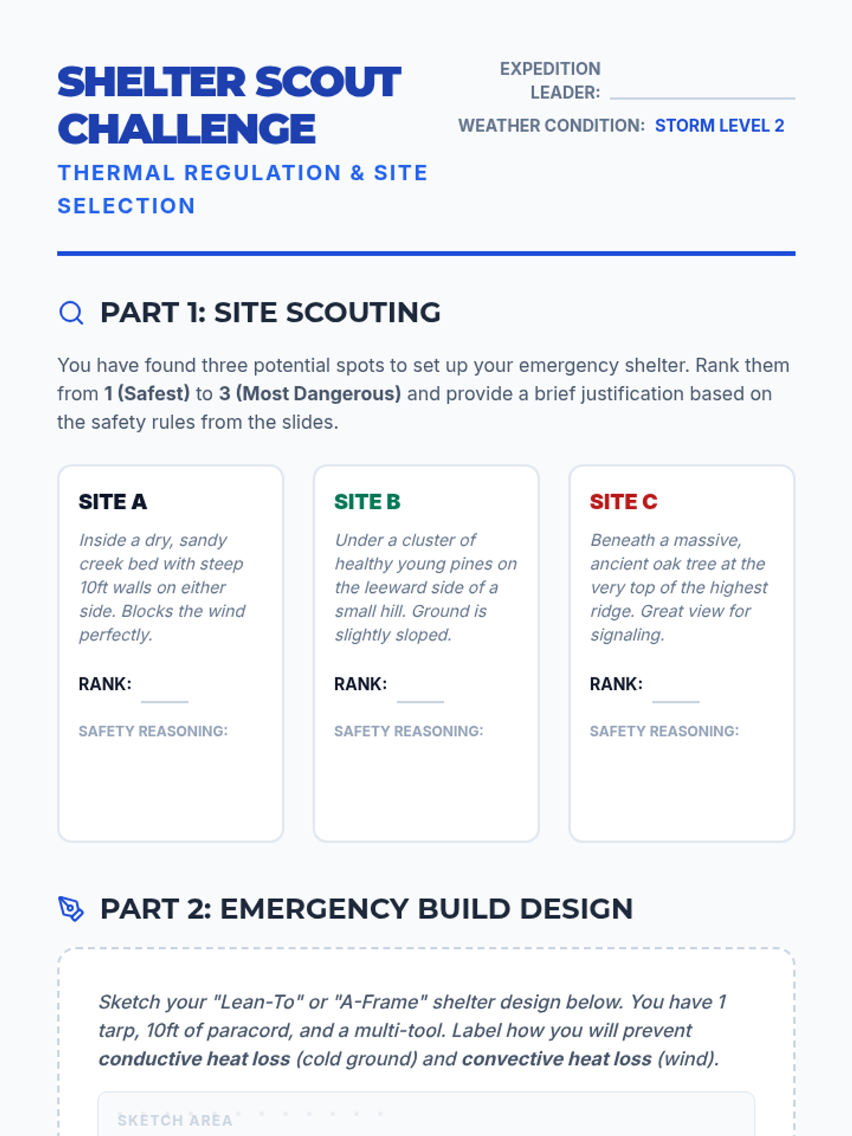 Students interpret weather patterns and construct emergency shelters to survive sudden environmental changes.