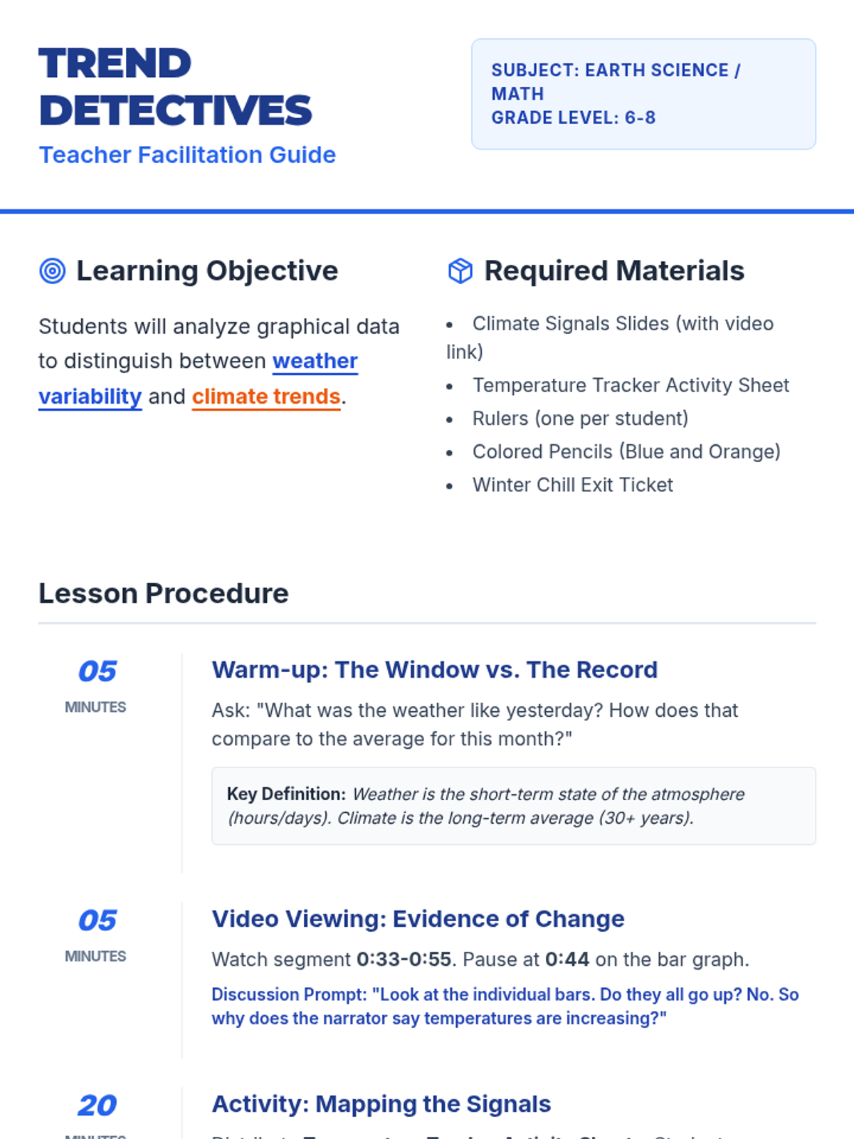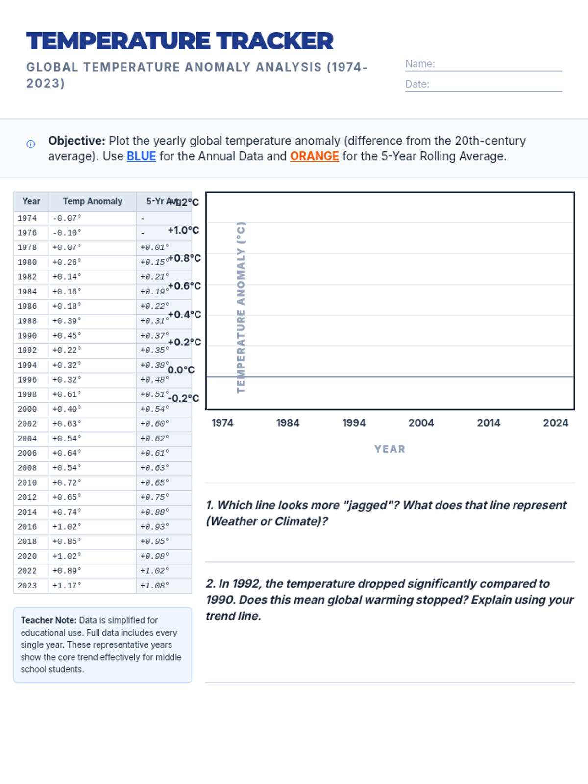 Students will differentiate between short-term weather variability and long-term climate trends by plotting 50 years of temperature data and analyzing the difference between annual fluctuations and rolling averages.