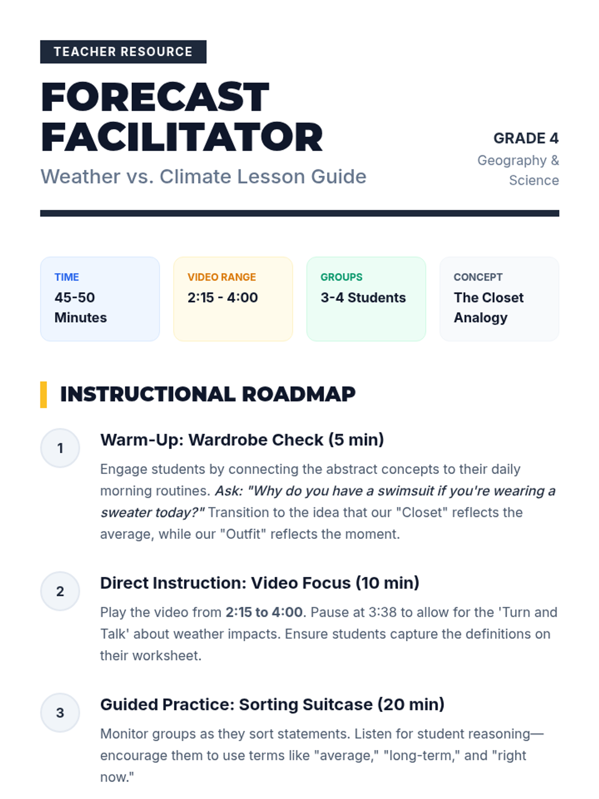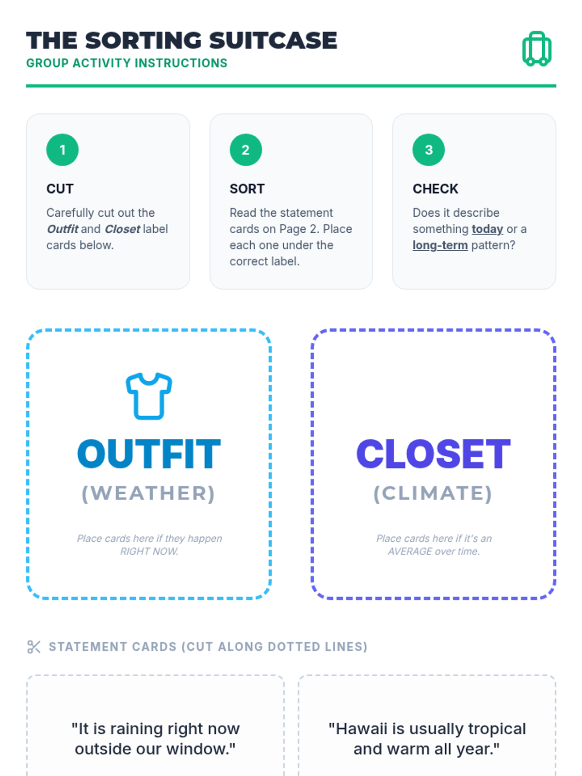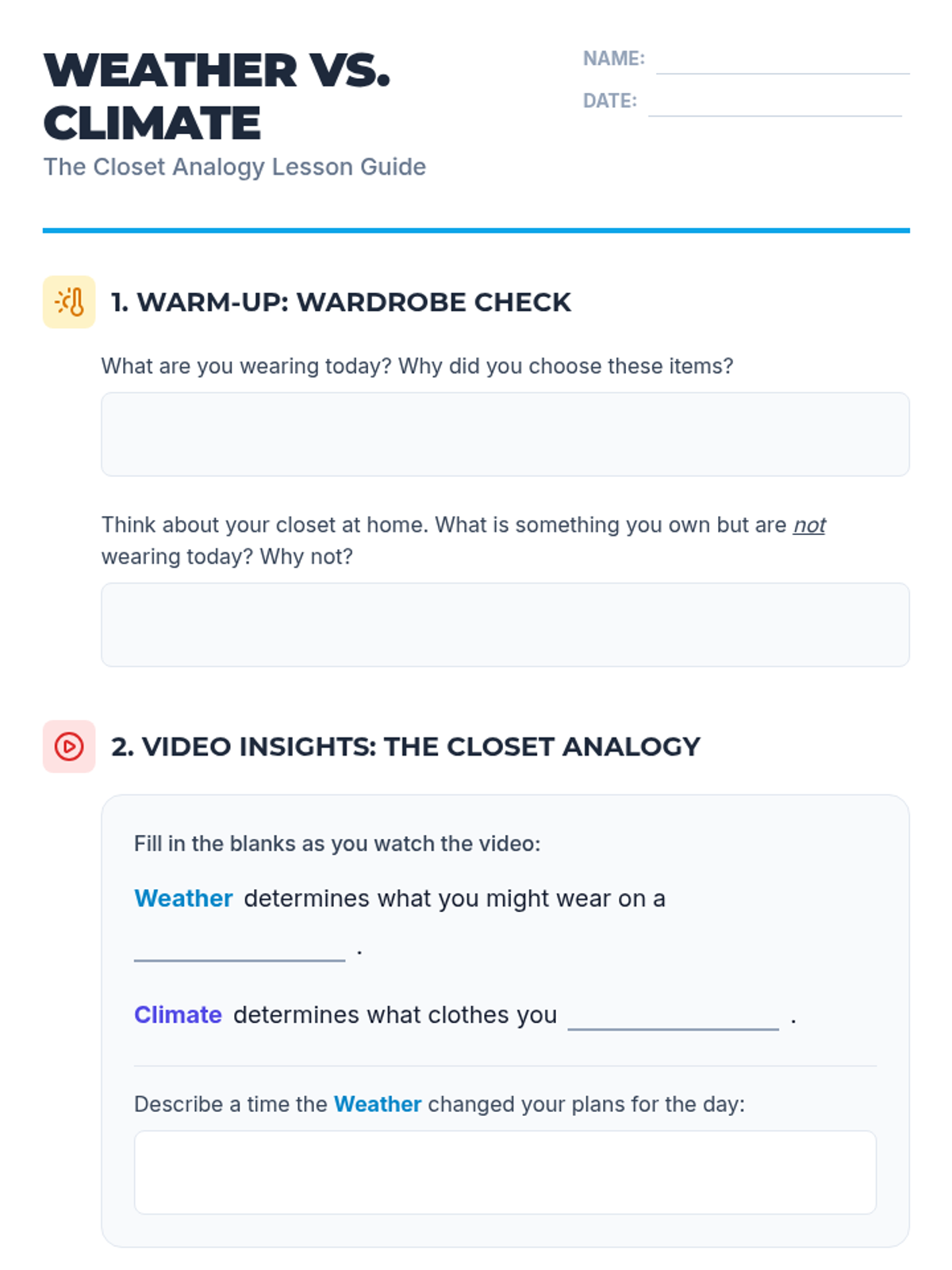 Students will learn to distinguish between weather (short-term) and climate (long-term) using the 'Closet Analogy' through a video, a sorting activity, and creative analogy building.