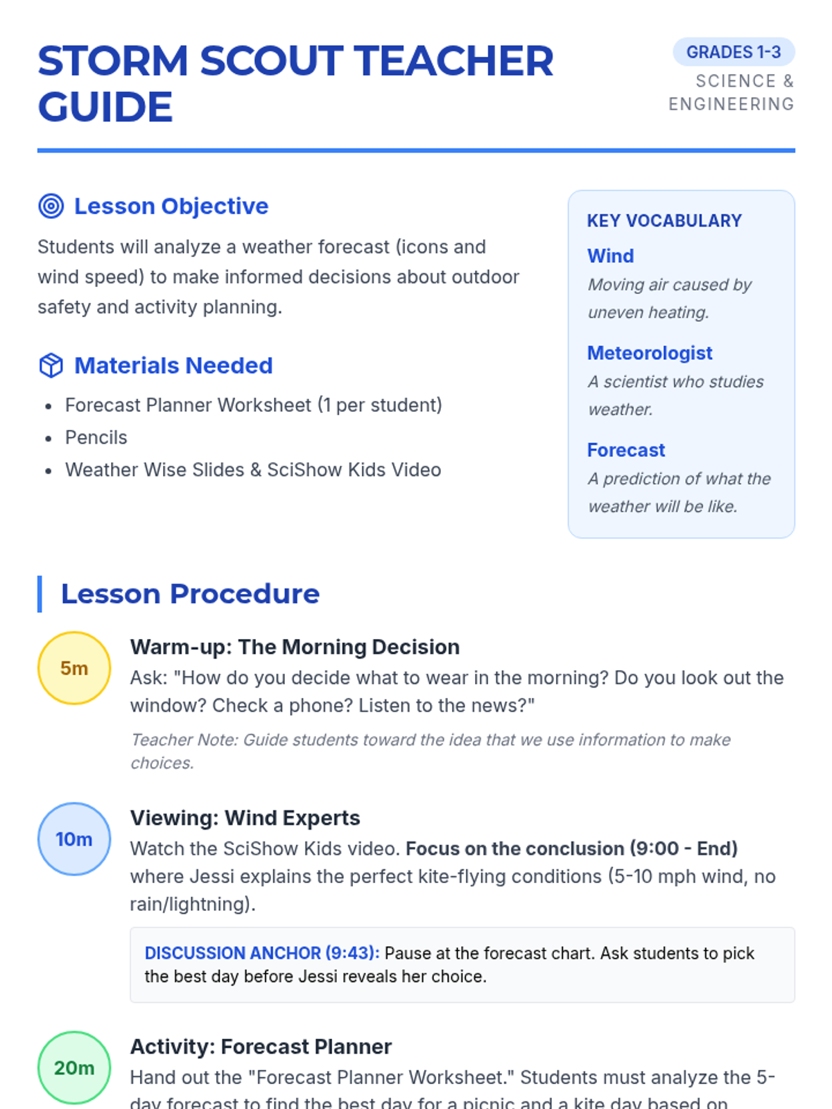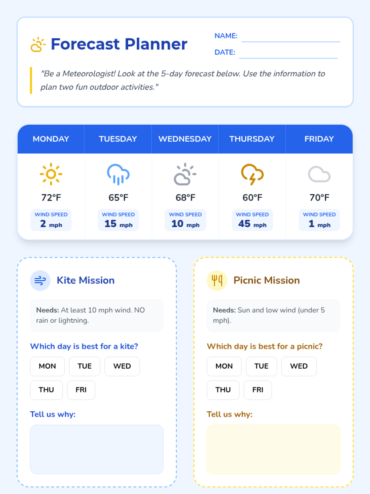 A primary science lesson teaching students how to interpret weather forecasts and wind speeds to plan outdoor activities like kite flying and picnics.